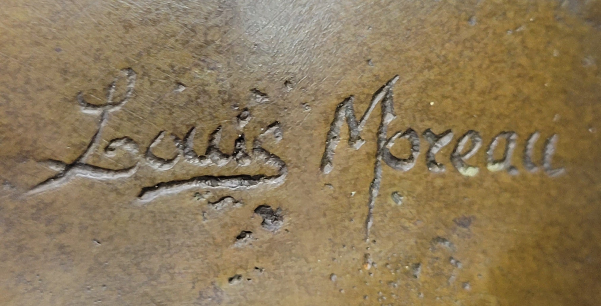 Handmade and crafted using the time-honored "Lost Wax Method," this vase is a testament to the artisan's skill and dedication to preserving every intricate detail. It is a perfect gift for flower lovers and art enthusiasts alike, exuding an air of elegance and sophistication. The vase is signed by the esteemed artist Moreau, making it a collectible piece that invites admiration and appreciation.Bronze Dimensions with Marble Base: Height 12.5" X Width 8"