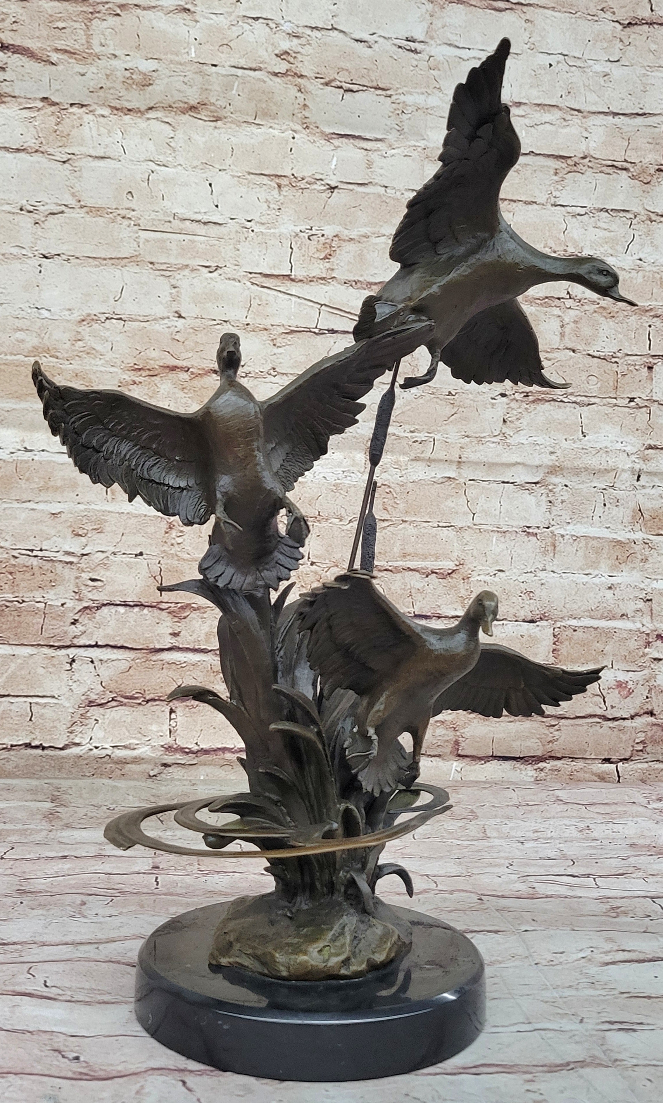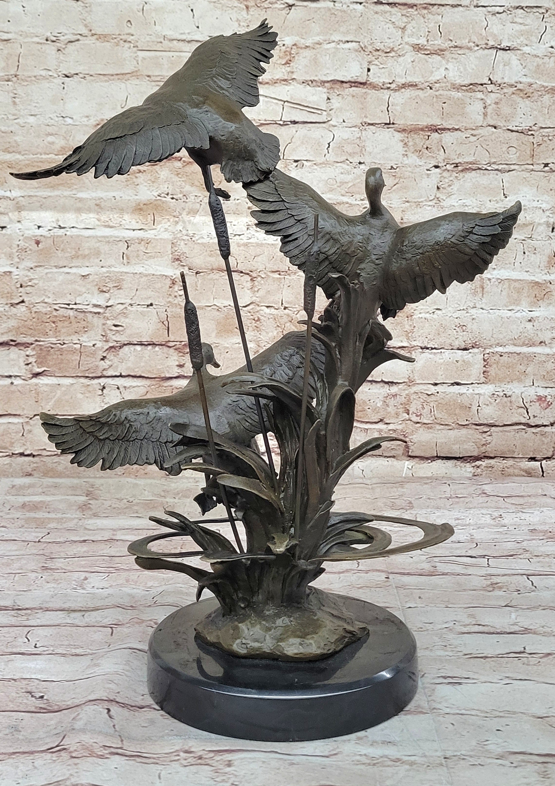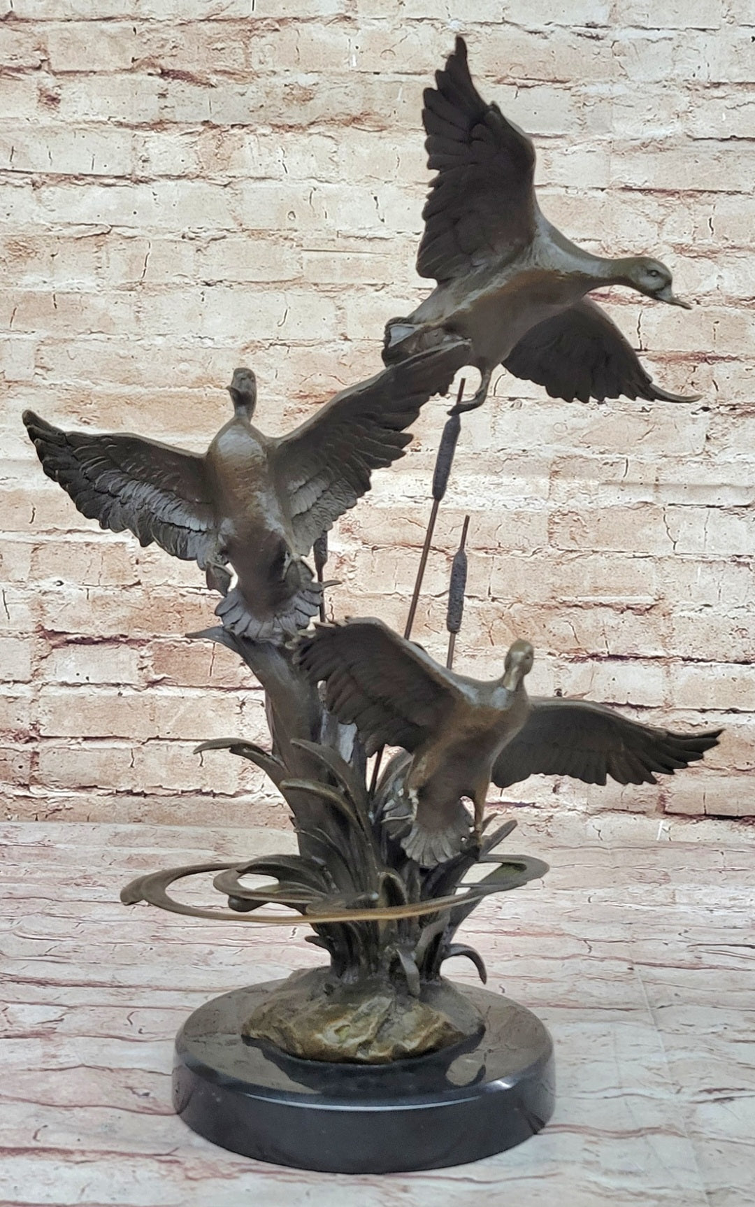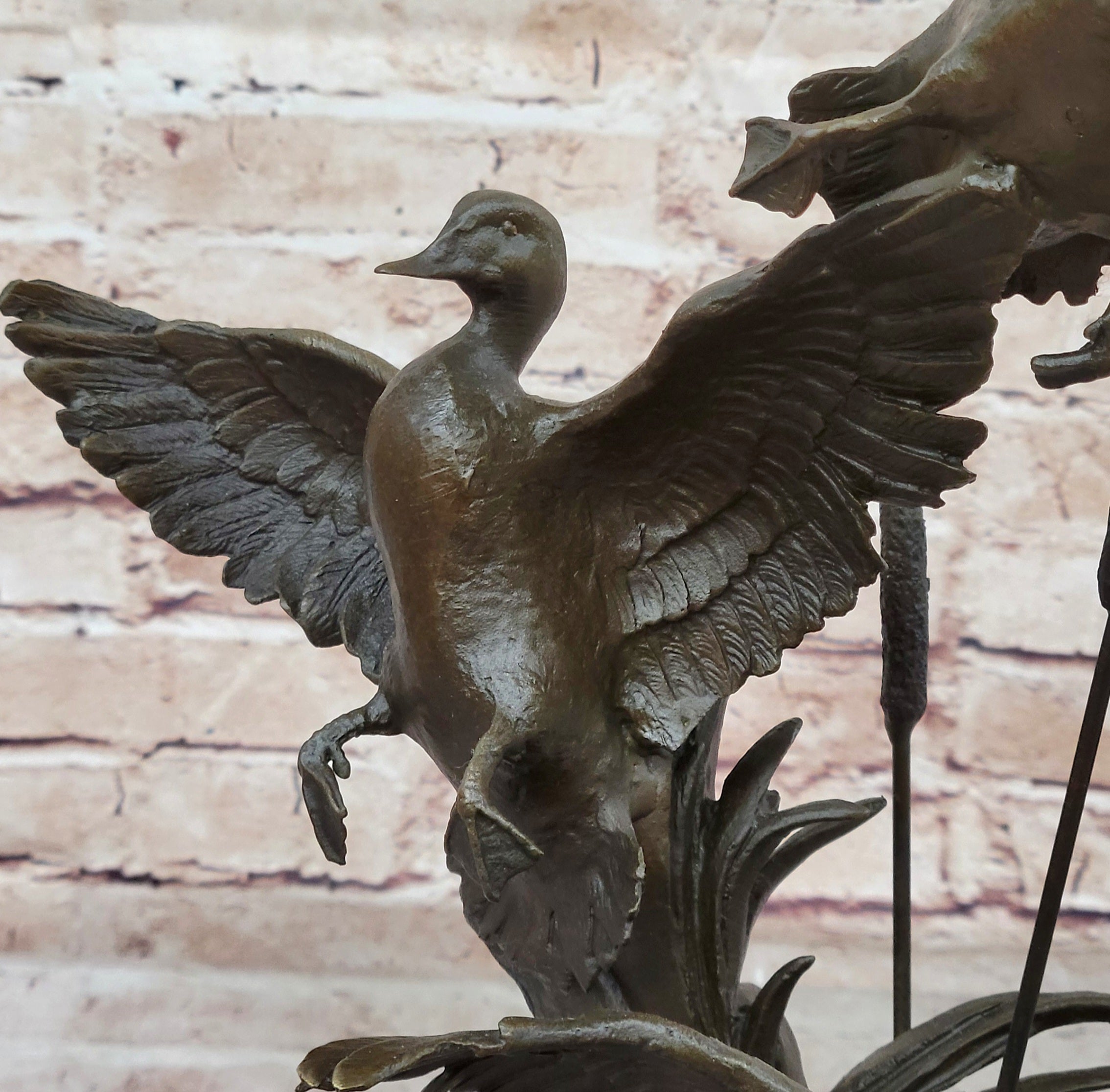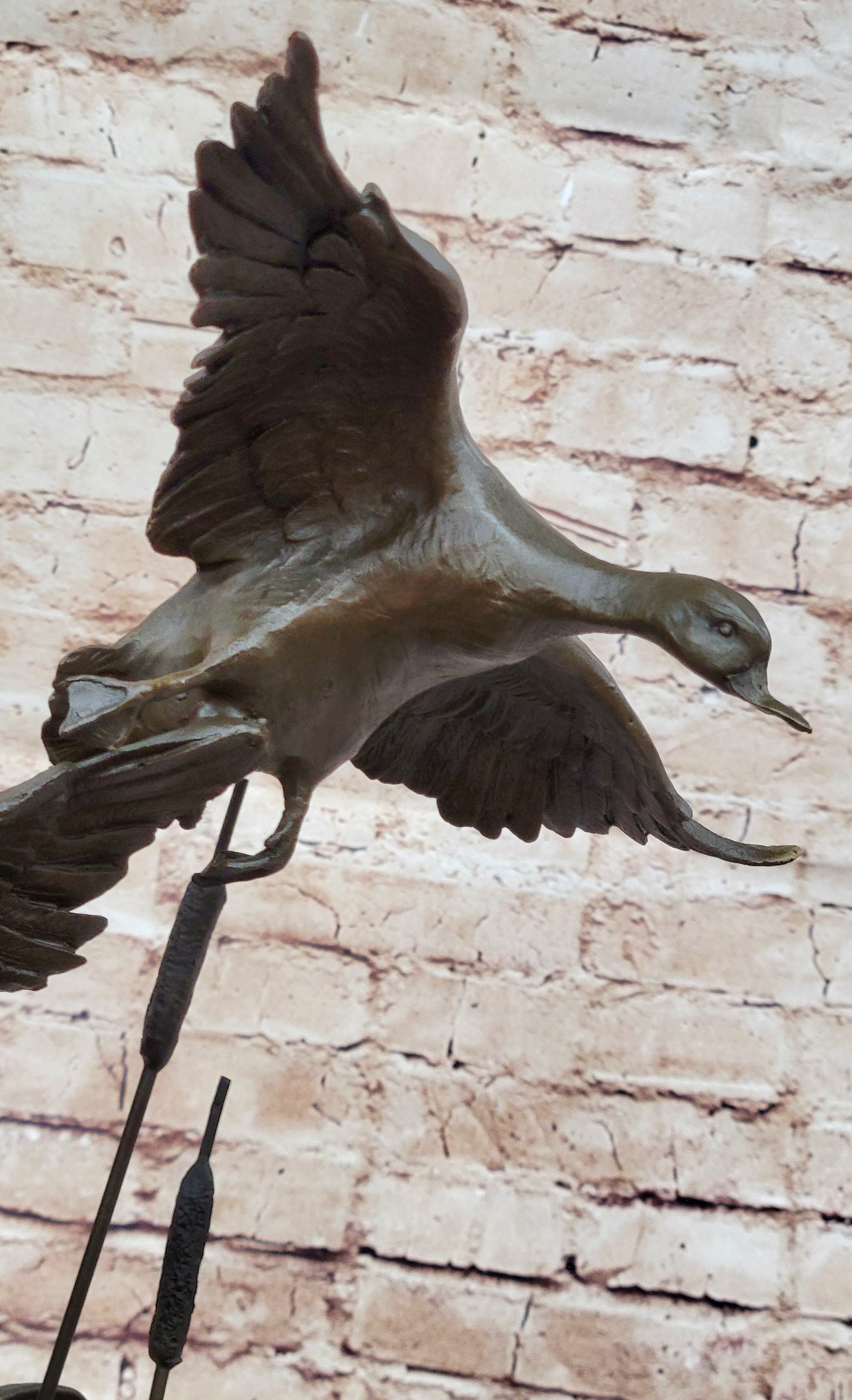 Flying Ducks in the Reeds Bronze Sculpture Statue Wildlife Decor on Marble Base