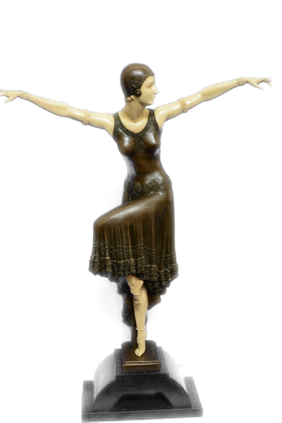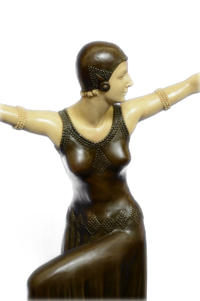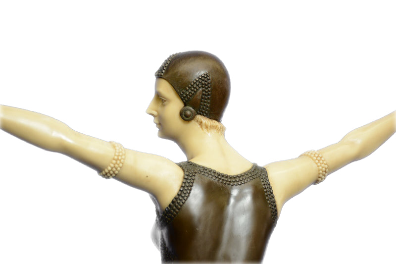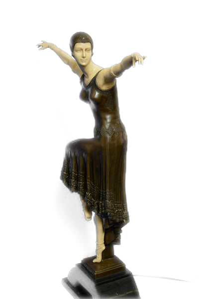 Chiparus` Female Dancers are among the most popular bronze Art Deco sculptures. Therefore, this sculpture of a dancer from the Twenties is characteristic of D. H. Chiparus` artistic work. However, the artist turns away from the often rather linear design of his motives and creates a playful, but in its details rather elaborate Art Deco sculpture of a graceful dancer. The surface quality of her dancing suit has an opulent effect on the otherwise delicate overall appearance. Her face and hands are designed in an ivorylook, suspending the static impression of the bronze and bringing an air of liveliness into the sculpture. The production of our bronze statues is subject to strict quality guidelines. Our whole selection of bronze statues and figurines has been produced by using the lost wax technique and has been cast by hand. Therefore, we can guarantee you a high standard of quality when you are shopping online for our exclusive Art Deco figures at Bronze Shop. D. H. Chiparus, born 16 September 1886 in Romania, spent most of his life in Italy and Paris. His works were produced under the heavy influence of the French theatre, fashion, dance, and a love for Egyptian culture. Part of his work are numerous Art Deco figures, e.g. the famous Chryselephantines. The artist, whose full name was Demetre Haralamb Chiparus, died 22 January 1947 in Paris, where he had worked as a sculptor and ceramist. Nowadays, the largest collection of D. H. Chiparus` originals is located in Moscow, where it can be visited at the Art Deco Russian House. The observer will notice that the artist`s sculptures reflect the time of Art Deco in a rather breathtaking way.Original or Reproduction: Reproduction