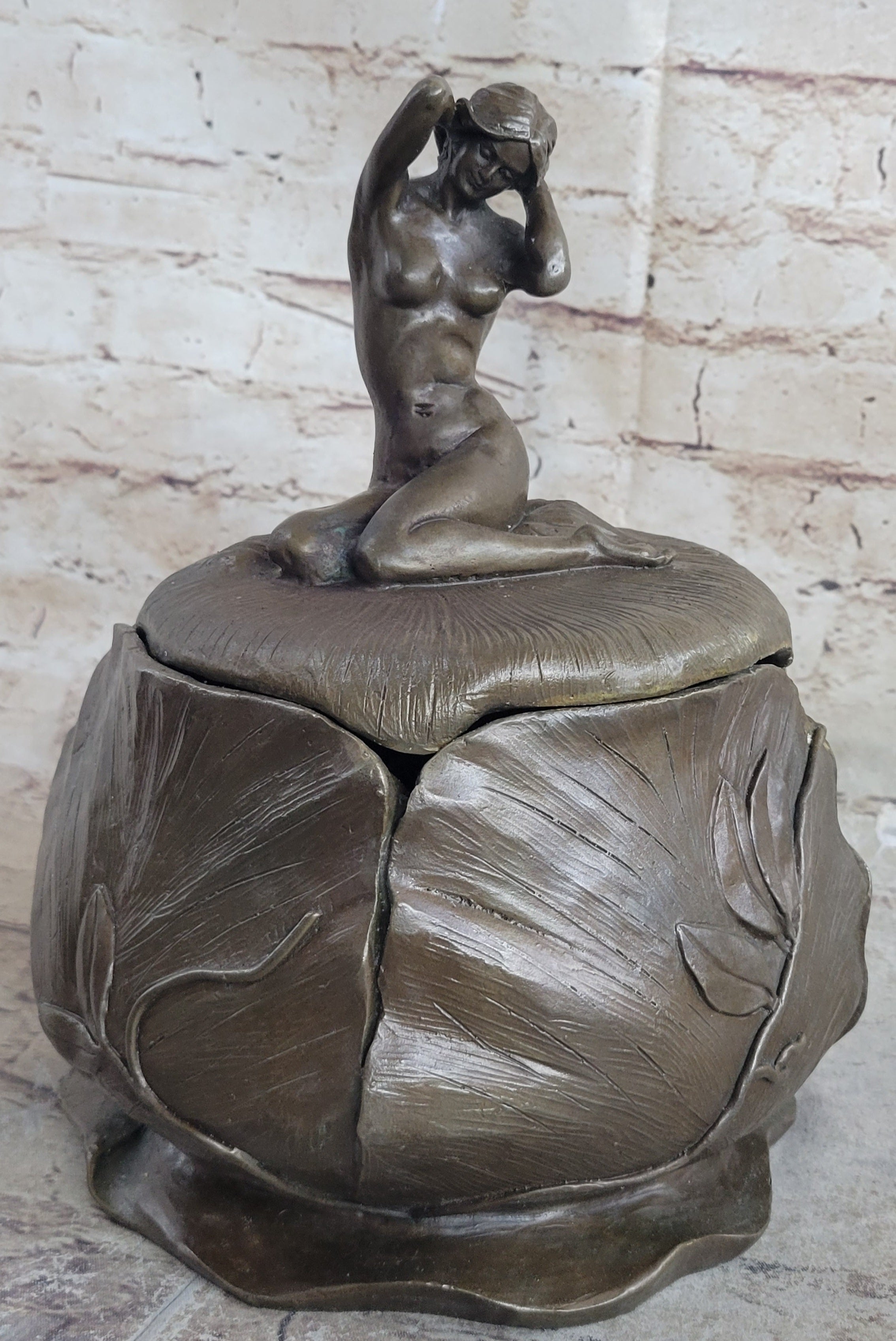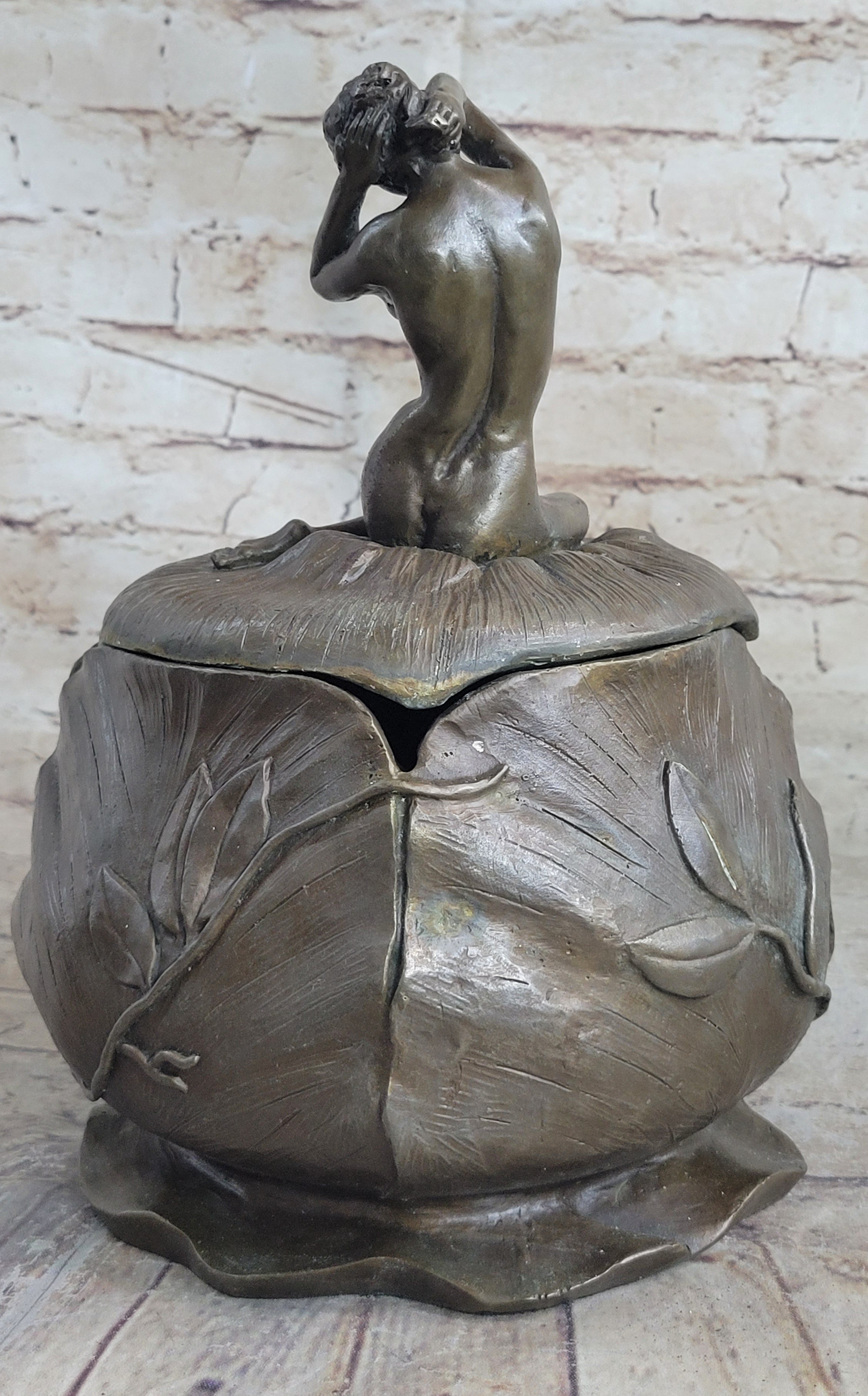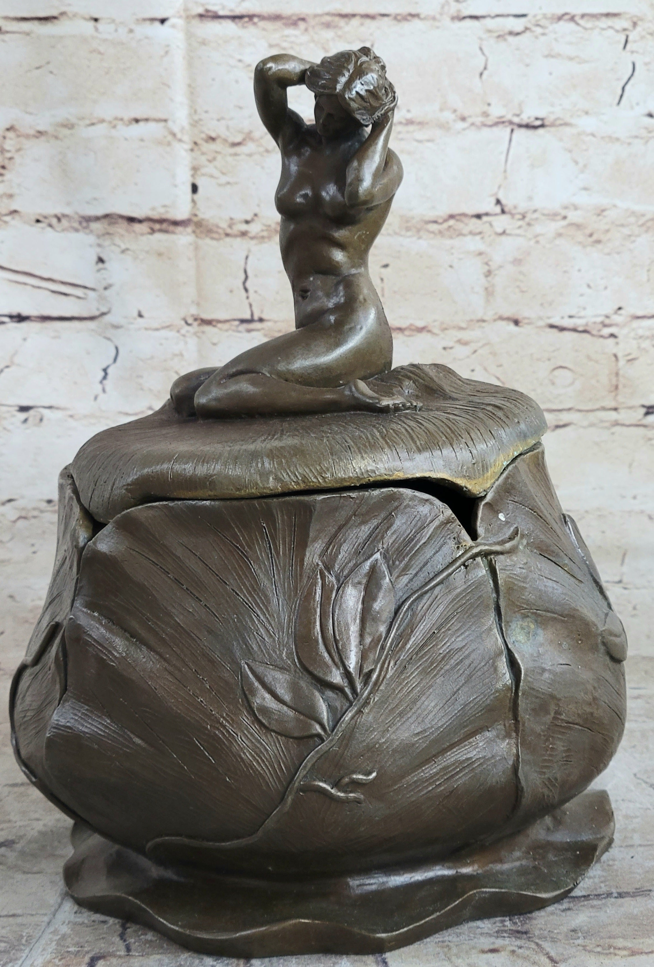 A French Art Nouveau hand crafted bronze Bowl or Jewelry by Maurice Bouval formed from a female nude perched delicately next to a blossom, designed to house your valuable. With her hands the woman is gently pulling back her hair, inviting the viewer to partake of the its riches. She is seated upon a bed of leaves which partially cover her nude bodyBronze Dimensions :Height 10" x Width 7"