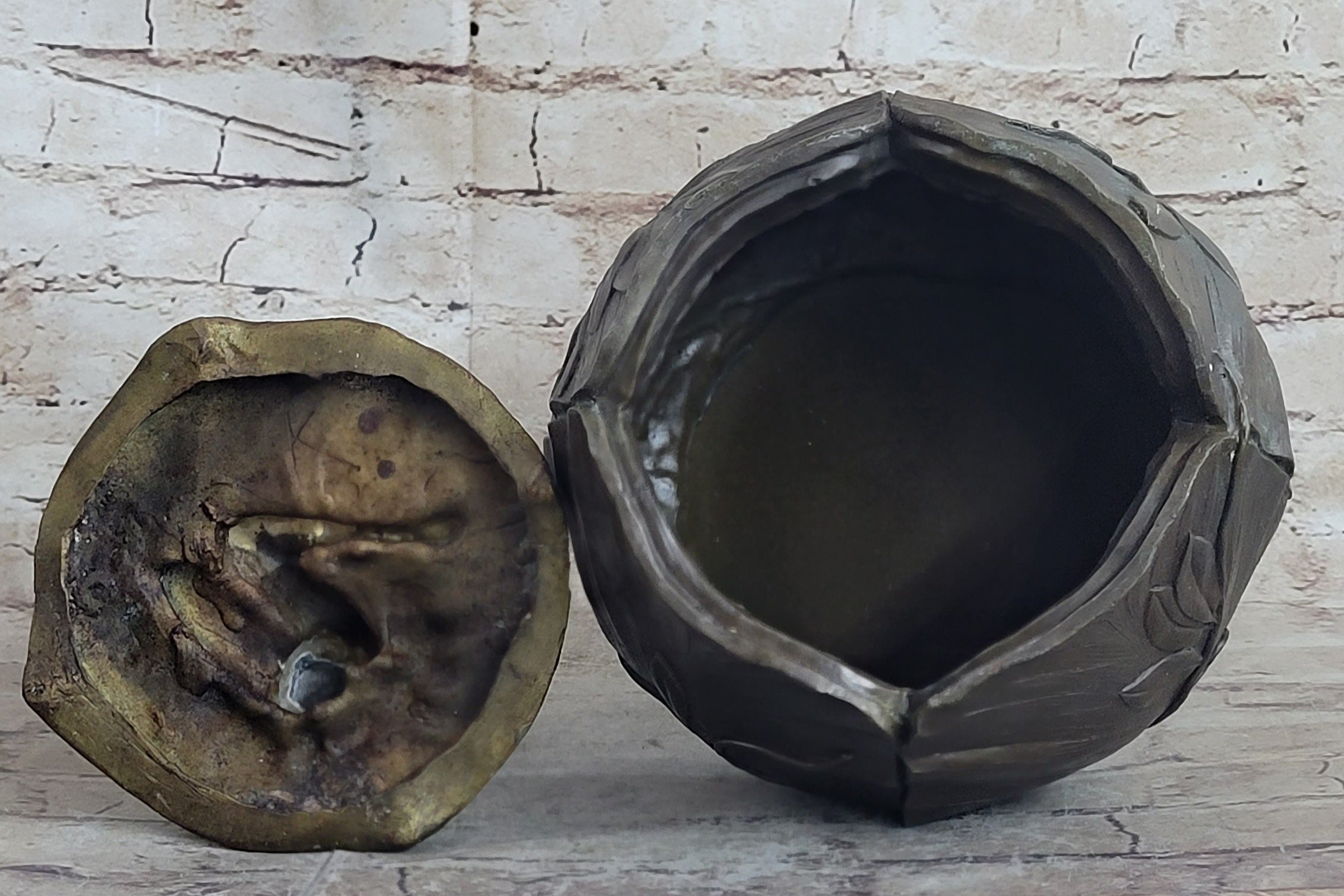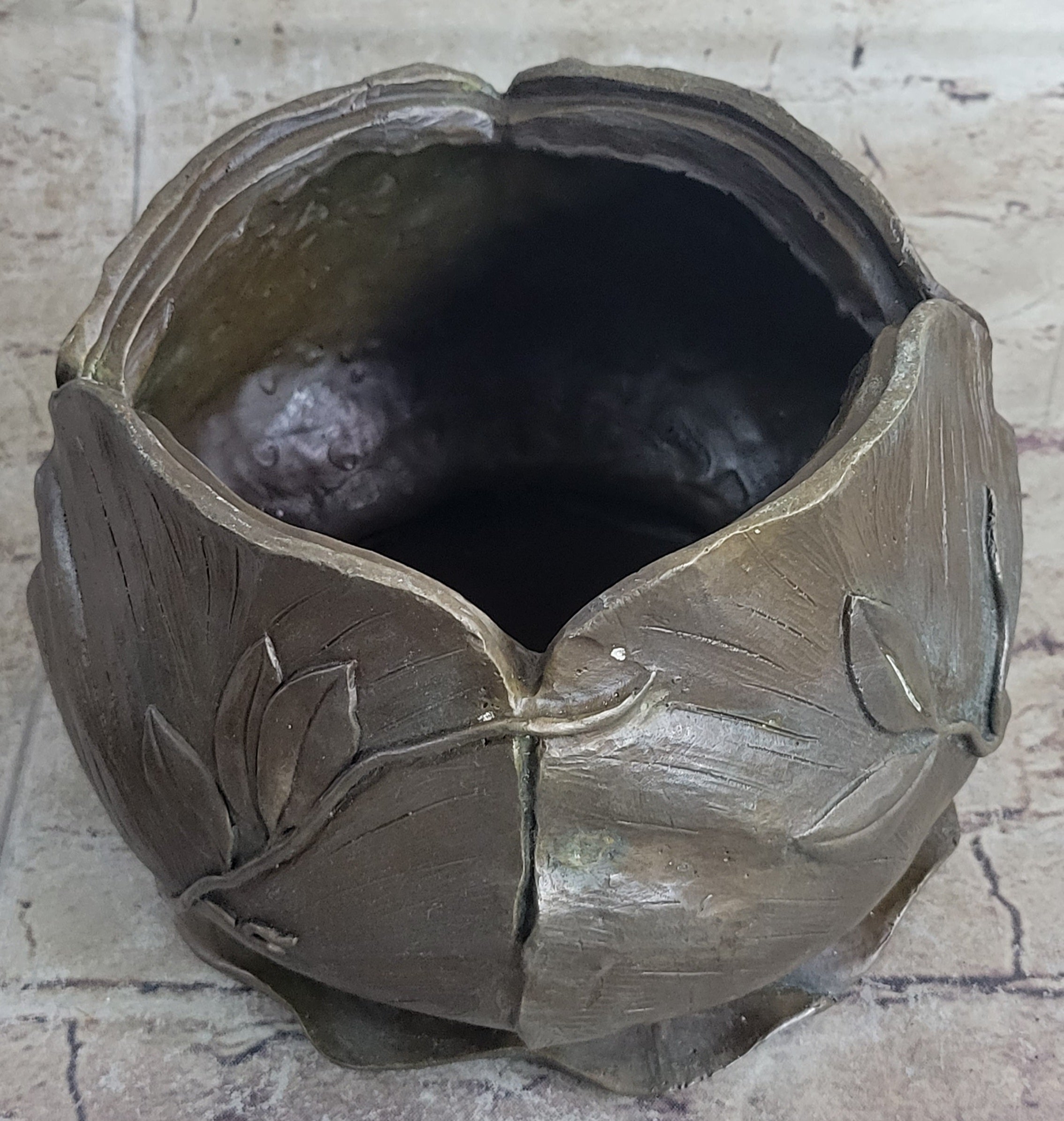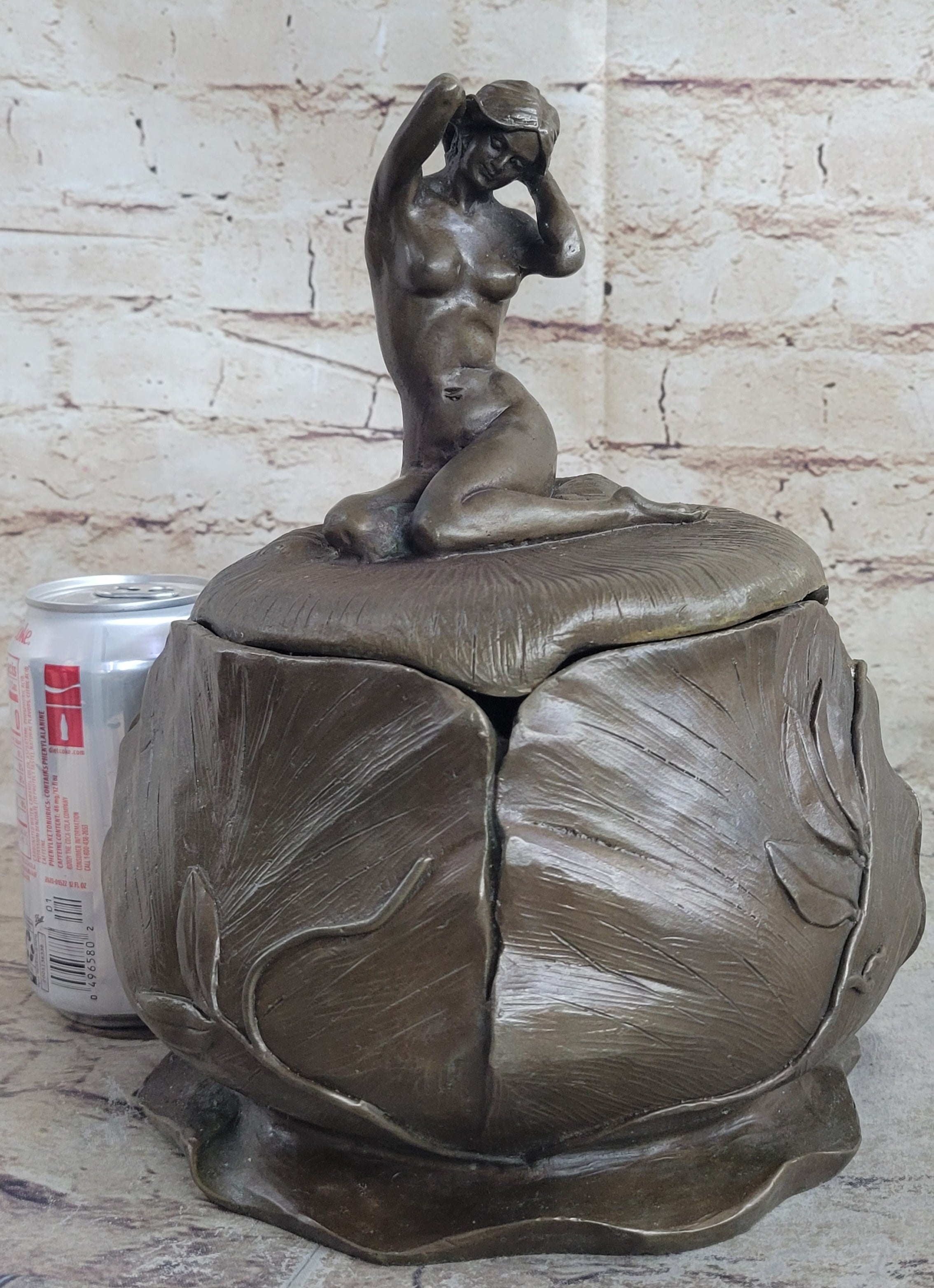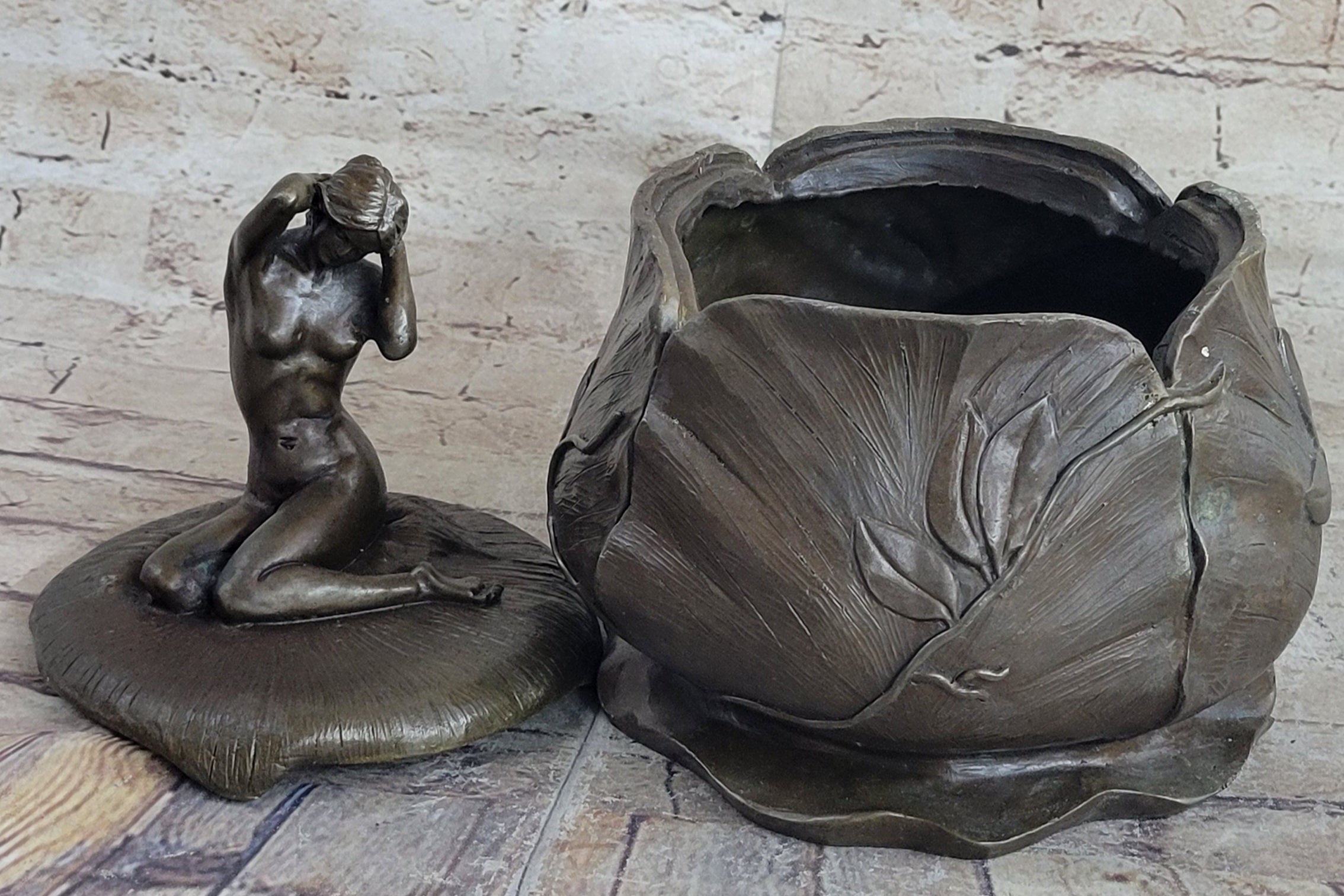 A French Art Nouveau hand crafted bronze Bowl or Jewelry by Maurice Bouval formed from a female nude perched delicately next to a blossom, designed to house your valuable. With her hands the woman is gently pulling back her hair, inviting the viewer to partake of the its riches. She is seated upon a bed of leaves which partially cover her nude bodyBronze Dimensions :Height 10" x Width 7"