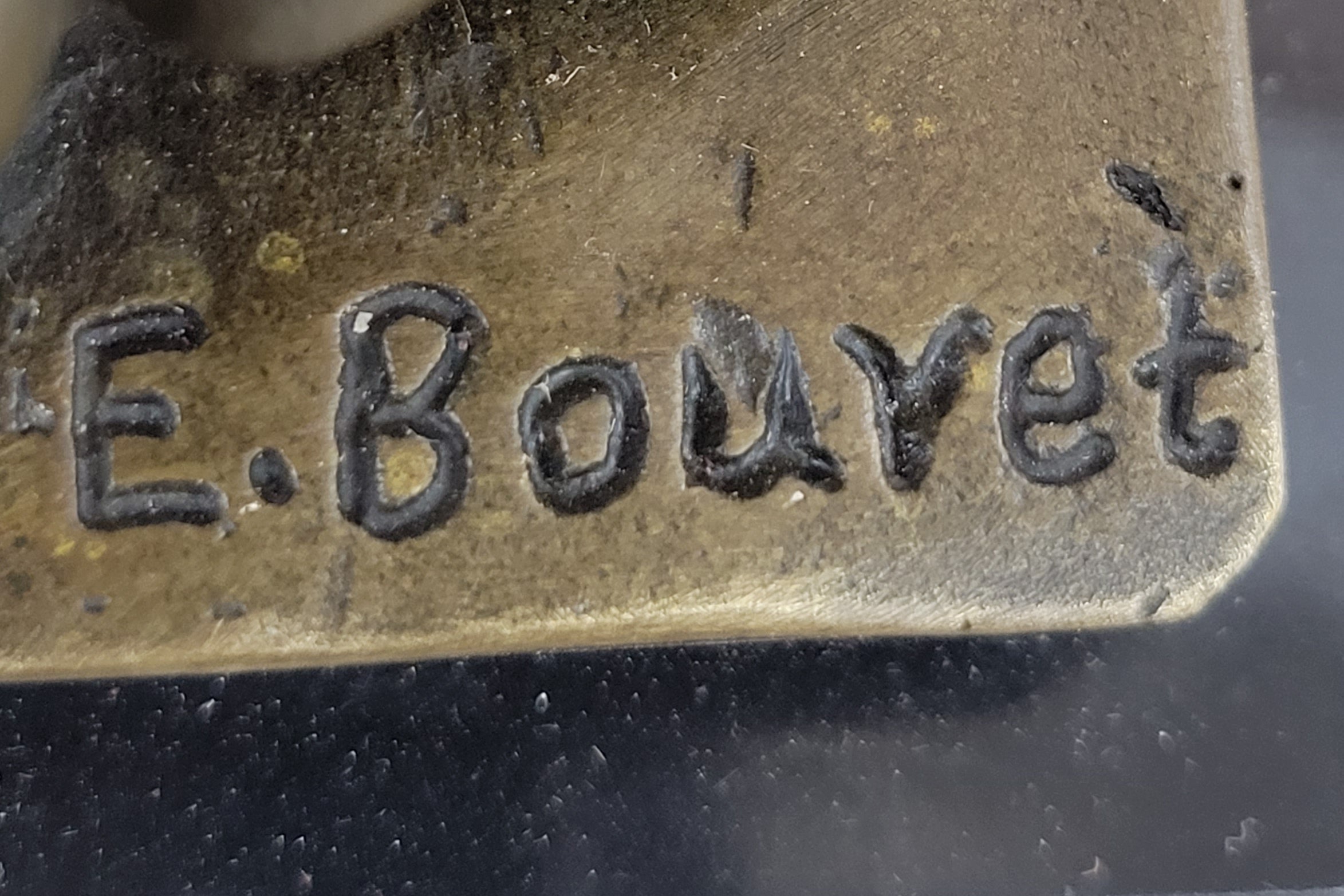 Mounted on a round black marble base, the sculpture stands as a testament to Bouret's artistic skill and vision. The base provides a stable and elegant foundation for the artwork, enhancing its visual appeal. The sculpture bears the signature of Eutrope Bouret, further adding to its quality and value as a collectible piece.