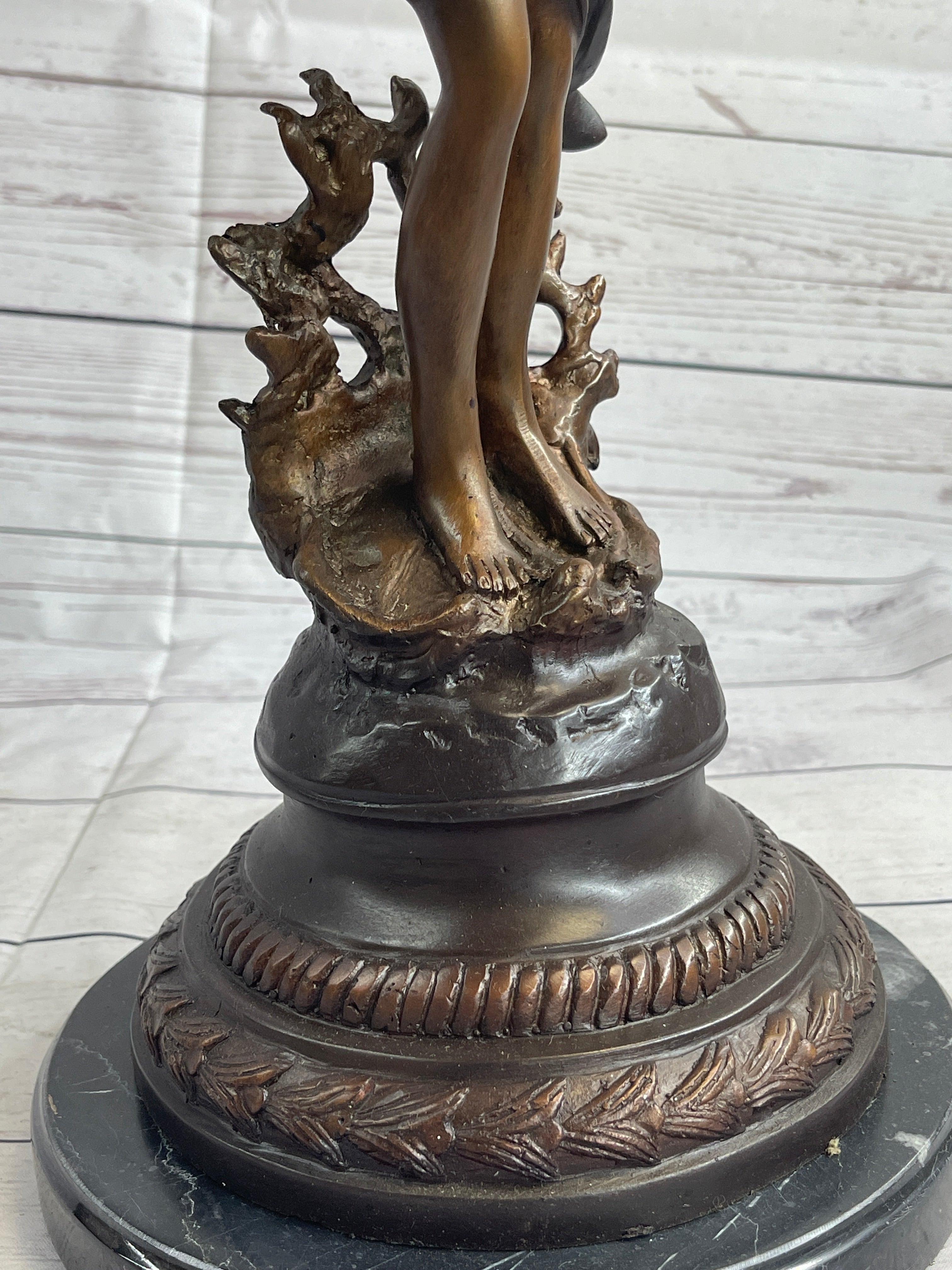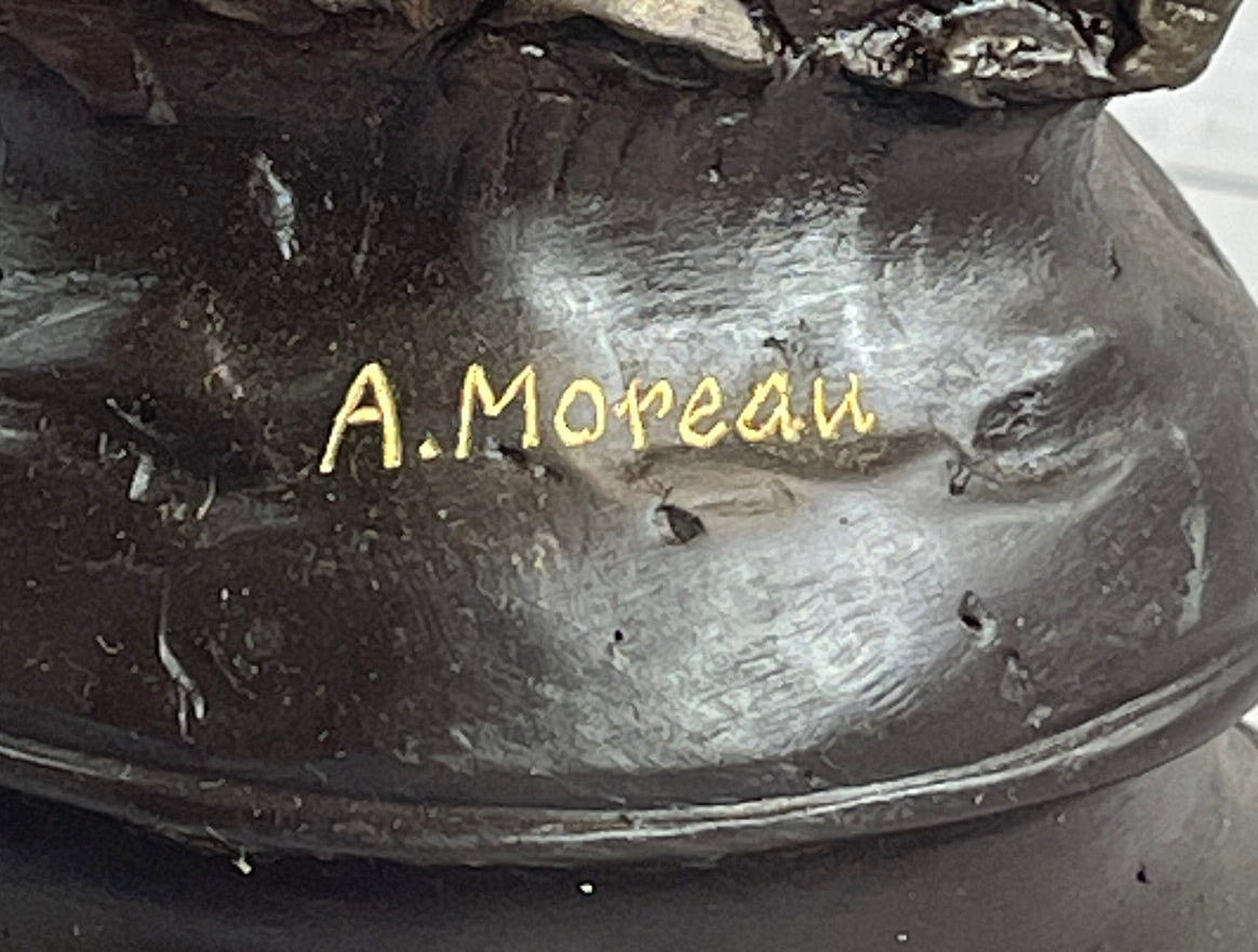 The candelabra itself is a masterpiece of intricate design, reflecting the artistry and craftsmanship that defines the entire piece. This exquisite sculpture, complete with a vintage rustic patina finish, embodies the essence of timelessness, hinting at the passage of years while retaining its enduring allure. For those seeking a harmonious pair, an additional option includes a companion statue featuring a young woman holding a candelabra. Her elegant posture and graceful demeanor create a striking complement to the boy's steadfast presence, forming a captivating set that captures the beauty and grace of classical art. Crafted from 100% bronze and signed by the renowned artist A. Moreau, this sculpture stands as a testament to the enduring legacy of classical artistry and craftsmanship.Bronze Dimensions with Marble Base: Height 26.5" X Width 8"