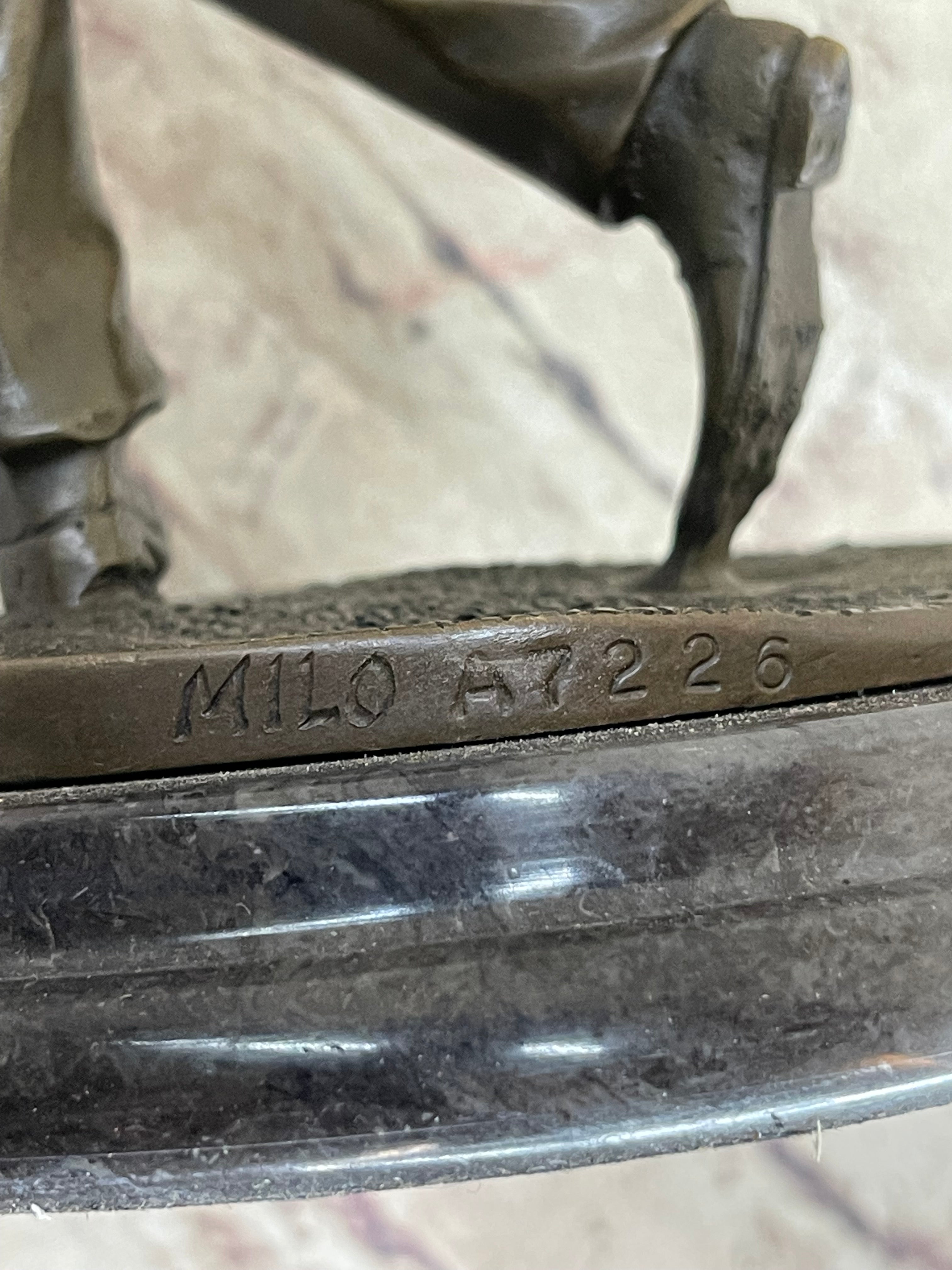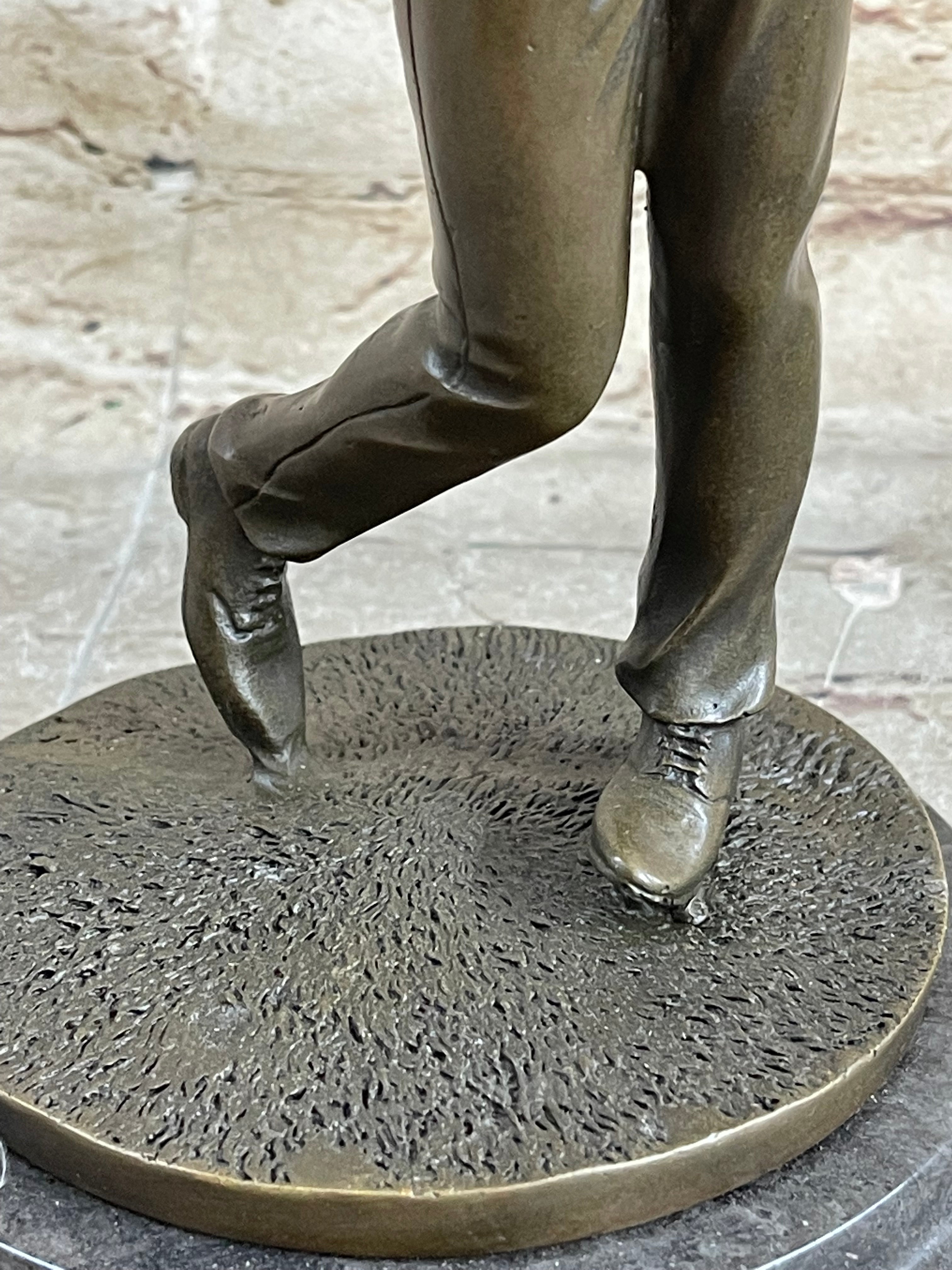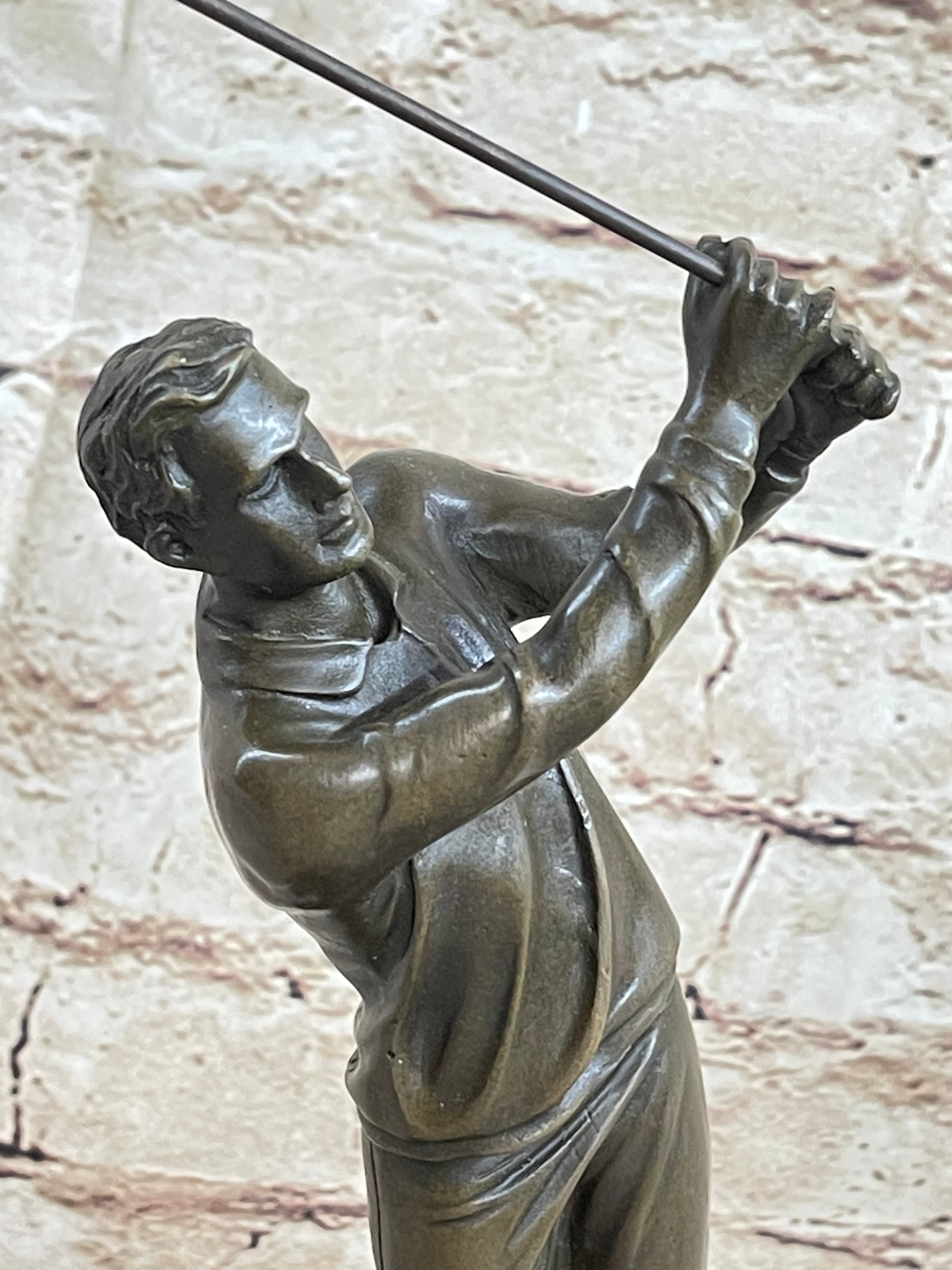 A golfer tilts his head up to the sun and watches his ball rise. He hold his form and stance, tracking the position of the ball and how close to the green it may land. His body twist with his stroke. In his head he counts the strokes he may need if it doesn`t land on the green and how many he may need if it does. He silently prays that it doesn`t land in a sand trap or near a water hazard. Though the crowd has already begun to erupt in an uproar, he knows it`s too soon for celebration. The ball is left to the wind. He is a brown patina with shading to accent the movement of his clothes. This original 100% bronze sculpture was cast using the "Lost Wax Method" and was handmade, then mounted on a marble base and is signed by artist Milo.Bronze Dimensions with Marble Base: Height 11" x Width 4"
