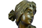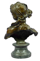 This piece is a bust of a forlorn maiden. The details of this piece have been crafted in an extraordinary way that allowed Gerome to truly bring it to life. The girl rests her head to the side in deep thought, possibly thinking about her long lost love. She has her head wrapped in a manner that only allows a few strands of her hair escape, thus drawing more attention to the beauty of her face. We only catch a glimpse of the garment that she is wearing, but from off the shoulder shape of her bodice, one can deduce that her dress is just as gorgeous and flowing as the flowing lines created by the draping of her scarf, hair, and exposed neck. This is the epitome of what it means to find beauty in simplicity. Cast in bronze, set atop a black marble base. Signed "J. Gerome." This piece is a must-have that will surely be treasured for years to come, featuring the lost wax method of casting, founded thousands of years ago ensuring an exquisitely detailed sculpture that will add grace and beauty to your business or home.Bronze Dimensions with Marble Base:Height 14" x Width 9"