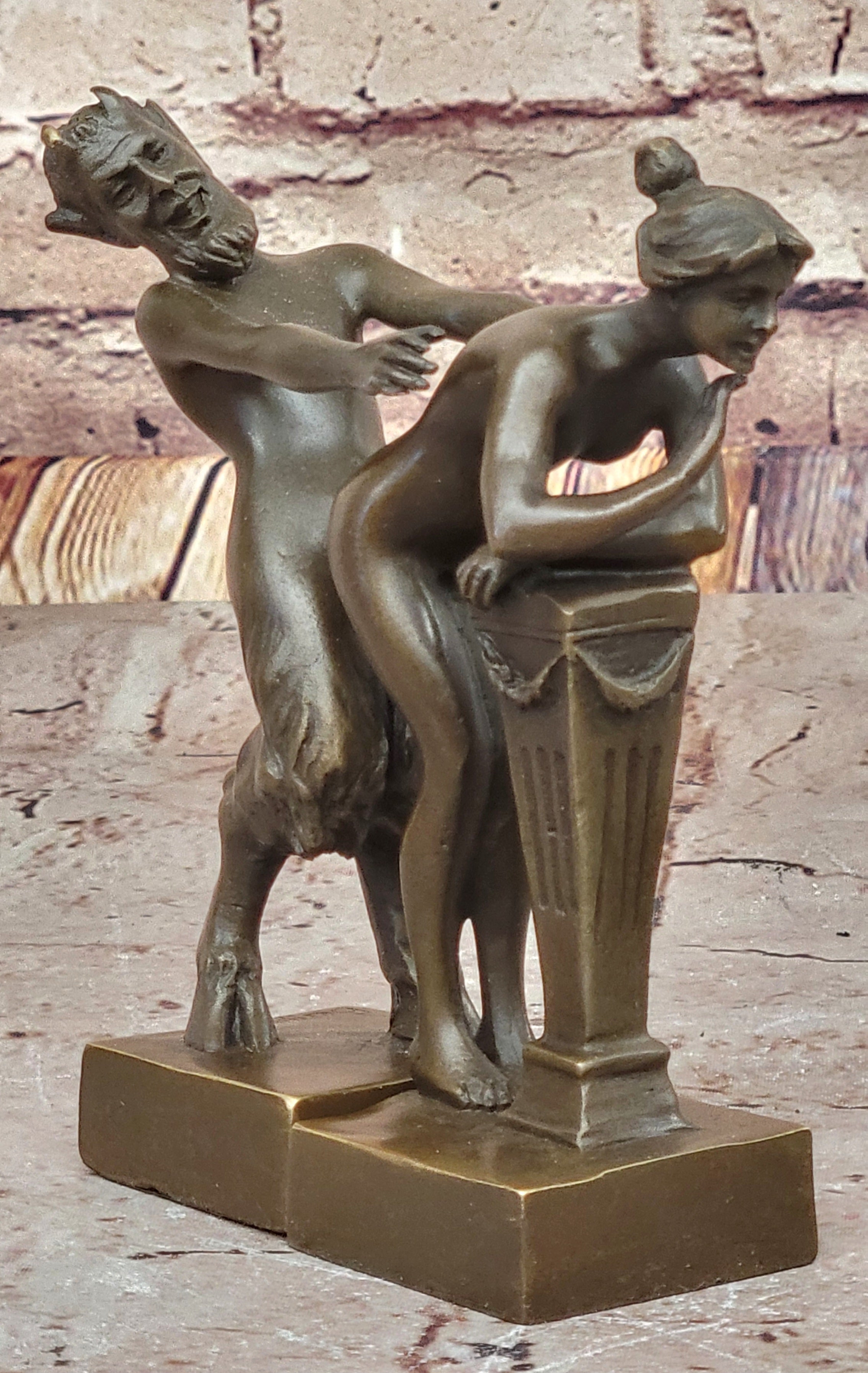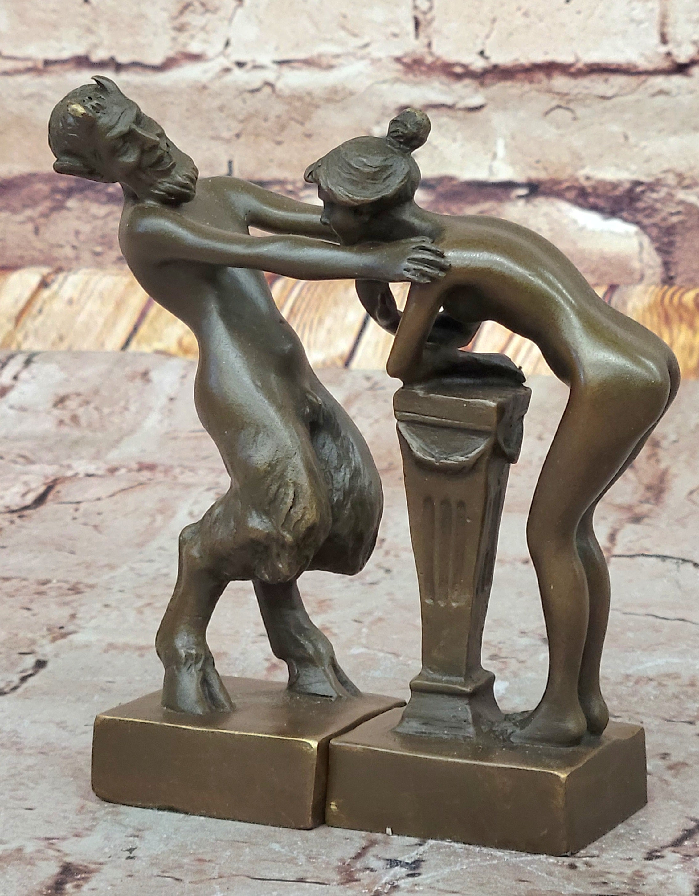 Greek Faun Satyr & Nymph Girl Erotic Nude Bronze Bookend Sculpture Figures