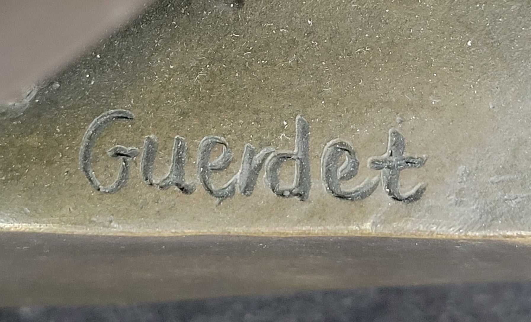 Mounted on a black marble base, this sculpture not only serves as a decorative piece but also functions as a mantle clock, adding functionality to its artistic allure. Signed by the skilled artist Guerdet, this masterpiece is a testament to the fusion of art and functionality, making it a captivating centerpiece for any mantle or space.Bronze Dimensions :Height 28" X Width 18"