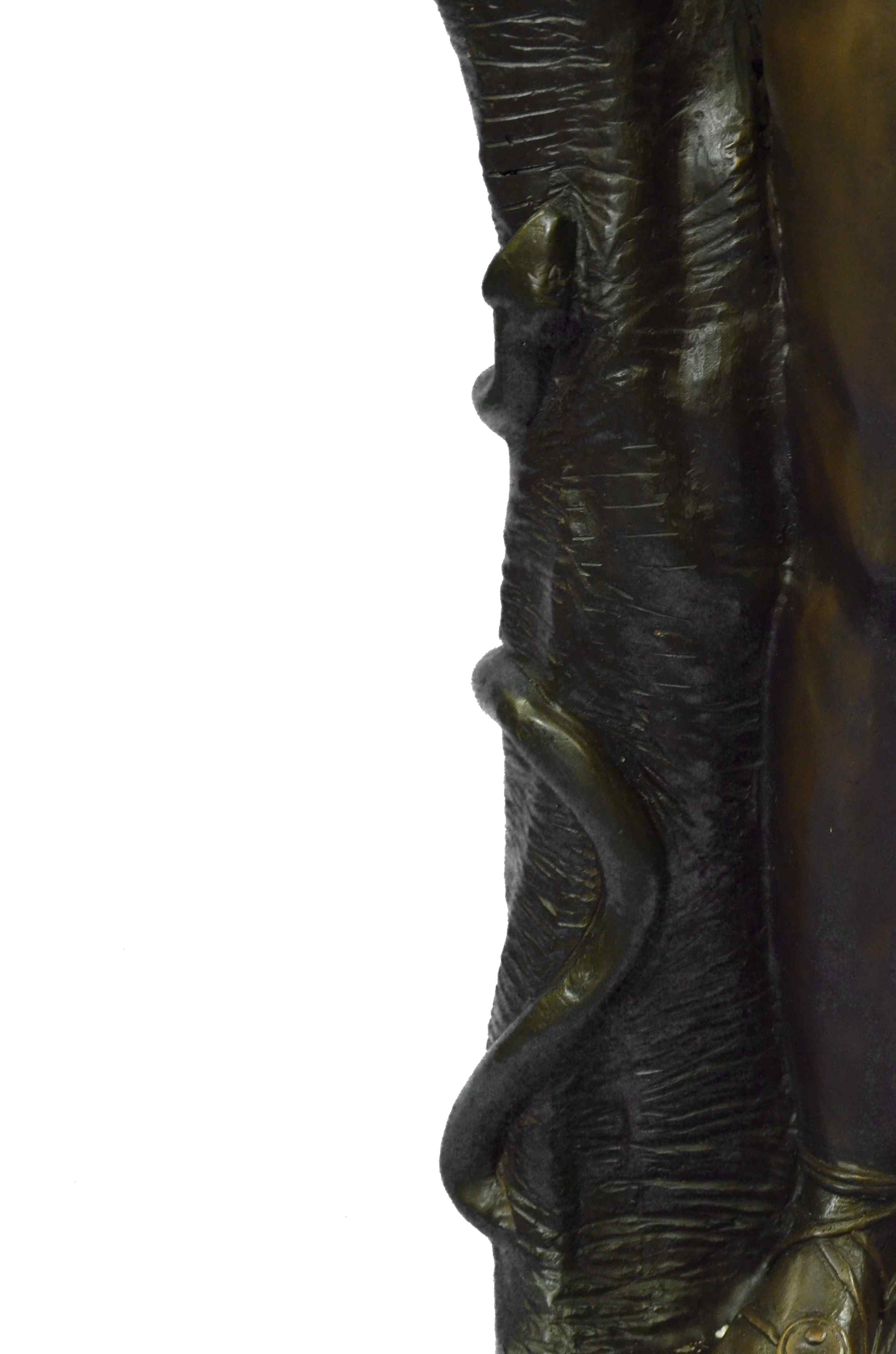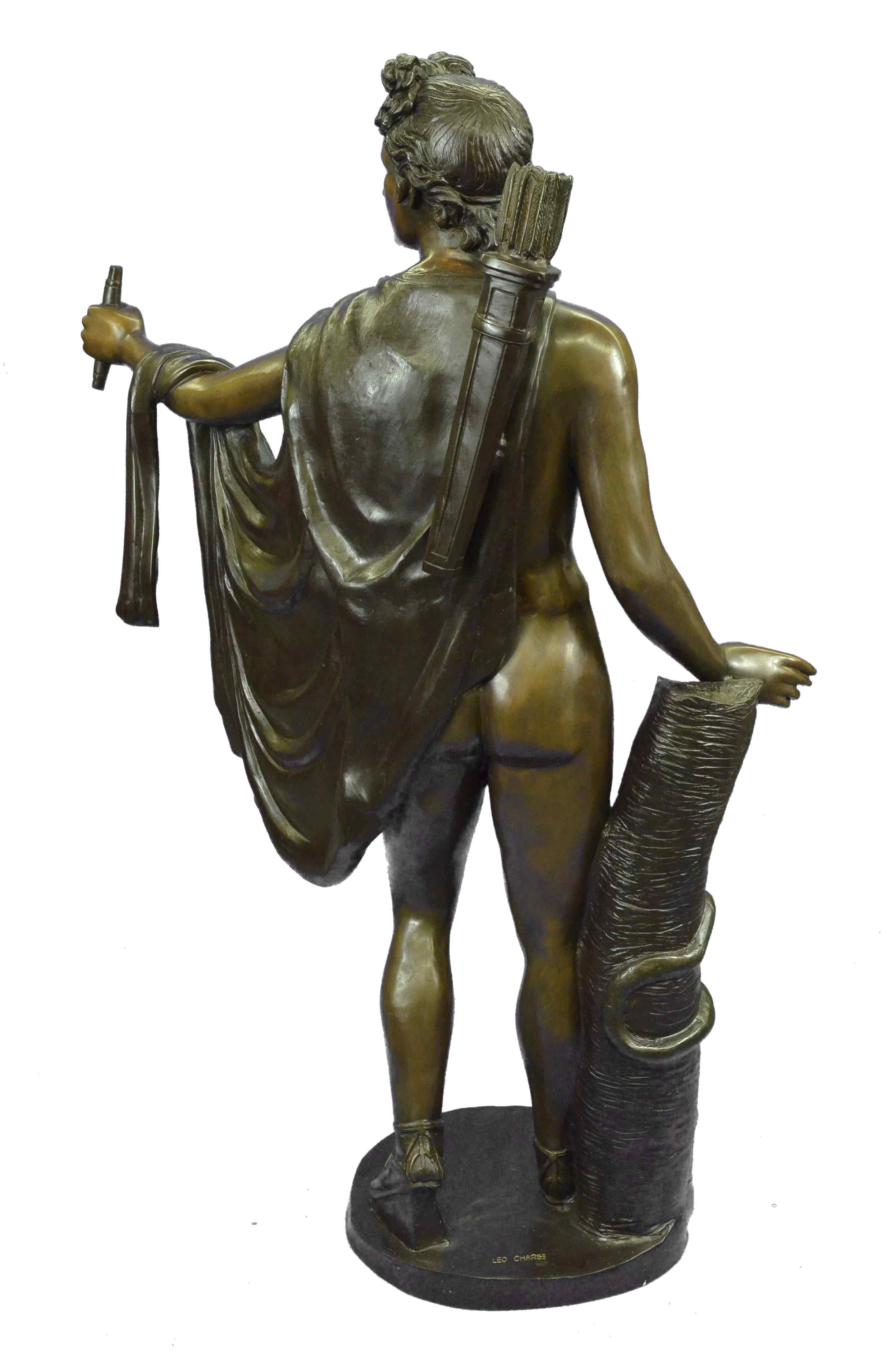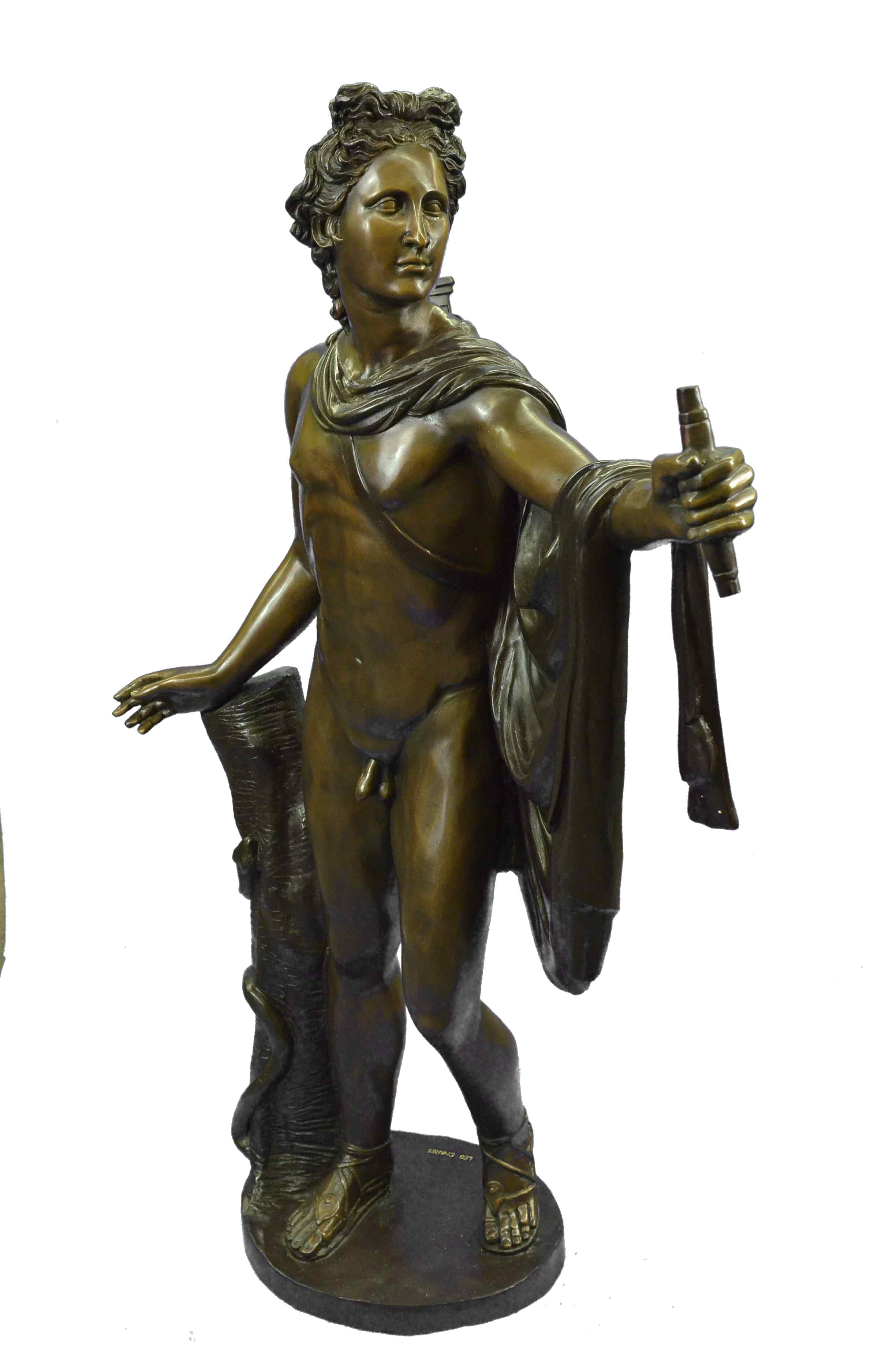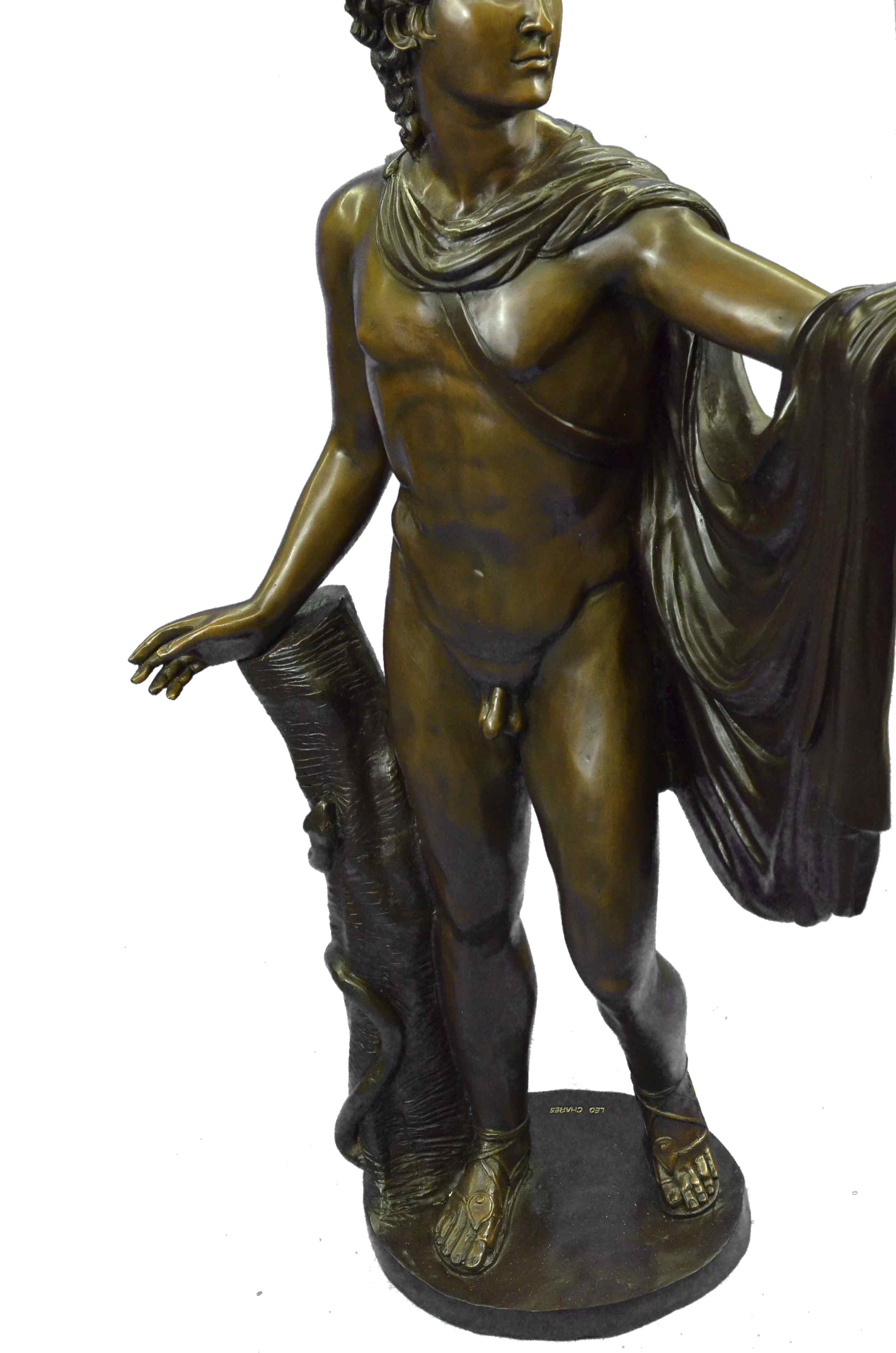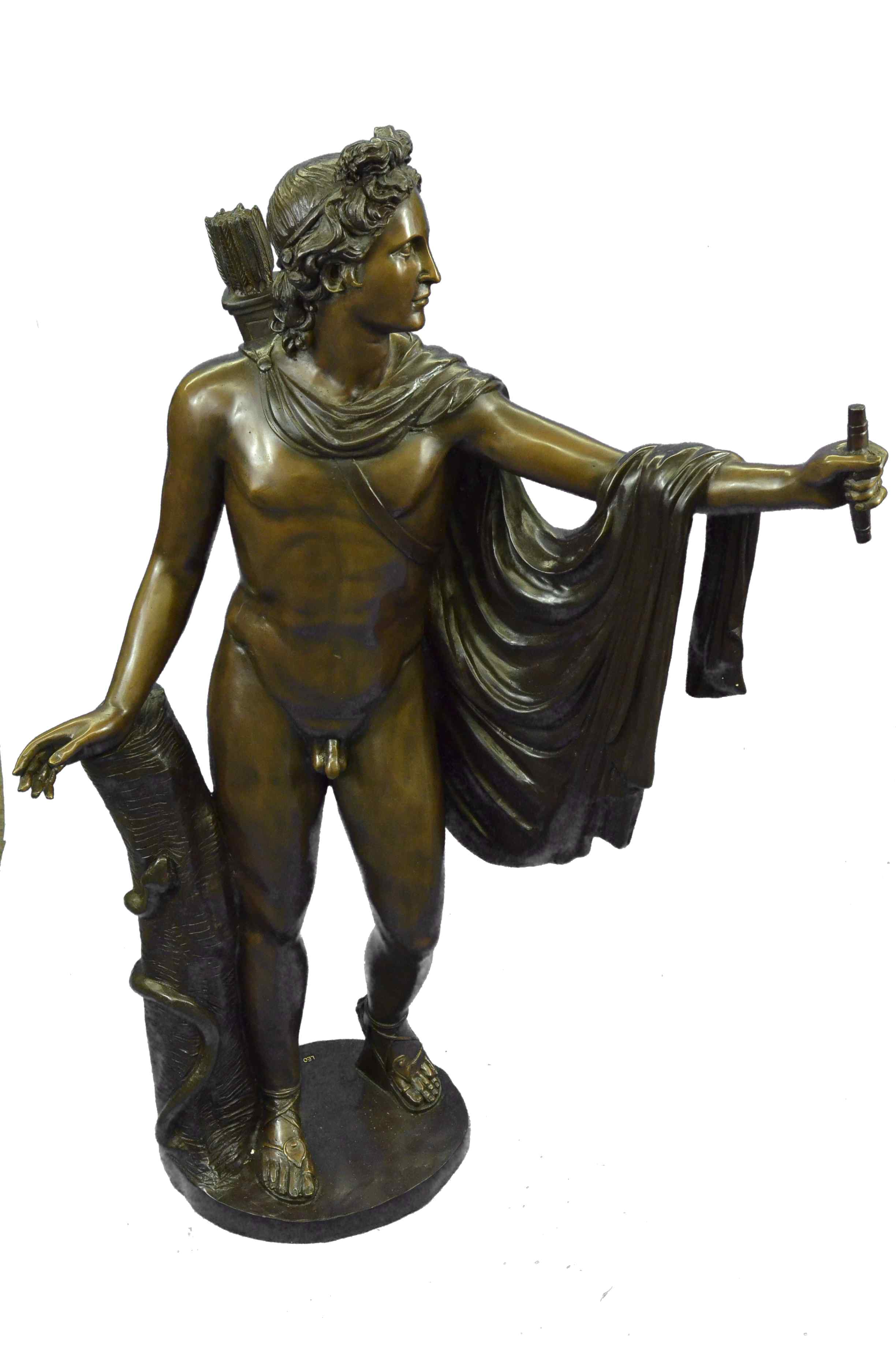 This famous classic bronze statue, was discovered in ruins of Pompey`s theater near Rome in the late 1400`s, and believed to be a Roman copy of the Greek sculptor, Leochares` original bronze statue. Once in the private collection of Pope Julius II, it was moved to the Vatican in 1509 and placed in the Cortile del Belvedere, from which it derives its name. Our bronze Apollo statue is rife with fine detail from the draped robe (chlamys) to the sandaled feet. This hand crafted French Bronze fully restored rendition of Apollo, has just overtaken the serpent Python, and just released an arrow from his bow. The effort impressed on his musculature still lingers. Apollo represents harmony, order, and reason and was considered the greatest ancient sculpture and for centuries epitomized ideals of aesthetic perfection for Europeans and westernized parts of the world. This weighty Design bronze sculpture is hand rubbed in a multi-toned finish to showcase the finely muscled body of this classic statue of male beauty and this rendition is timeless.Original or Reproduction: Reproduction