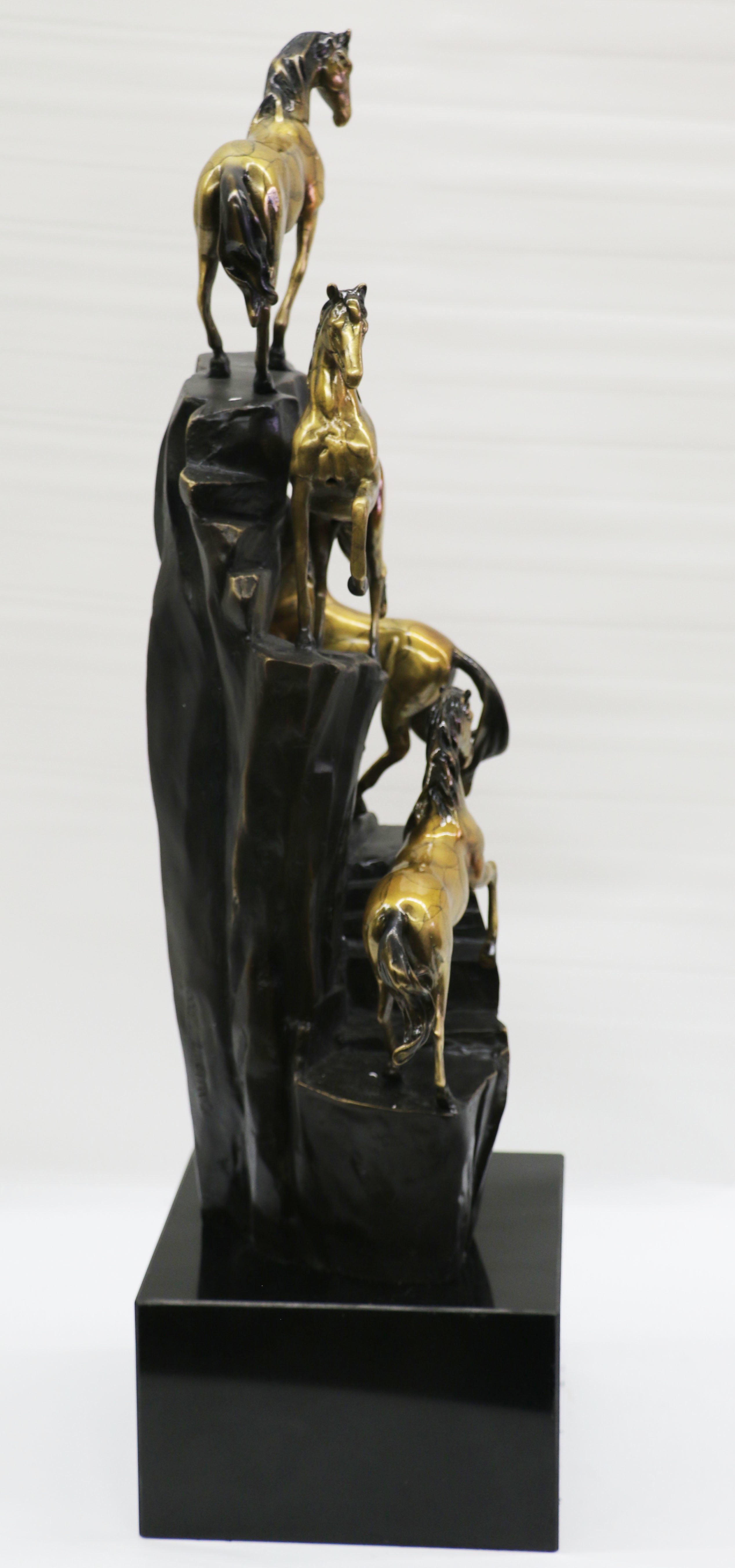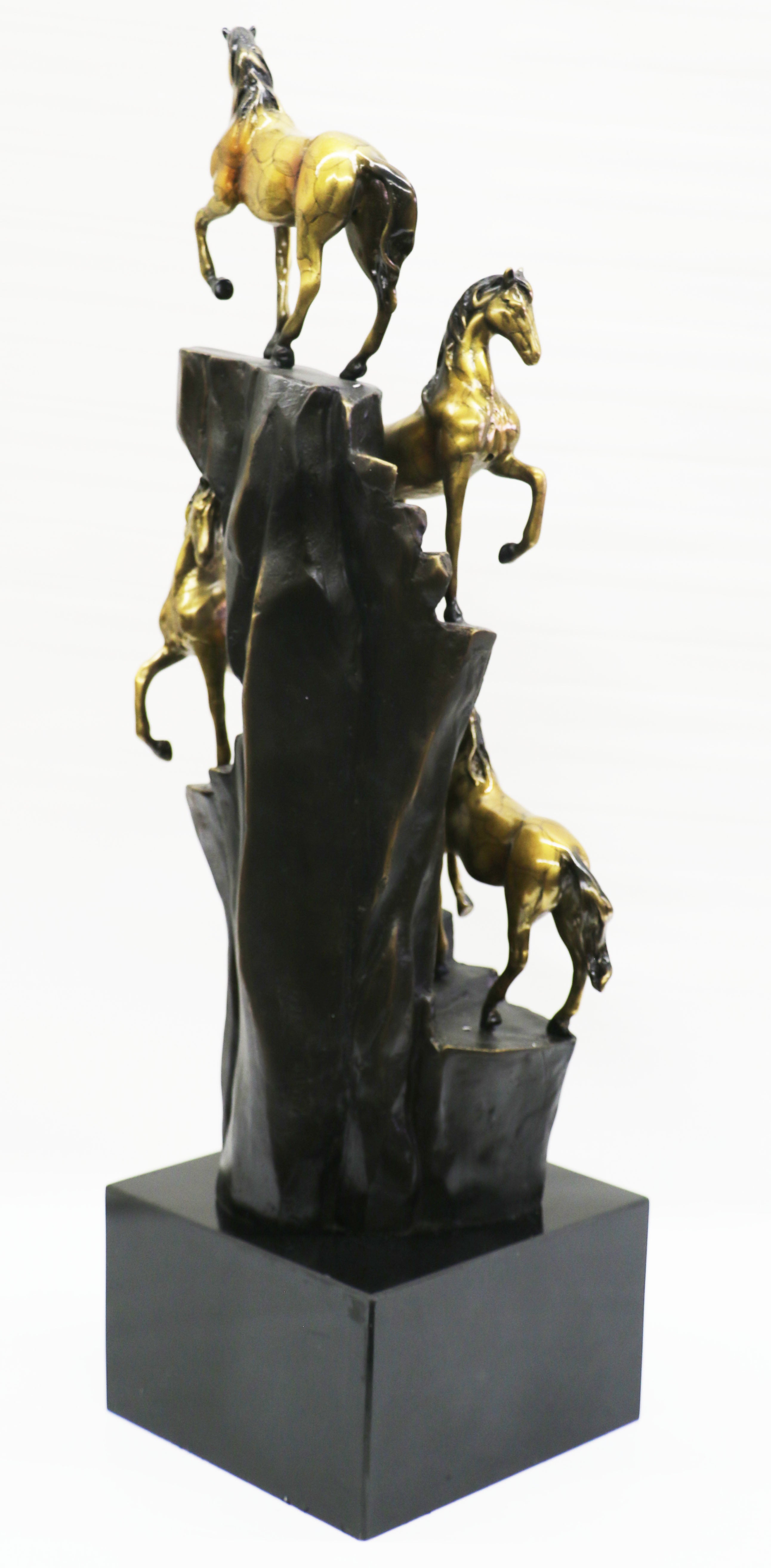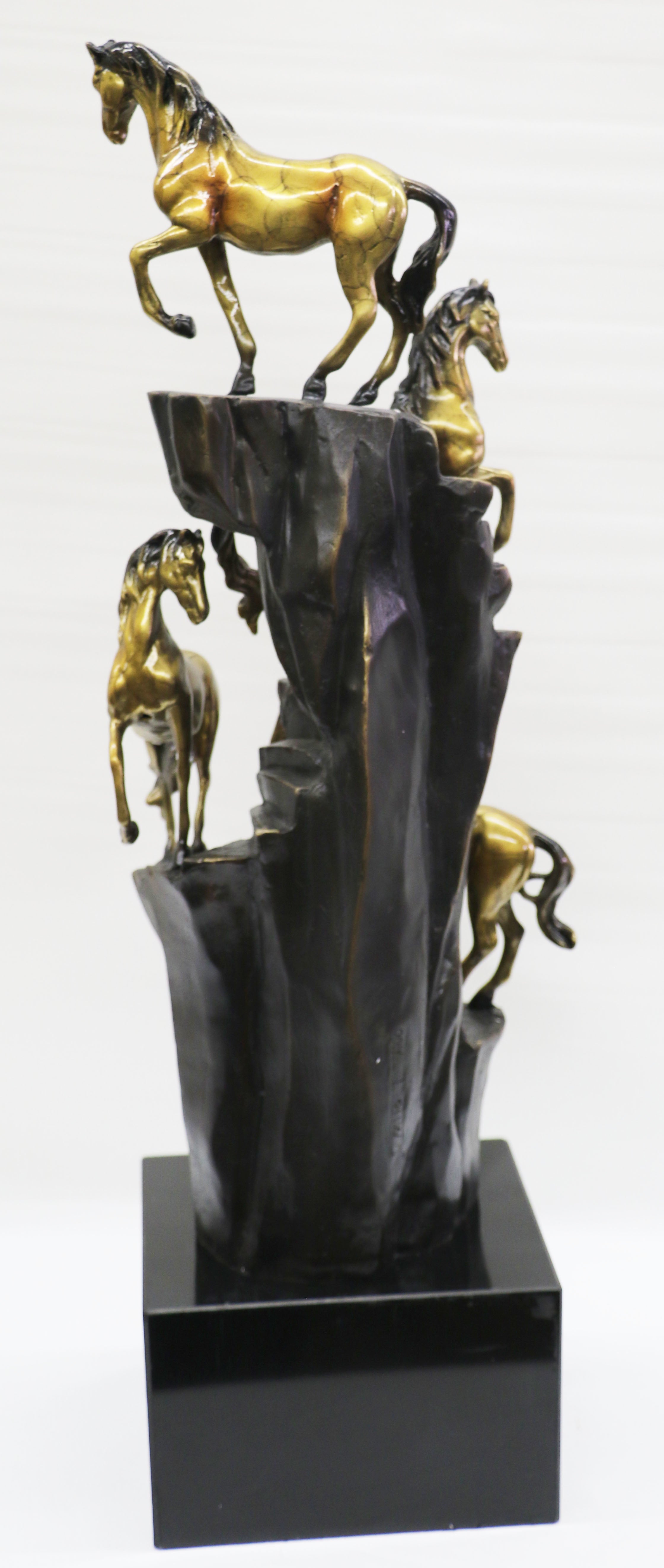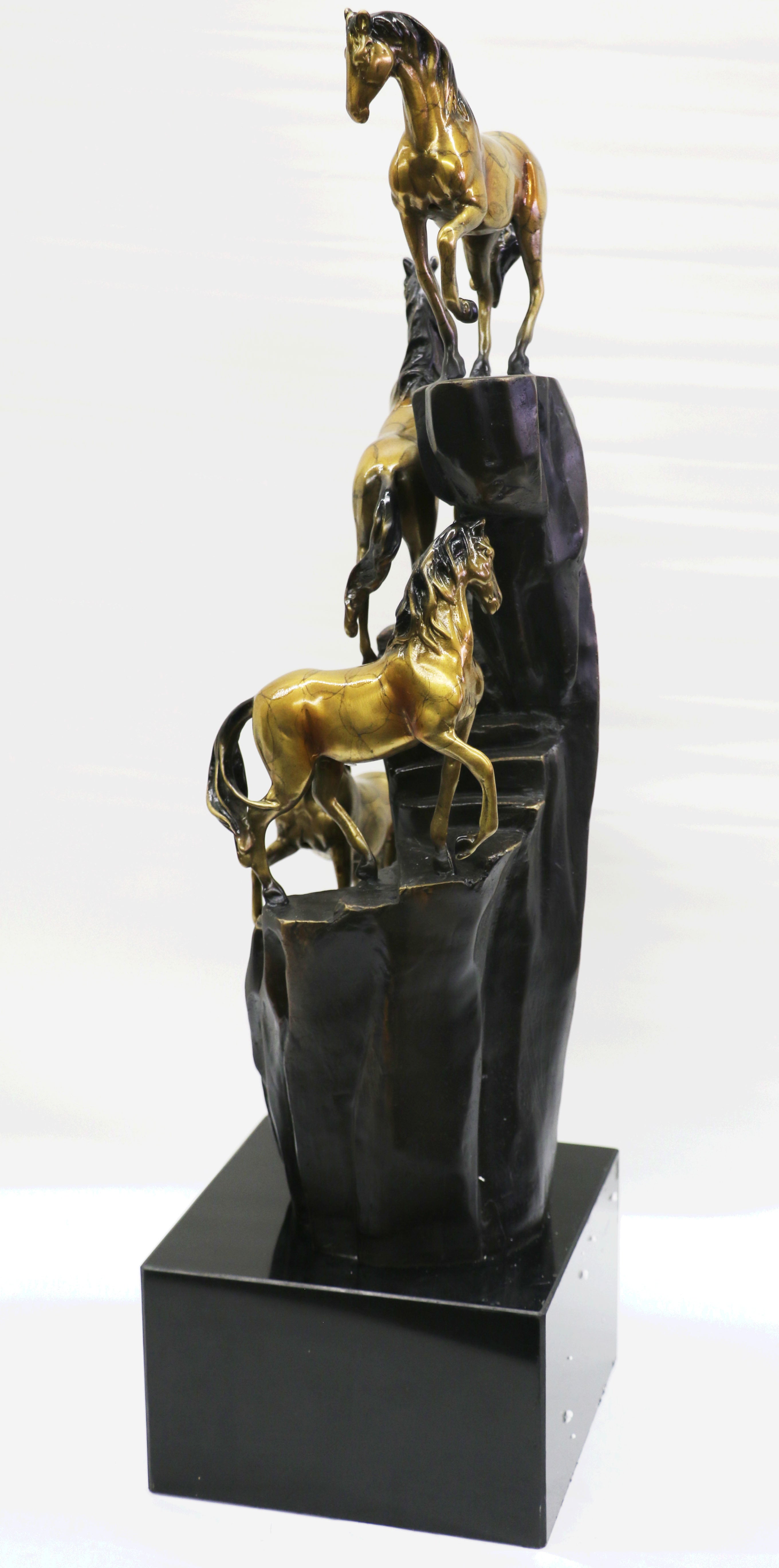 Travel to the American West from the comfort of your home with this Limited edition Hot cast Bronze wild horse sculpture featuring four lively, galloping ponies. Realistically rendered and finished in Gilt and warm, natural bronze, it will bring the majesty of wildlife into any room. Hand-crafted European Finery Studio by The Bronze Baron using the ancient lost wax casting method. Once hardened, it is painstakingly buffed, polished and finished by hand. The artistry involved means that subtle variations in color, making each piece a one-of-a-kind treasure. 100% bronze and handmade, this Multi Color patina sculpture was cast using the "Lost Wax Method" and is mounted on a black marble base signed and numbered by artist Milo.Bronze Dimensions with Marble Base:Height 25" x Width 7"