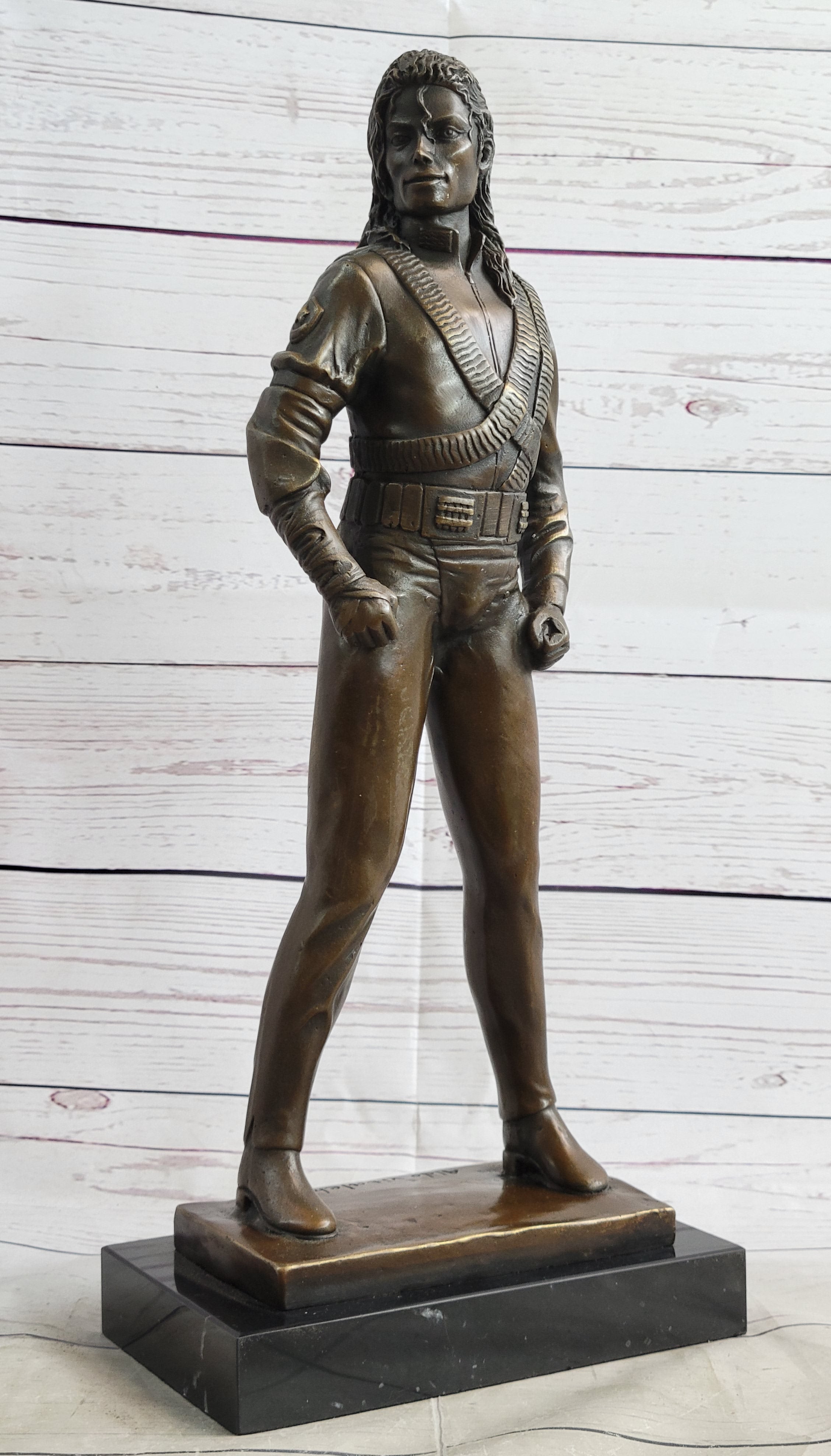 Celebrate the iconic legacy of Michael Jackson with this handcrafted bronze sculpture by Aldo Vitaleh. Capturing the essence of the King of Pop, this exquisite artwork showcases Michael Jackson in a dynamic pose, his iconic dance moves frozen in time. Every detail, from his signature fedora to his stylish outfit, is meticulously crafted to perfection. With the lost wax method used in its creation, this sculpture embodies the artist's dedication to preserving the spirit and talent of Michael Jackson. The rich brown patina adds depth and warmth to the bronze, enhancing the lifelike features of the sculpture. It is mounted on a sleek black marble base, providing a sophisticated and elegant display. This masterpiece is a testament to Aldo Vitaleh's artistry and his ability to capture the essence of a legendary figure like Michael Jackson. It is a must-have for fans, collectors, and anyone who appreciates the art of music and dance. This original artwork by Aldo Vitaleh pays tribute to the enduring impact of Michael Jackson's music and his influence on pop culture. From the intricate details of his facial expression to the dynamic pose that exudes energy and charisma, this bronze sculpture is a true work of art. With its handcrafted quality and the use of the lost wax method, it embodies the artist's commitment to creating exceptional pieces that evoke emotion and tell a story. Display it proudly in your home, office, or music-themed space, and let the spirit of Michael Jackson inspire and captivate all who see it.