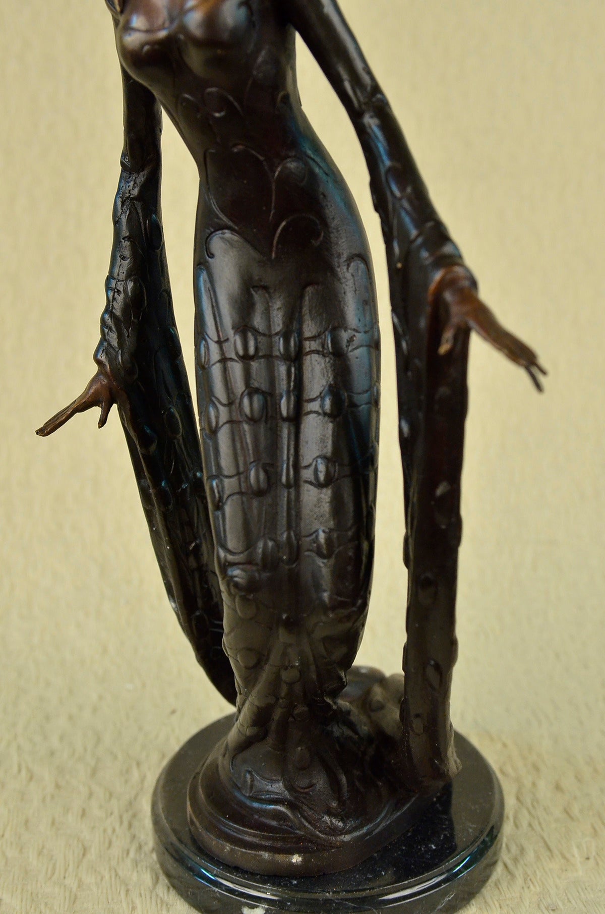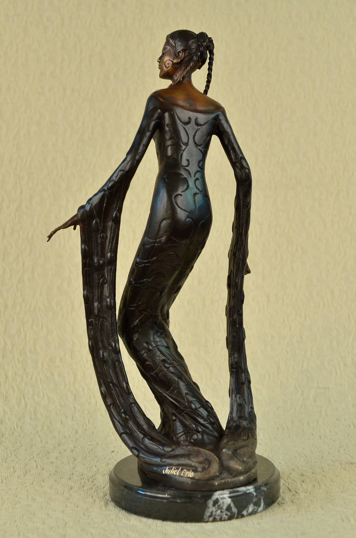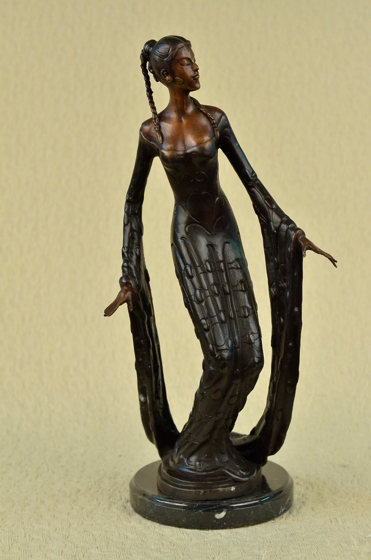 This unique sculpture of a 1920`s woman is a beautiful piece for an exquisite living room or a young lady`s bedroom. As she stands elegantly for her photo-shoot, who can forget to mention her unforgettable dress that drops all the way to the floor, while she holds an umbrella under her right arm. The details on her neck-less,waist belt, over coat, and her Charleston hat, are unbelievably carved leaving her picture perfected. This is a beautiful bronze sculpture cast using the "Lost Wax Method" and has a gorgeous brown patina. It is mounted on a marble base and is 100% bronze and handmade.Original or Reproduction: Reproduction