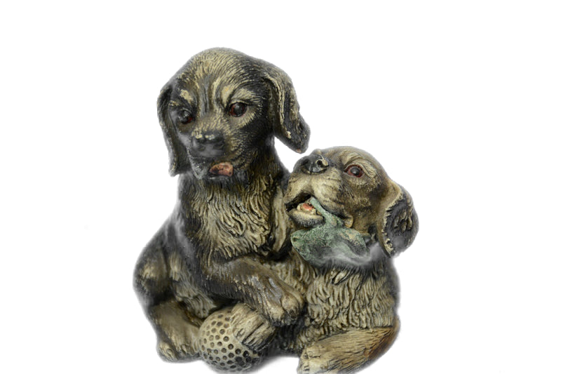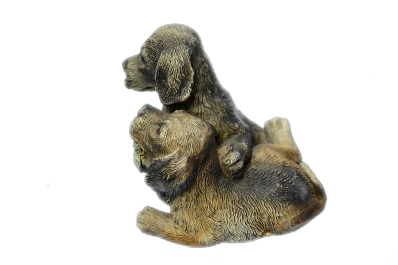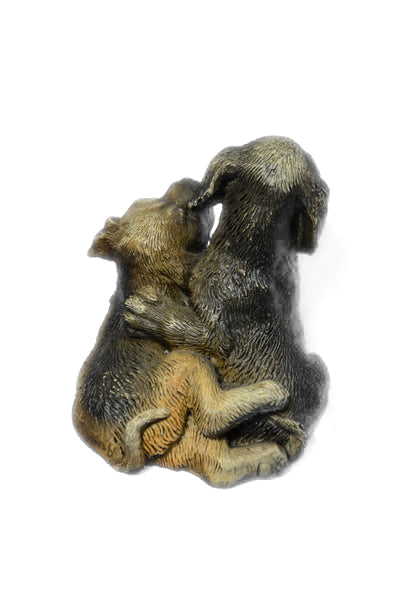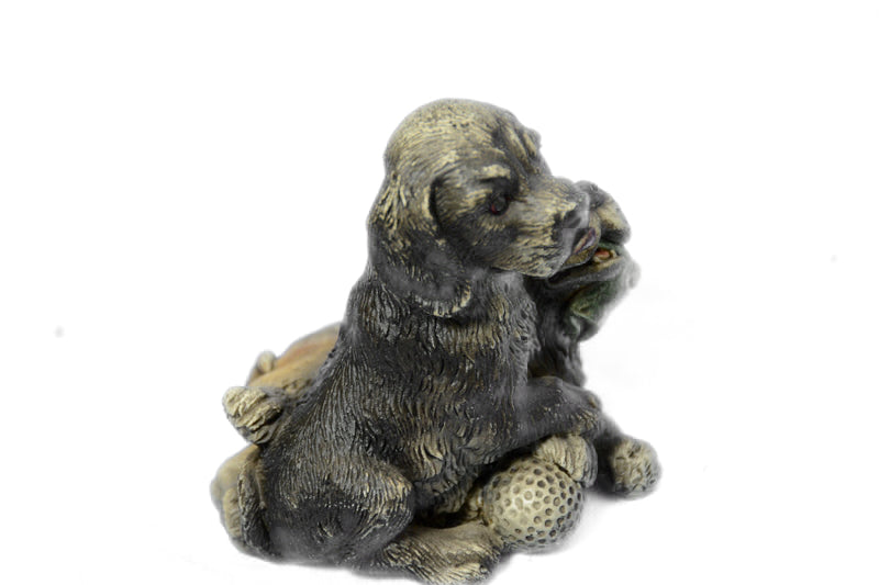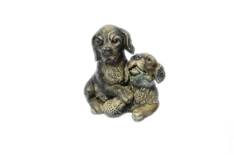 Two Puppy Labrador Cuddles Up Against each other playing. One Nuzzles His Head Downward, While His Sibling Crawls Over his Back. The Pups Are A Spitting Image Of each other, With Her Round Nose And Floppy Ears. 100% Bronze And Handmade, This multi color Patina Sculpture Was Cast Using The “Lost Wax Method’ And Is Signed By Artist Bergman.Bronze Dimensions :Height 3.5" x Width 2.5"