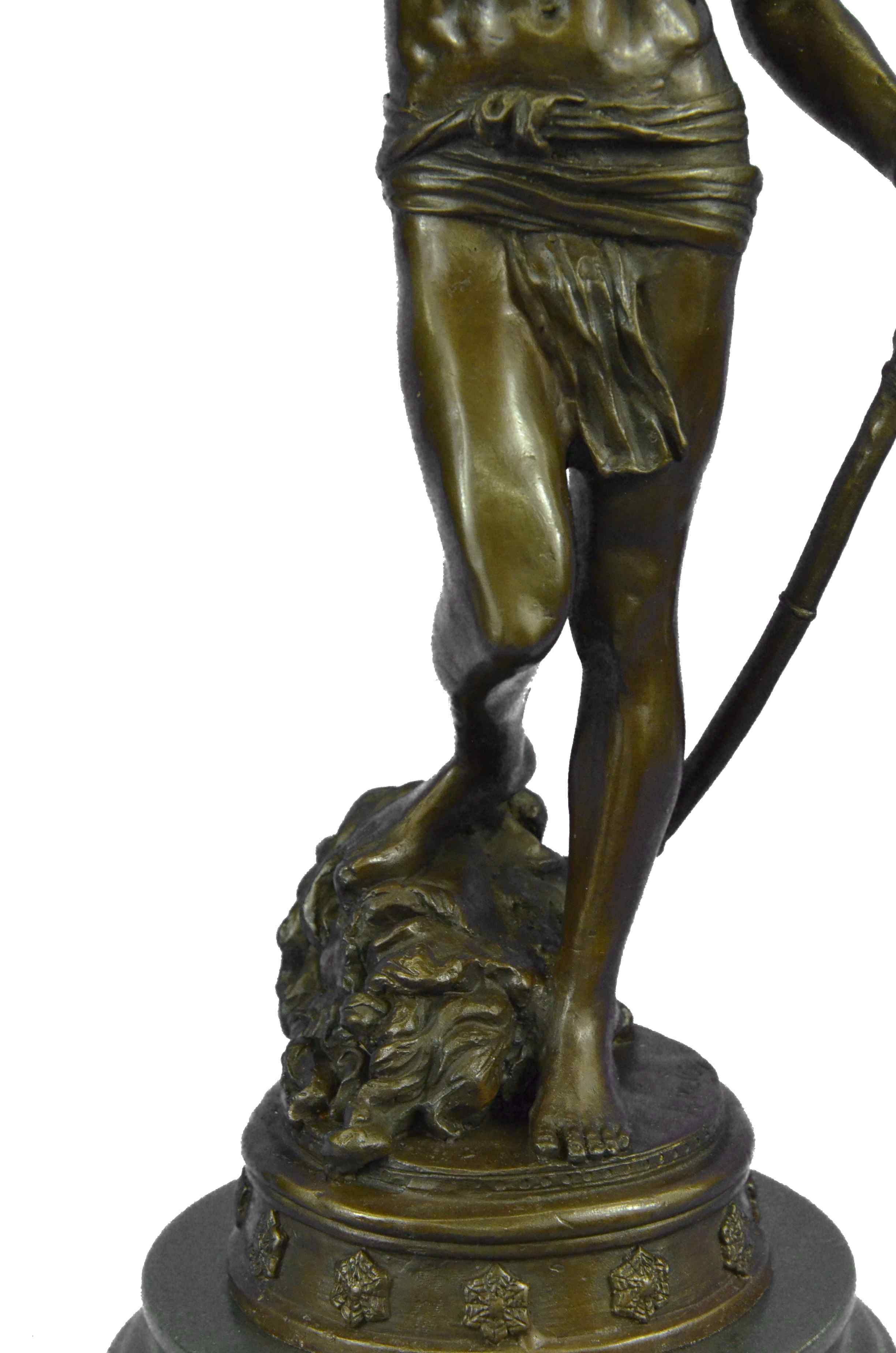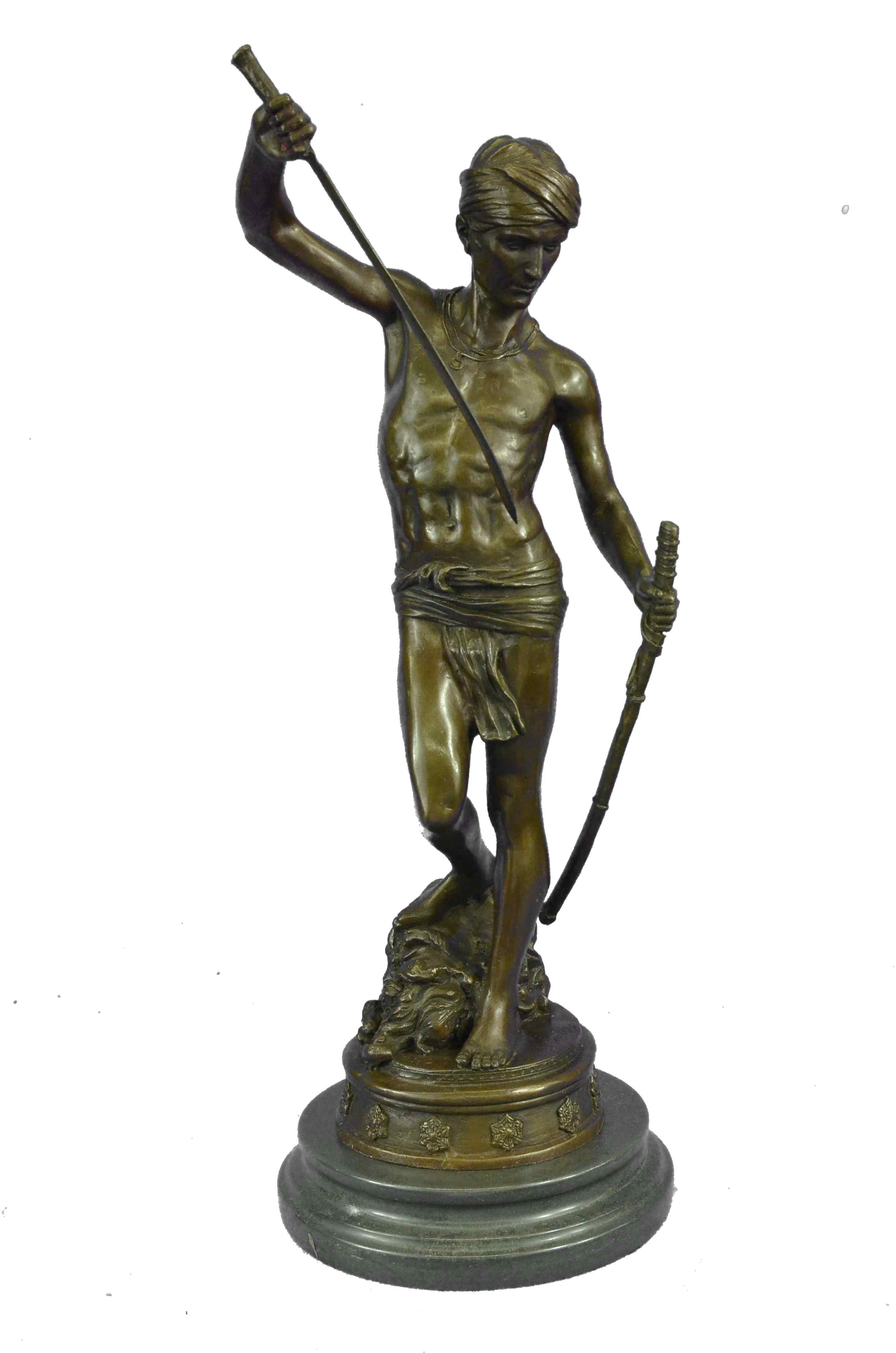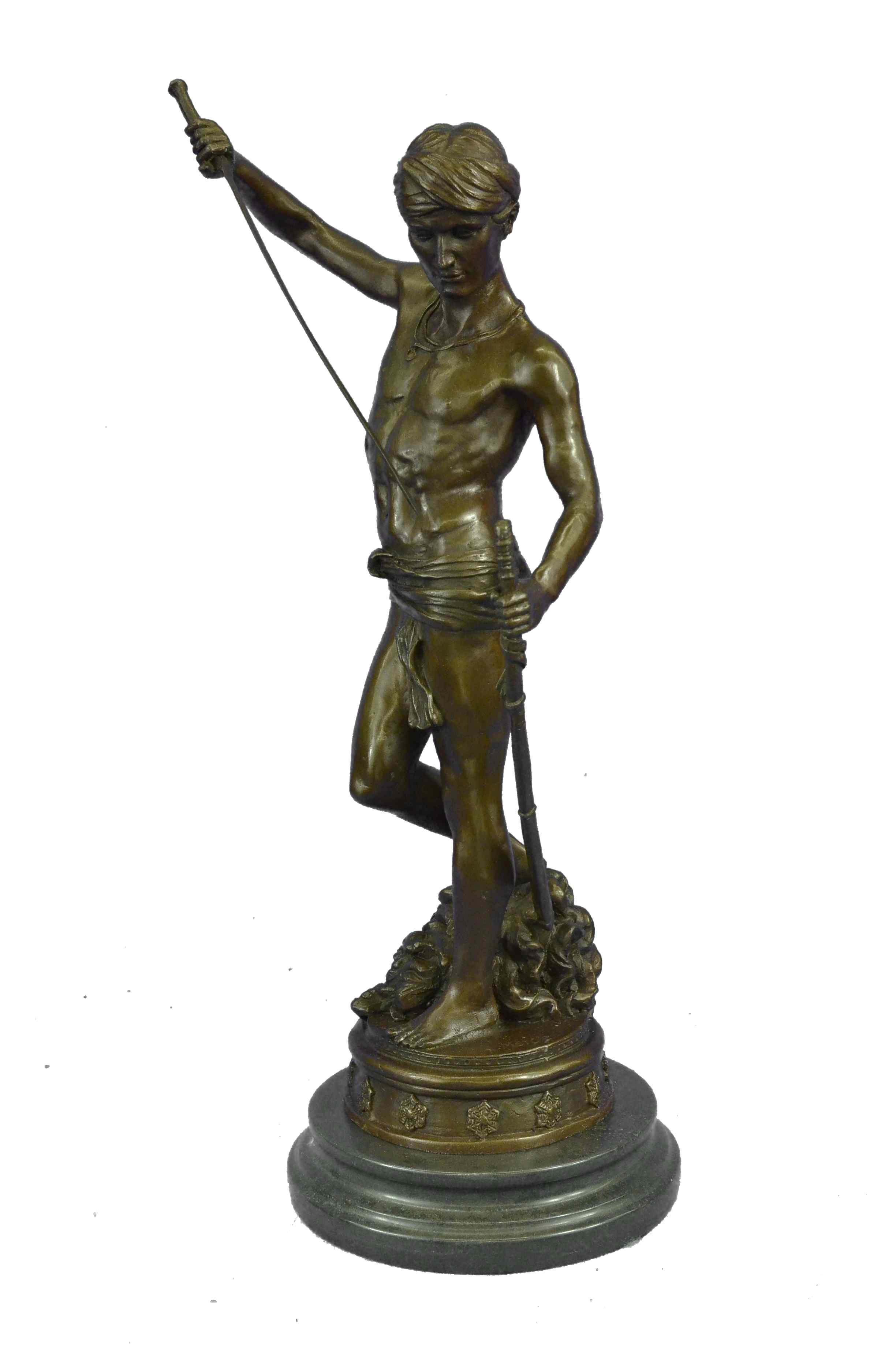 David Après le Combat was modelled during his-sojourn in Rome at the French Academy and was undoubtedly an-extremely bold statement which begged comparison with seminal works of the Renaissance by Verrocchio, Donatello and Michelangelo.However, Mercié`s youthful hero, with his effete charm andovertones of orientalism, could never be mistaken for a Renaissance work. This sculpture is a classy yet simple way to add a touch of charm to your home, office, or studio. This sculpture was cast using the "Lost Wax Method" and has a light brown patina with touches of gold highlights. This sculpture is handmade and 100% bronze and is mounted on a black marble base. this sculpture is signed by A. MercieOriginal or Reproduction: Reproduction