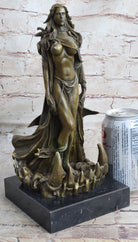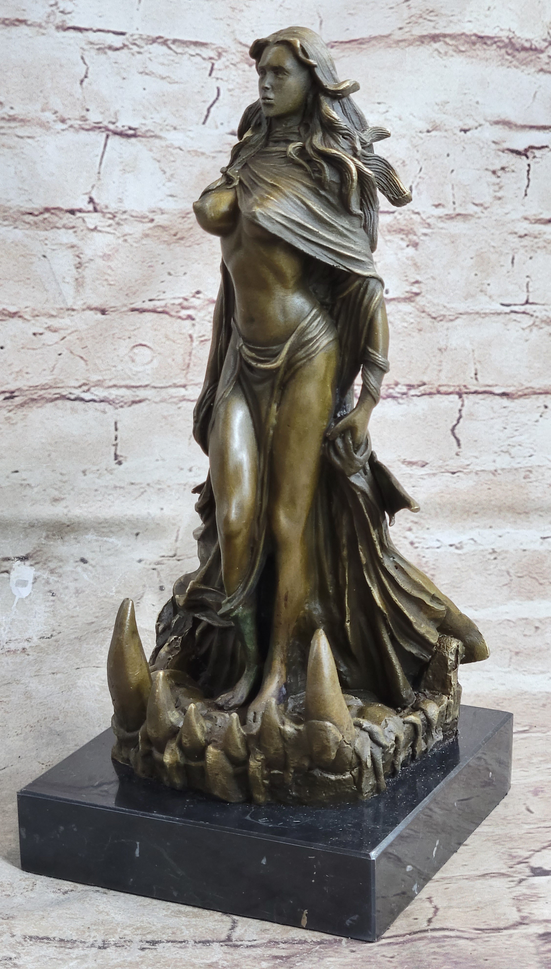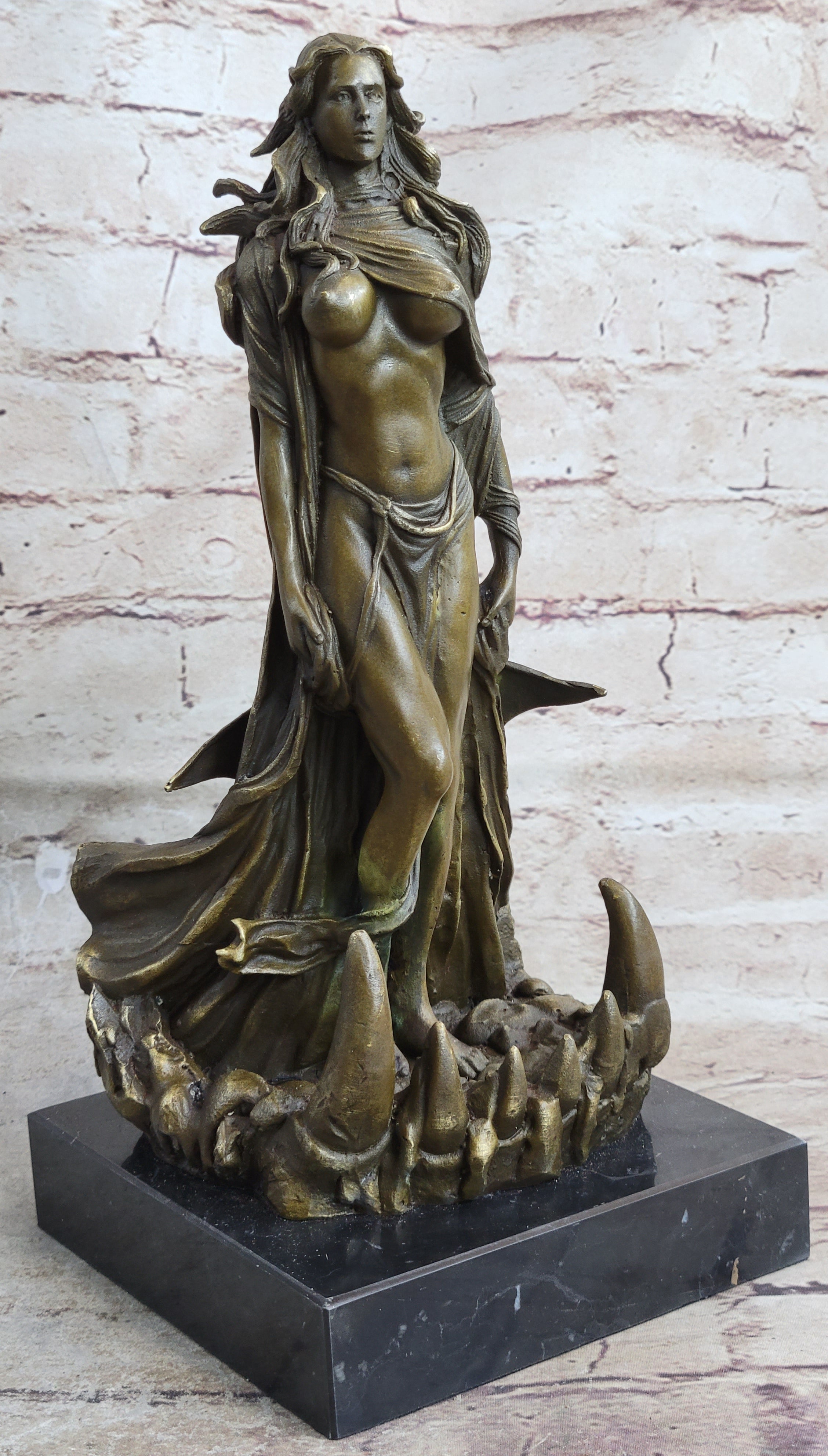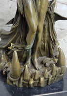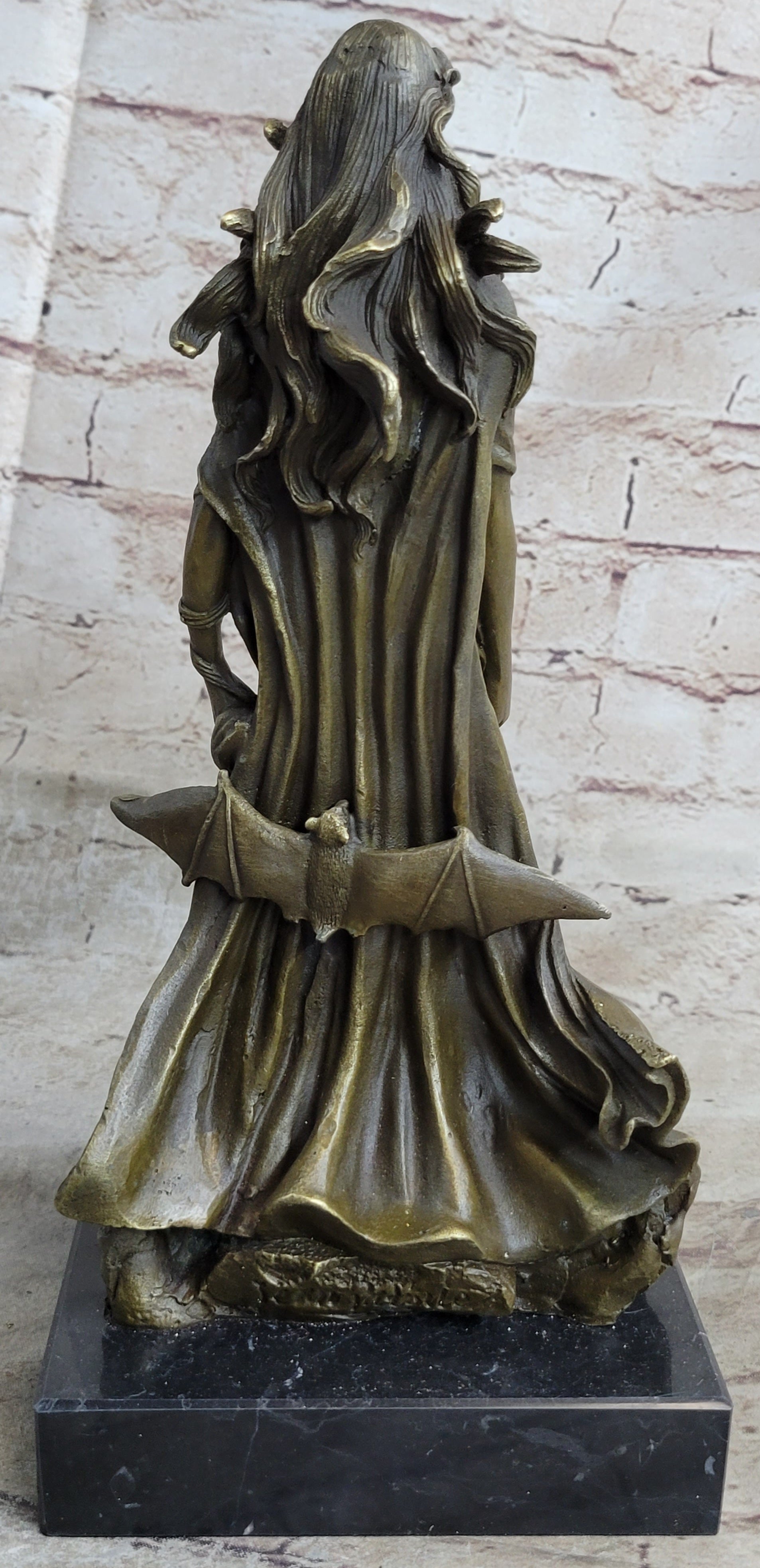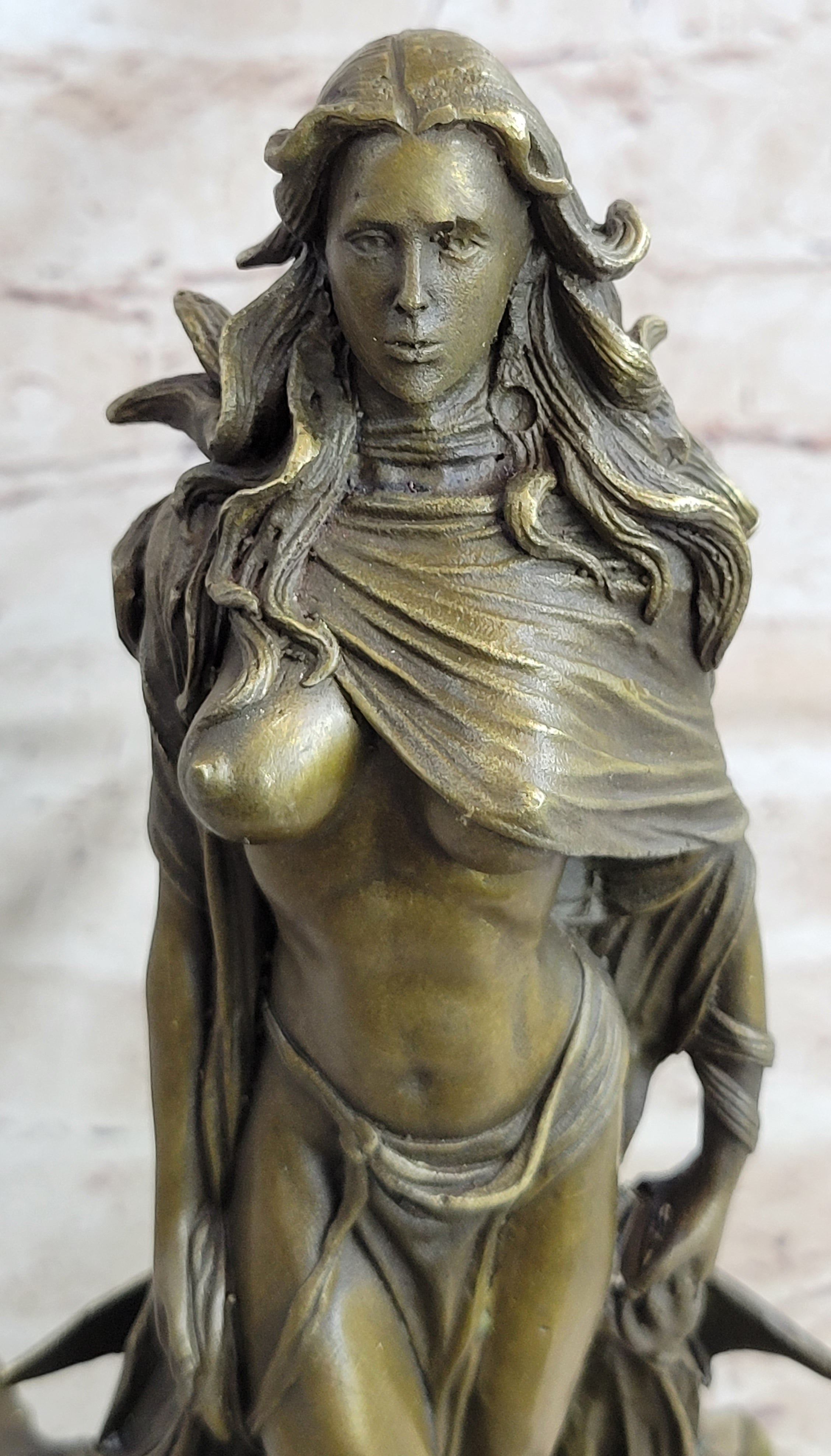 This captivating bronze sculpture portrays a seductive sorceress navigating through a dark cave with an aura of mystery and allure. Her curvaceous figure is accentuated as she moves gracefully, her cape barely concealing one breast while the other remains fully exposed, adding to the sensuality of the scene. A bat trailing behind her enhances the atmosphere of darkness and intrigue.