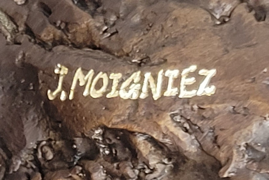 This one-of-a-kind bronze sculpture is meticulously handcrafted, ensuring its uniqueness and quality. Created using the renowned "Lost Wax Method," the artisan has brought the Pomeranian's adorable features to life. The beautiful brown patina adds depth and realism to the sculpture, giving it a timeless appeal. With the signature of the skilled artist J. Moigniez, this piece stands freely on all fours, ready to capture the hearts of all who lay their eyes on it.