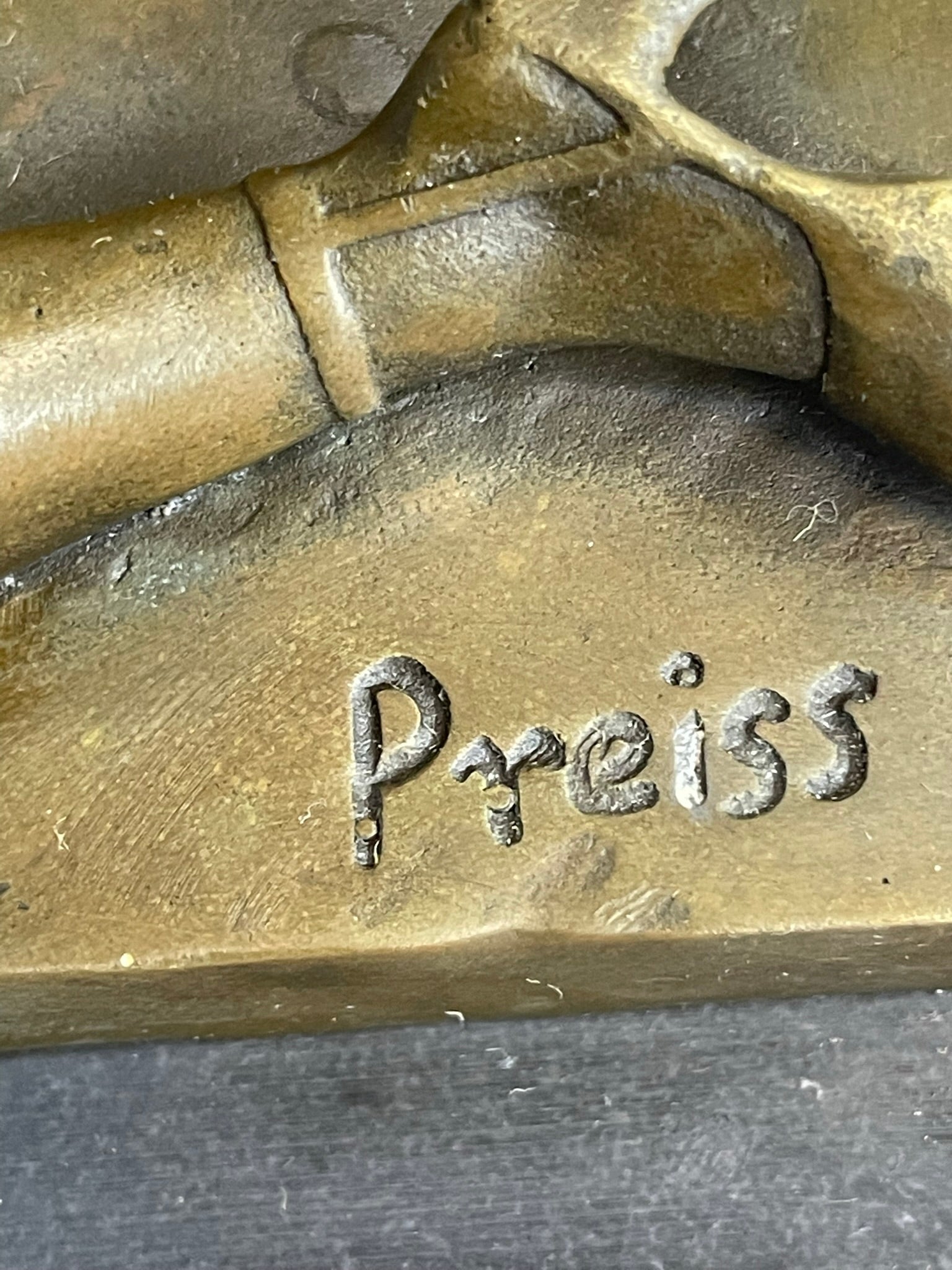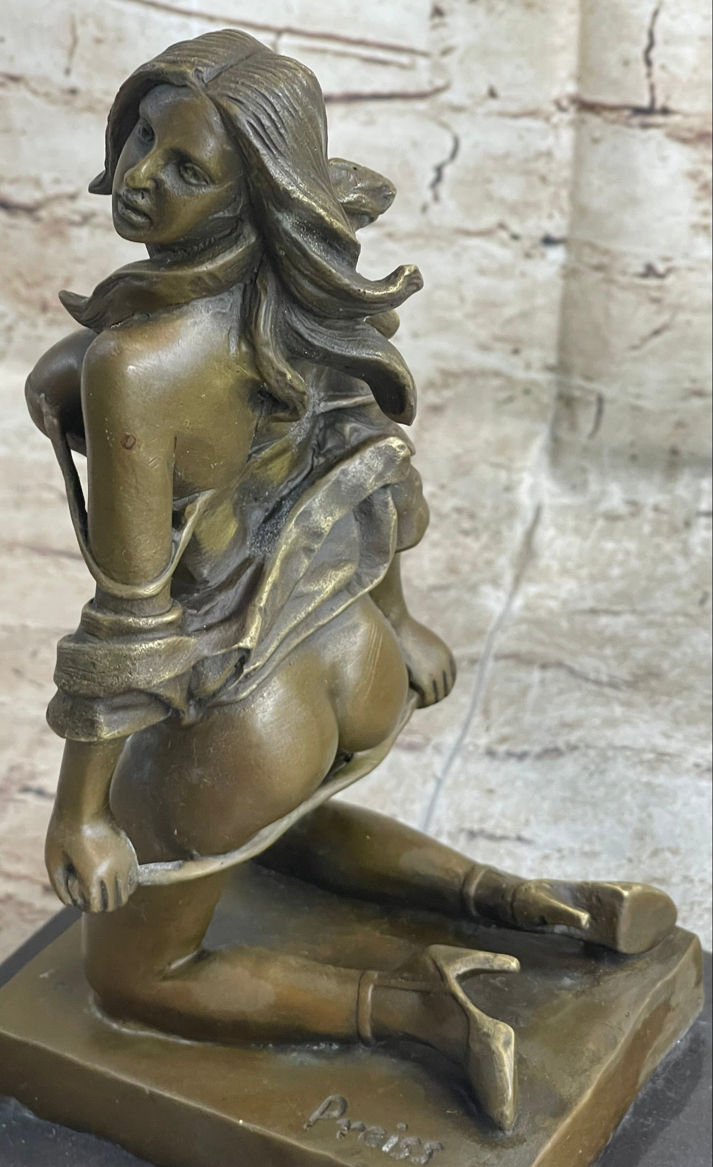 As a tasteful home accessory, "Girl with Whip" appeals to art enthusiasts looking for a sophisticated and thought-provoking addition to their collection. With its classical aesthetic and expert craftsmanship, this bronze sculpture offers a unique conversation piece that can be appreciated for its artistic merit. It bears the signature of the German artist Preiss, adding authenticity to its value as a collectible artwork.Bronze Dimensions with Marble Base: Height 10" X Width 6"