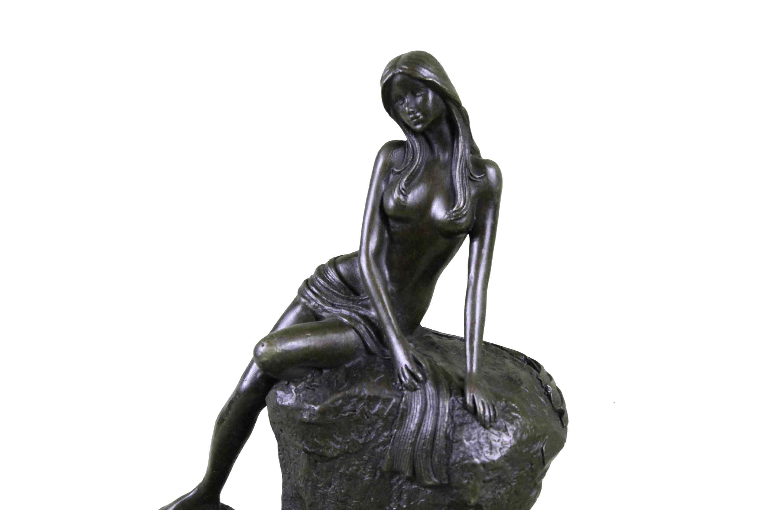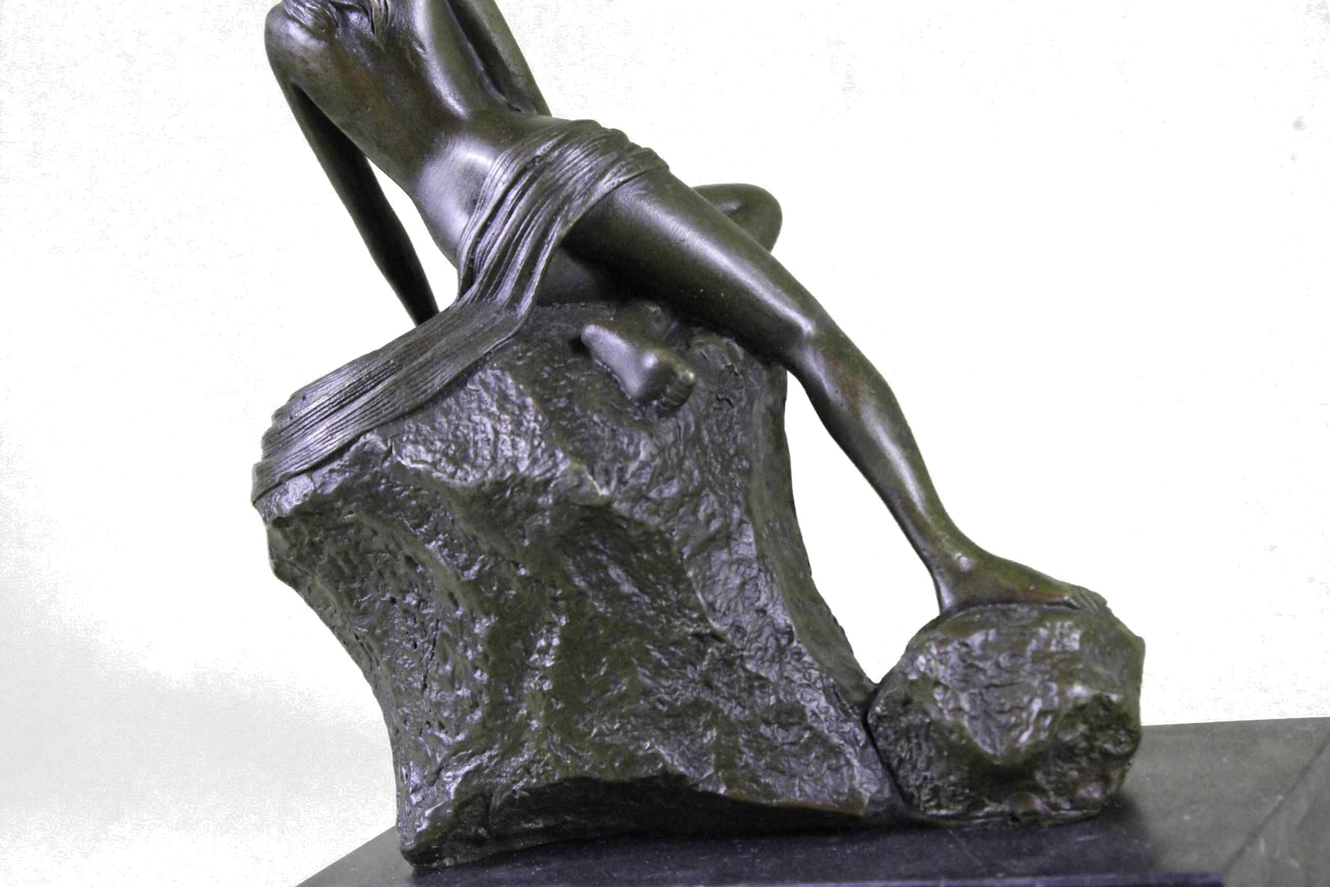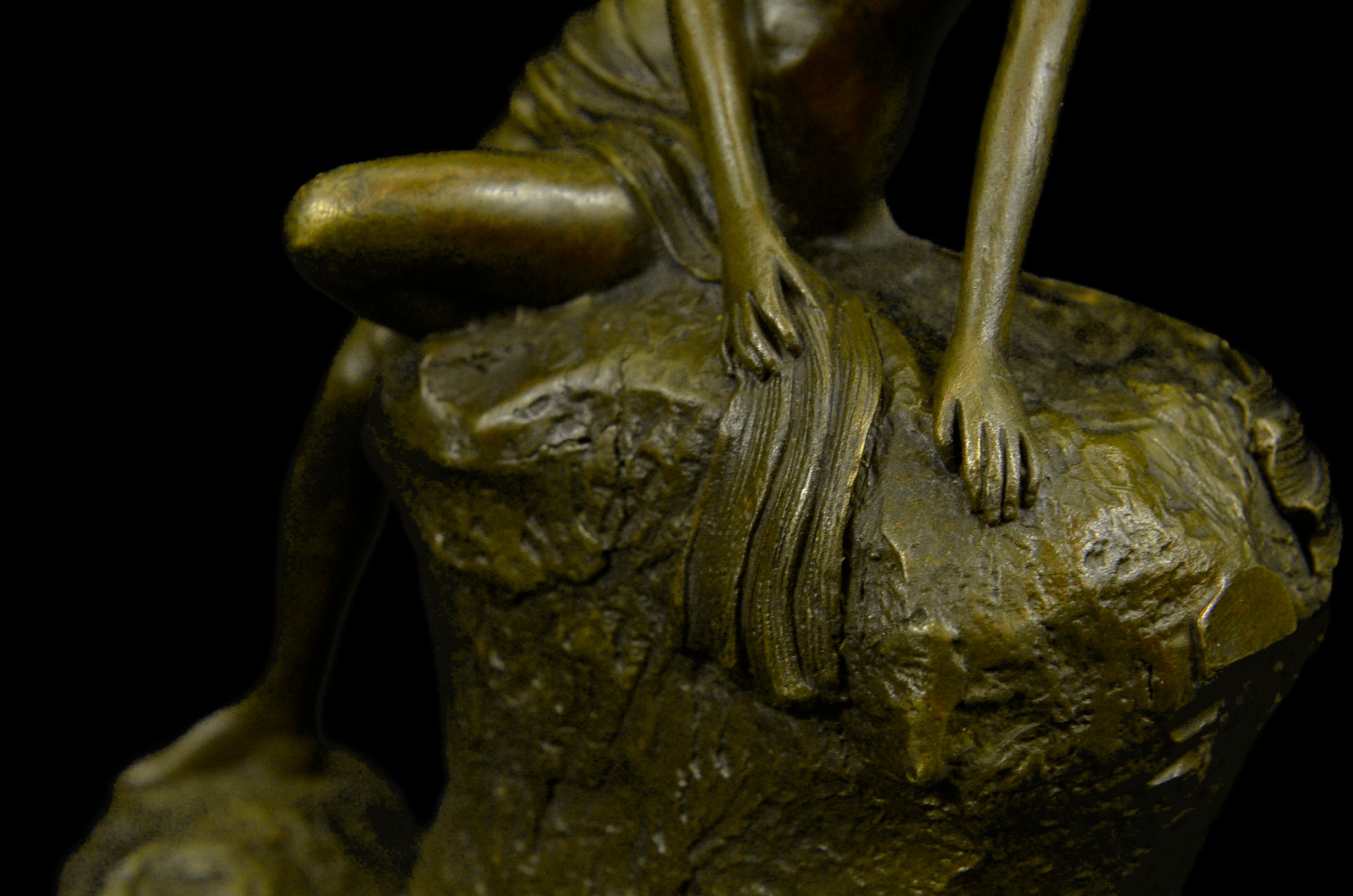 This piece by the notable artisan, Milo, features a young girl sitting atop a rock. She folds her body up underneath her as she allows her head to rest on her knee. Her eyes are closed and her flowing hair seems to mimic the flowing draping of her garment, that reveals just a touch of her shoulder and back. This is an excellent piece featuring the lost wax method of casting, founded thousands of years ago ensuring an exquisitely detailed sculpture that will add grace and beauty to your business or home.Original or Reproduction: Original