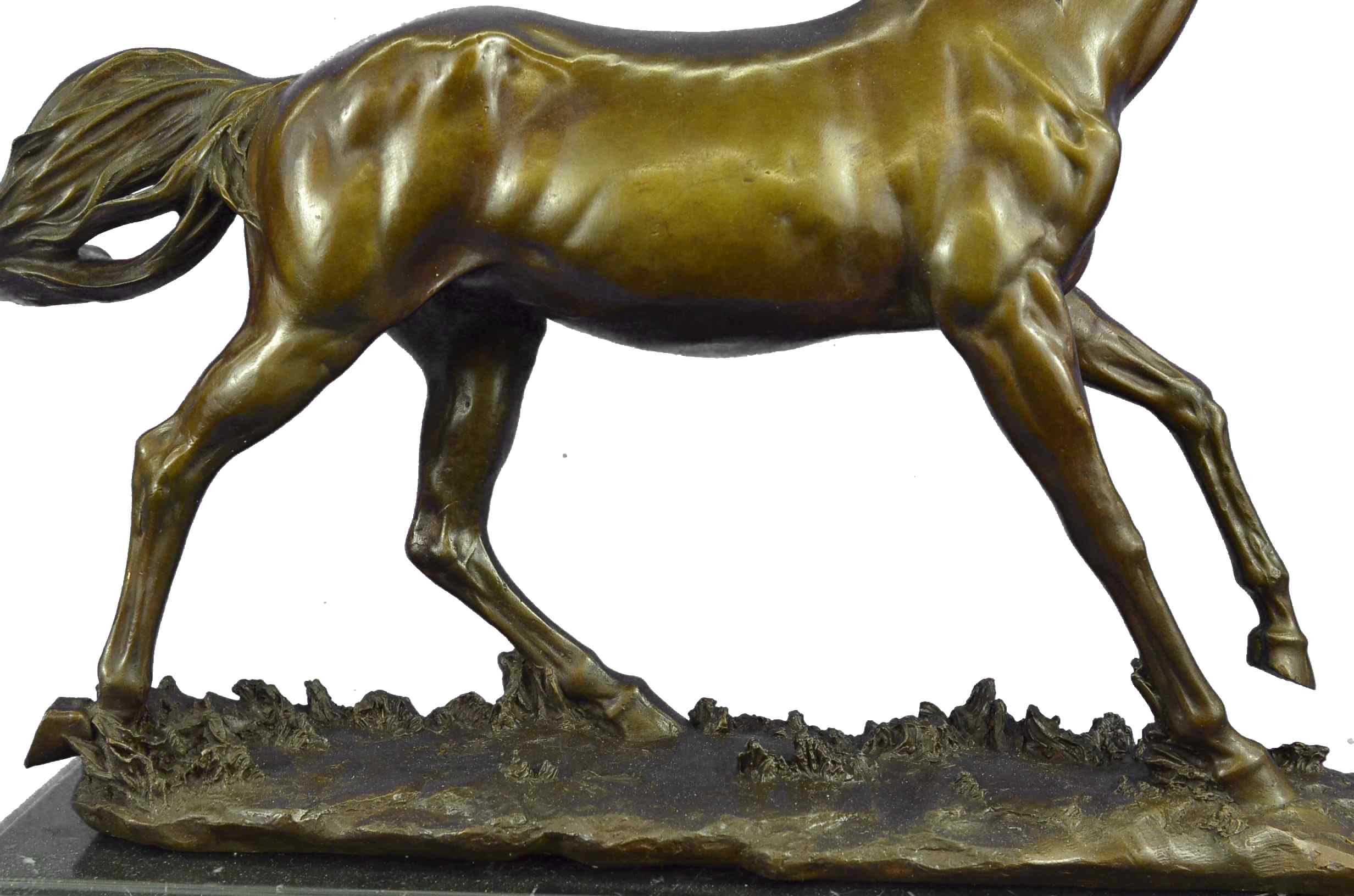 The horse trots along the the grassy land. The horse is happy and please to be free. Free to roam, free to be himself without restraints. The beautiful, magnificent animal is strong, pleasant but a powerful force when it wants to be. This sculpture was crafted using the lost wax method. It rests on a black marble base. It is signed P.j Mene.Original or Reproduction: Reproduction