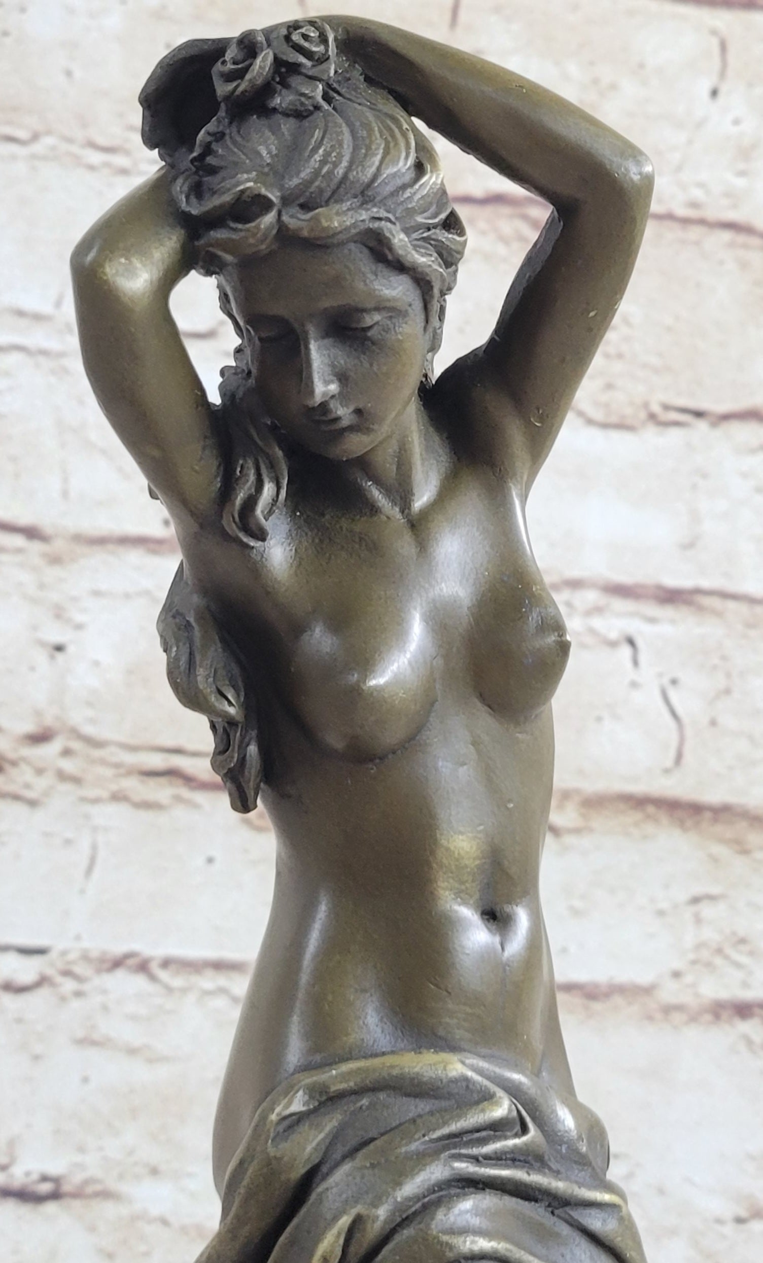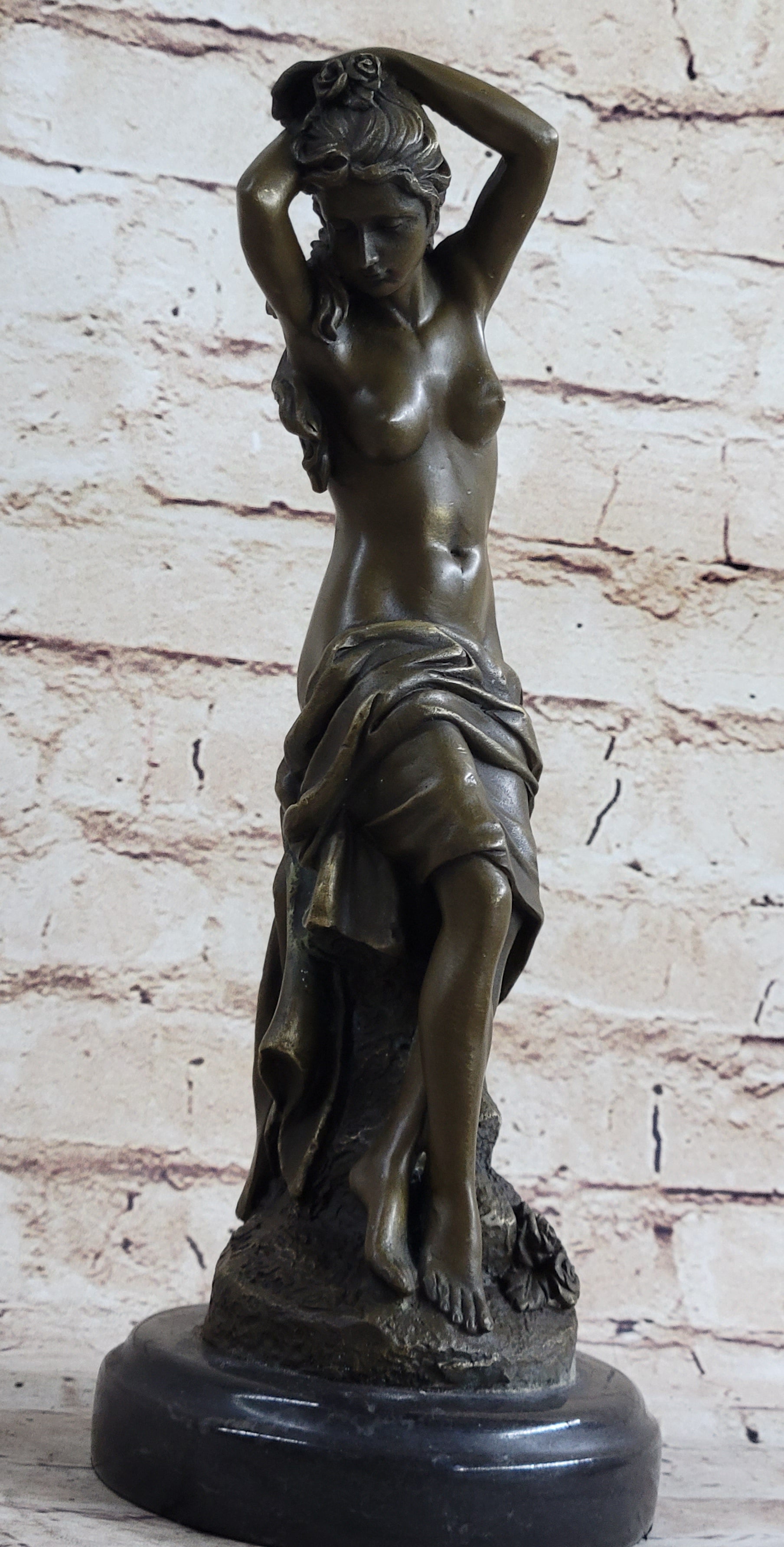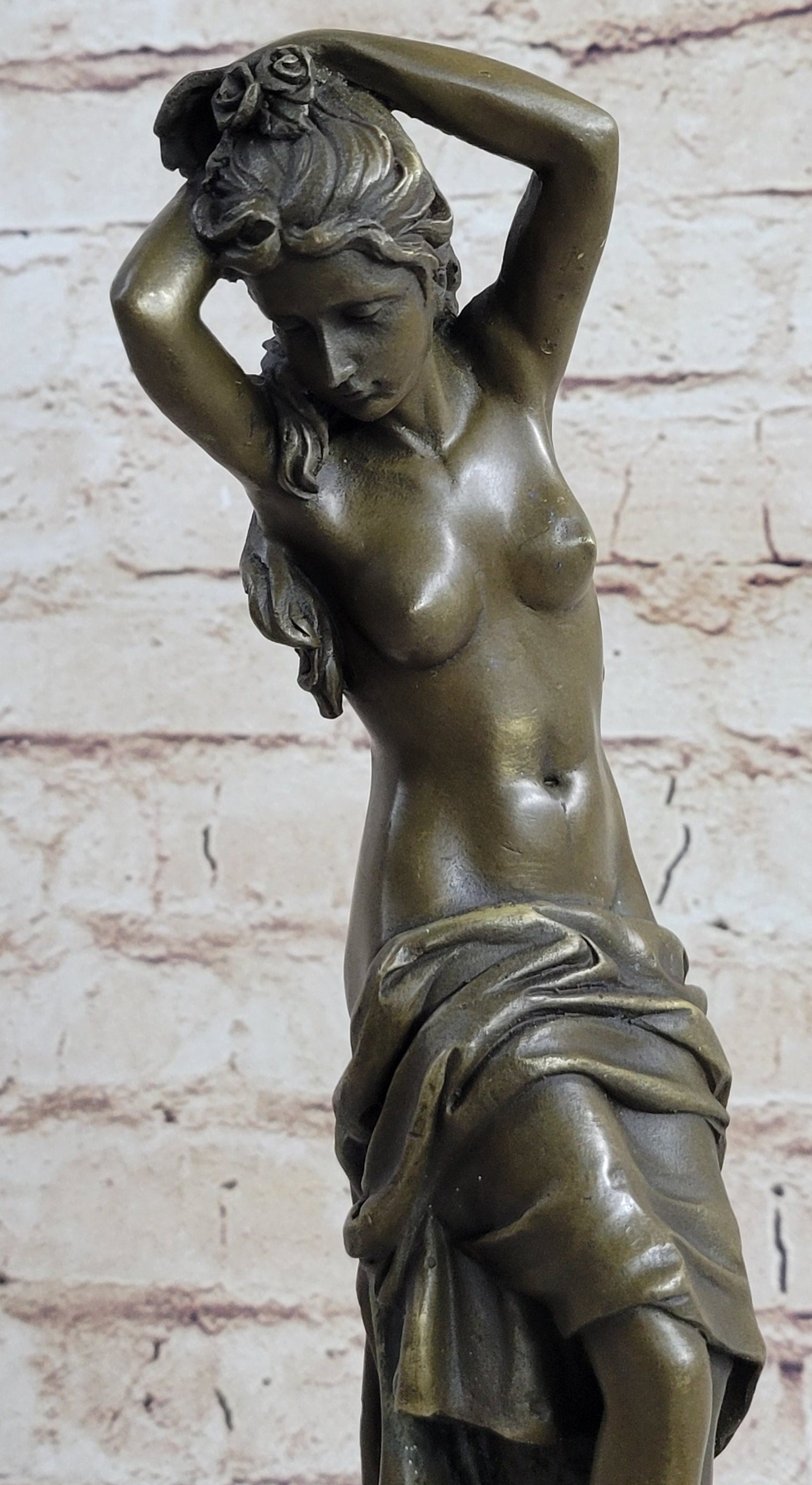 Embrace the captivating allure of this exquisite bronze sculpture, showcasing a poised and confident nude woman in a captivating stance, elegantly draped in flowing garments that cascade like a cape around her form. With a fluid sweep of her hair gathered in a loose bun adorned with delicate floral accents, her commanding presence exudes a sense of strength and self-assurance. Her gaze reflects a quiet confidence, while her subtle sideways curve adds a touch of graceful movement to the composition, creating a timeless embodiment of feminine grace and empowerment.