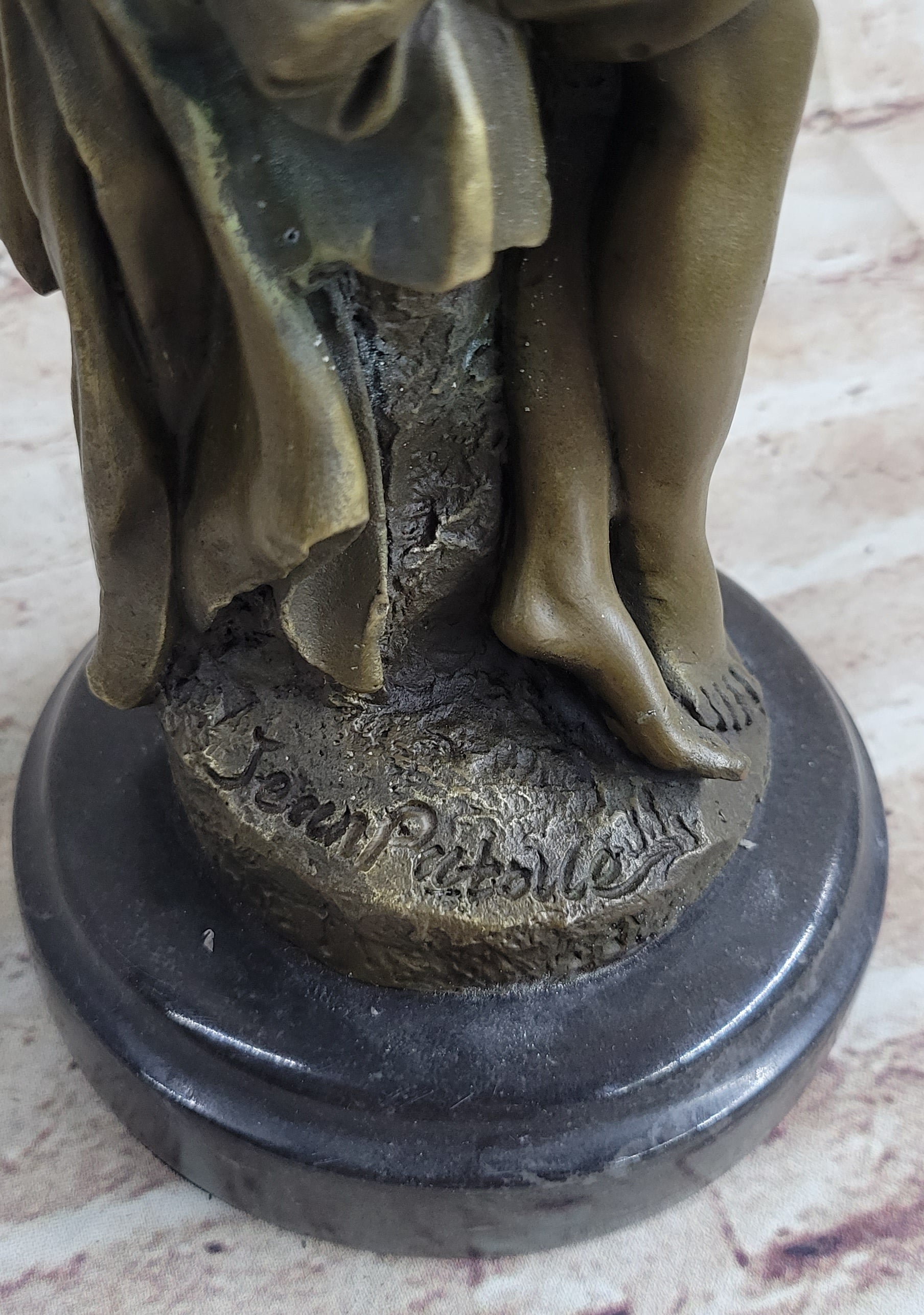 Crafted with precision and artistry using the revered lost wax method, this sculpture captures the intricacies and delicate nuances of the human form, accentuating the natural contours and subtle details that bring the artwork to life. Poised on a sleek black marble base, the sculpture stands as a testament to the mastery of the renowned artist Jean Patoue, whose signature further authenticates the exceptional craftsmanship and aesthetic brilliance of this striking piece. Whether displayed in a contemporary living space or gracing the ambiance of a sophisticated office, this sculpture serves as a cherished symbol of timeless beauty and artistic finesse, inviting viewers to immerse themselves in the captivating essence of the human form.Bronze Dimensions with Marble Base: Height 12" X Width 4 1/2"