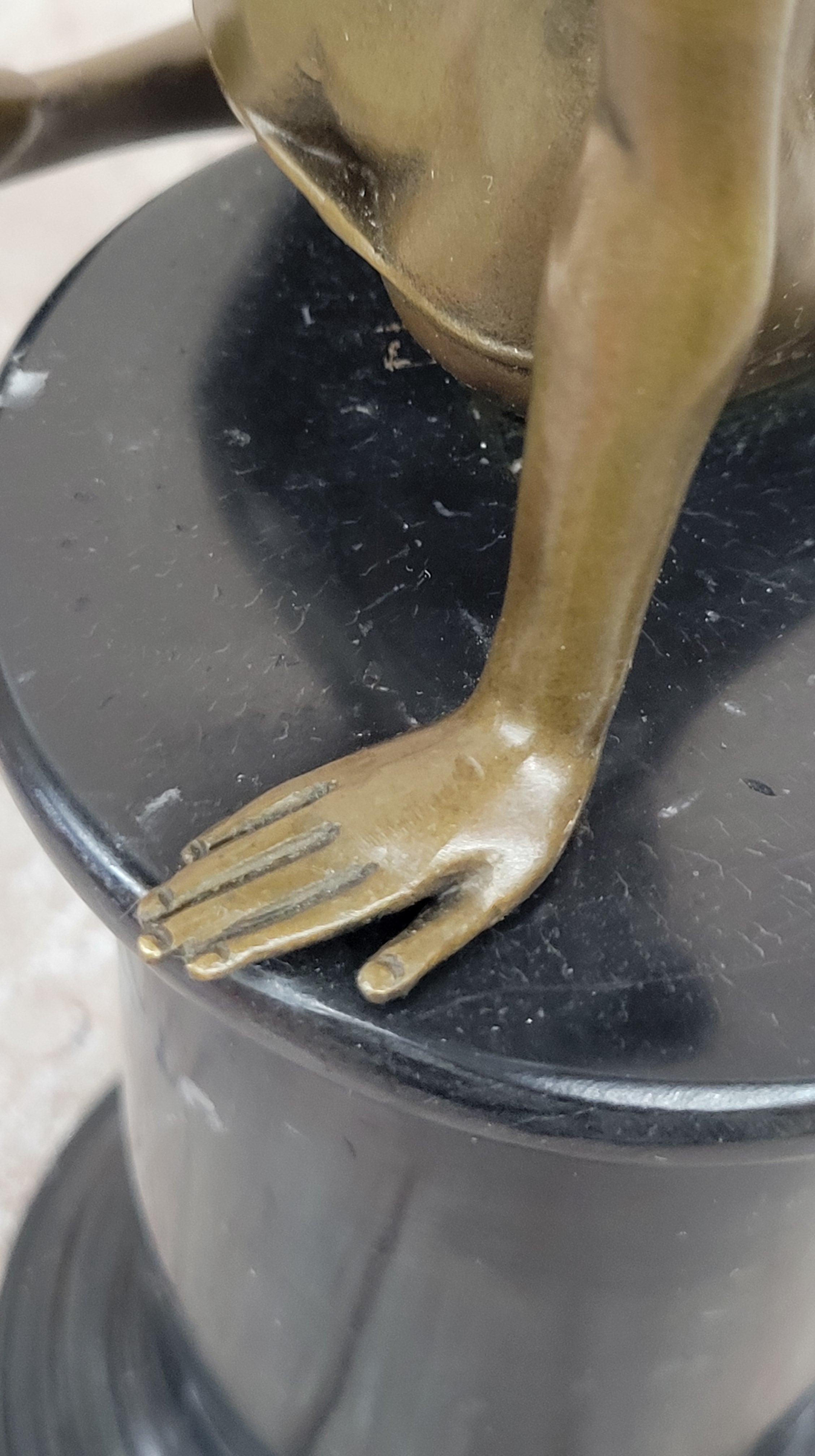 Mavchi specializes in tastefully portraying elegant and sensual sculptures, meticulously attending to every intricate detail. Employing the lost wax technique, this exquisite piece stands on a sleek black marble base and bears the artist's signature, adding a personal touch to its artistic significance. A stunning embodiment of youthful grace and purity, this bronze sculpture makes a captivating addition to any art collection, exuding timeless beauty and masterful craftsmanship.