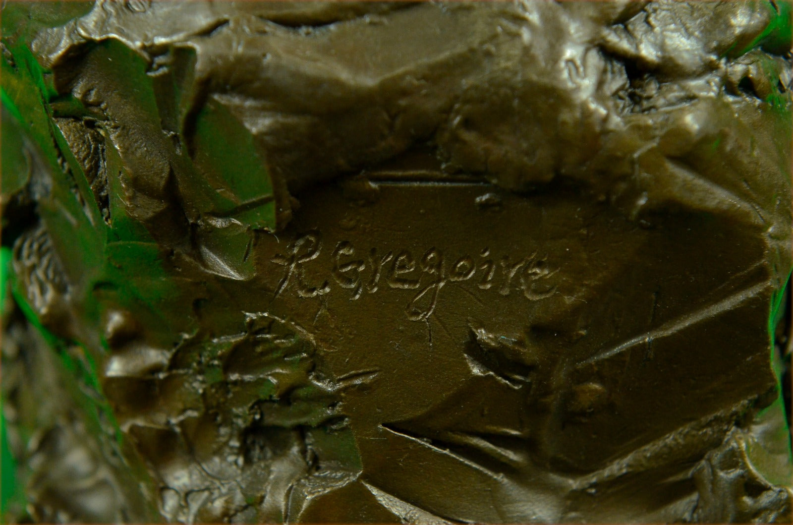 After RENE GREGOIRE(French 1871-1945) Untitled "Man pushing boulder" signed Gregoire. Patinated bronze with brown patina. Gregoire was a famous French bronze sculpturist who worked in France in the 18th Century. He was born in Saumur in 1871 and received the Prix de Rome in 1899 which was followed by many other awards from the salon. He is famous for his studies of the human form and made a wonderful casting of a pair of female torcheres not disimilar in style to the Statue Of Liberty in New York.Bronze Dimensions with Marble Base:Height 13" x Width 14"