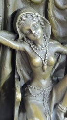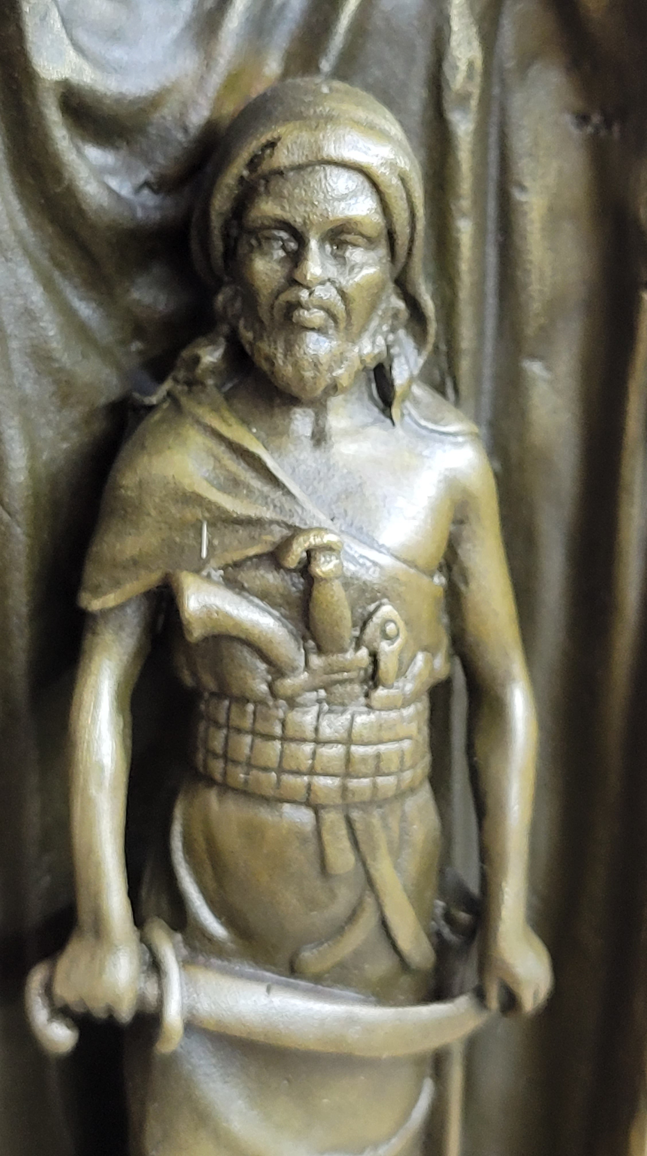 This striking bronze sculpture is a beautifully executed reproduction of a work by the renowned 19th-century artist Franz Bergman, who often signed his erotic pieces as “Nam Greb,” a reversal of his real name. The piece depicts a powerful scene featuring a guard protecting a young enslaved woman within a harem setting, reflecting both strength and vulnerability in its composition. The attention to detail in the figures’ expressions and posture captures a dramatic moment frozen in time.