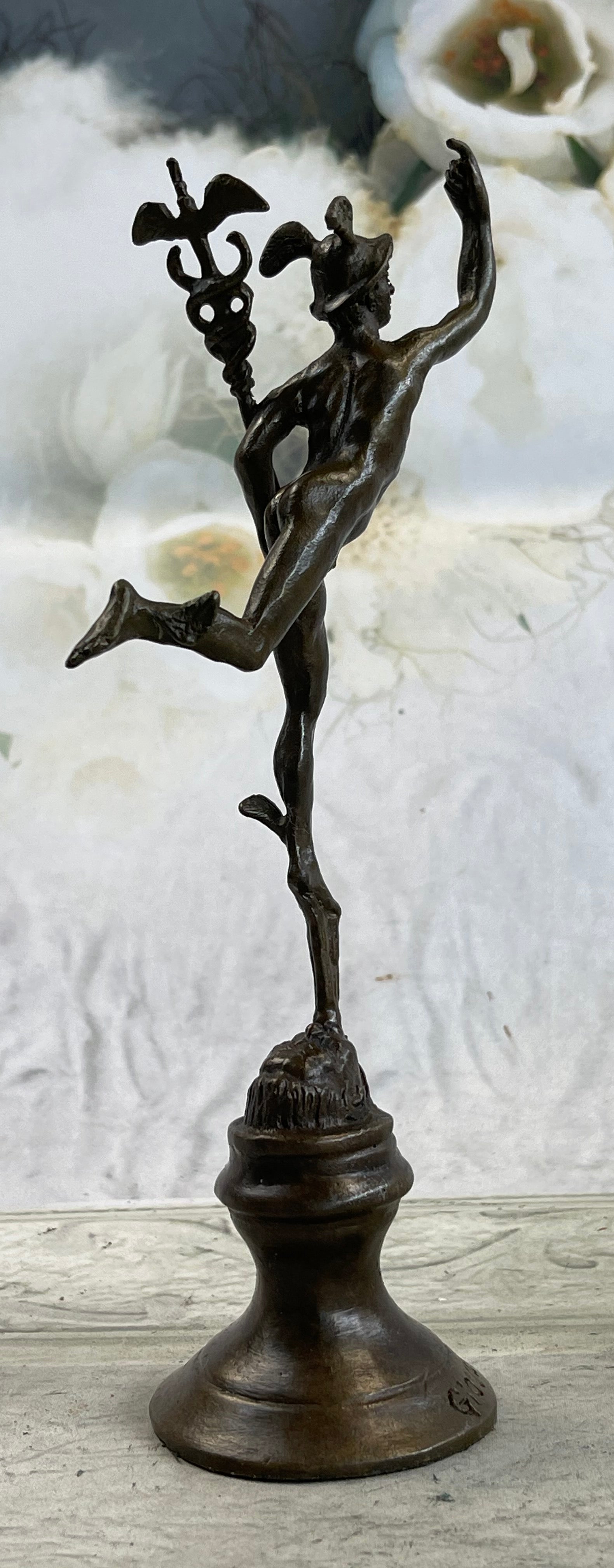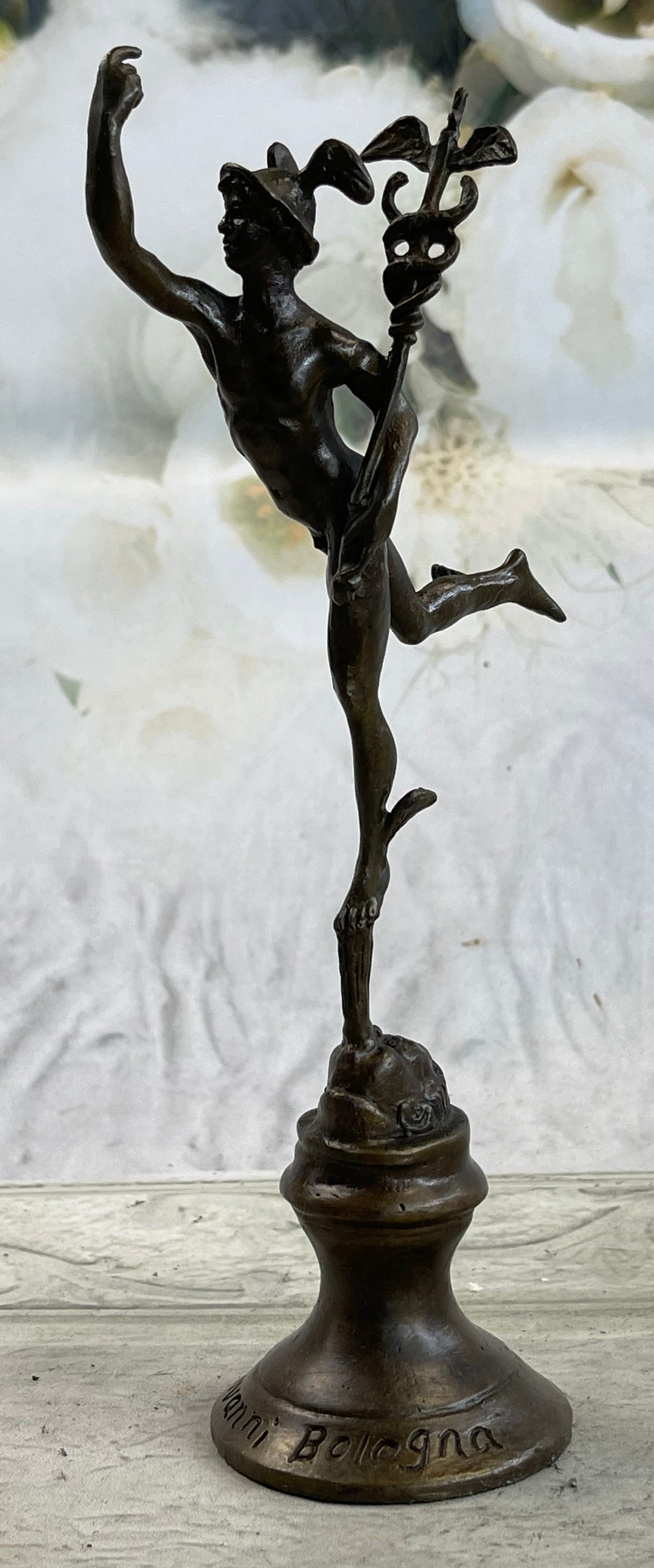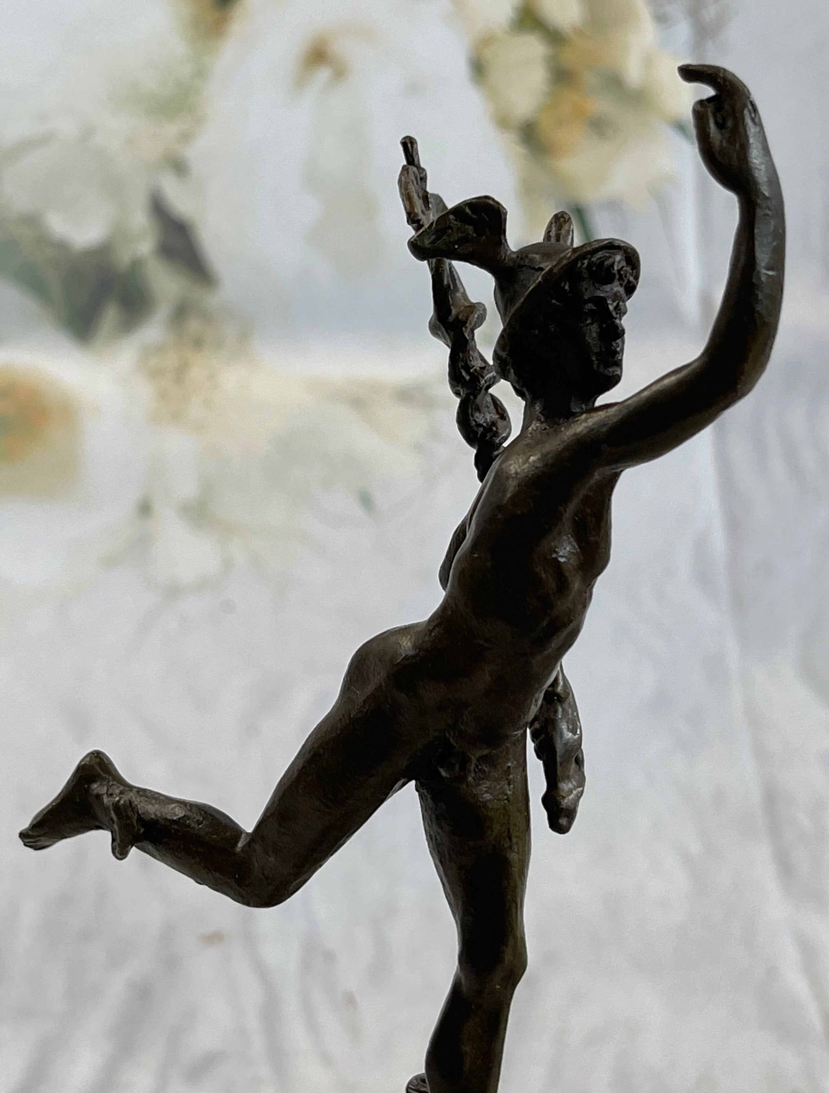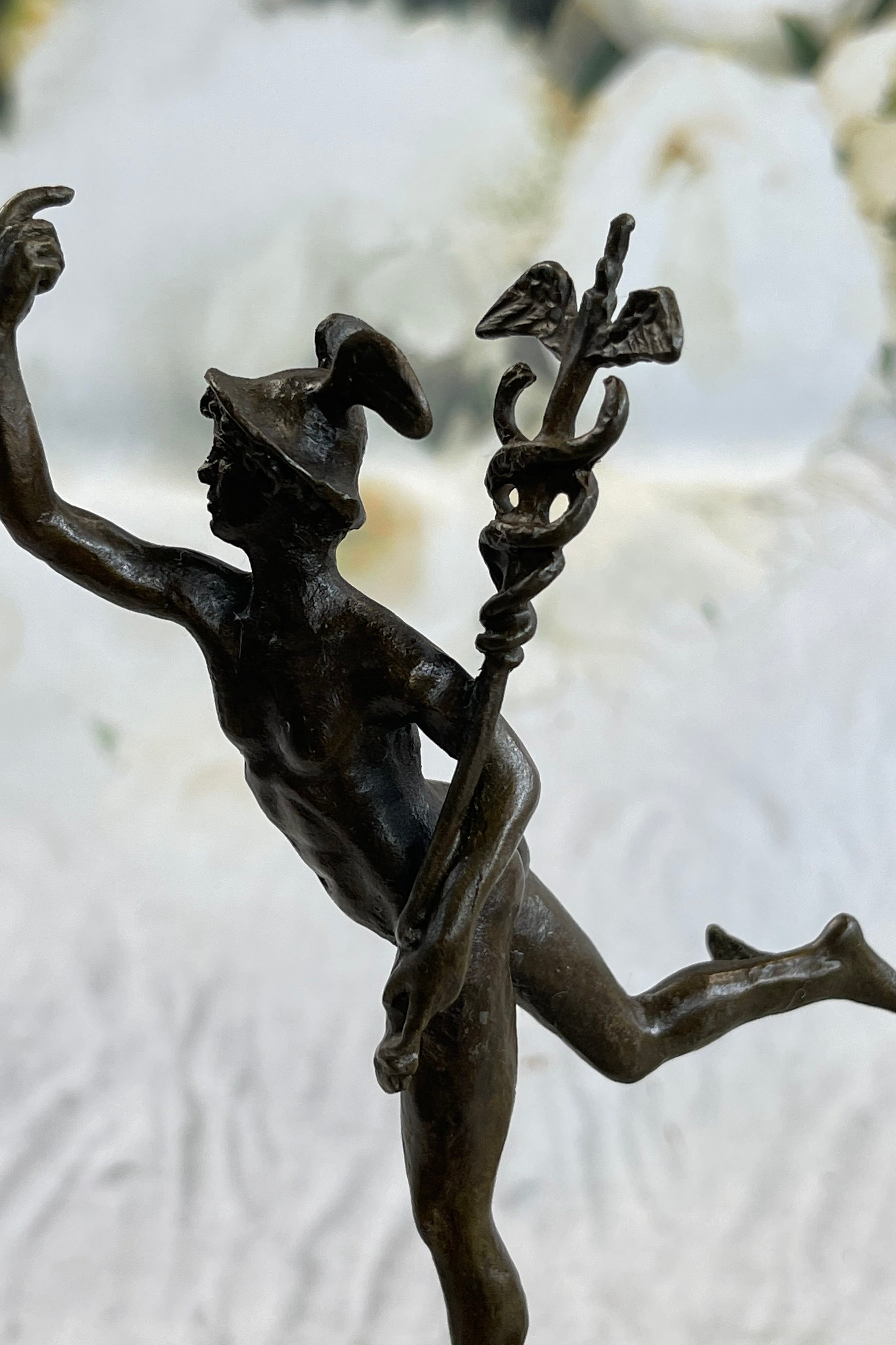 alchemy - alchemists were, at one time, referred to as the Sons of Hermes and alchemy blended in with early medical practice. He is caught in racing upwards in a winged fury to deliver his message to the gods. The emphasis on refined surface and cool elegance and beauty implicates Bologna's Mannerist style. This rendition was cast using the age-old technique of lost-wax casting and finished with a brown patina stain. It stands communicating the fables and messages of the antiquated gods upon a black marble base with the artist's signatureBronze Dimensions :Height 9" x Width 5"