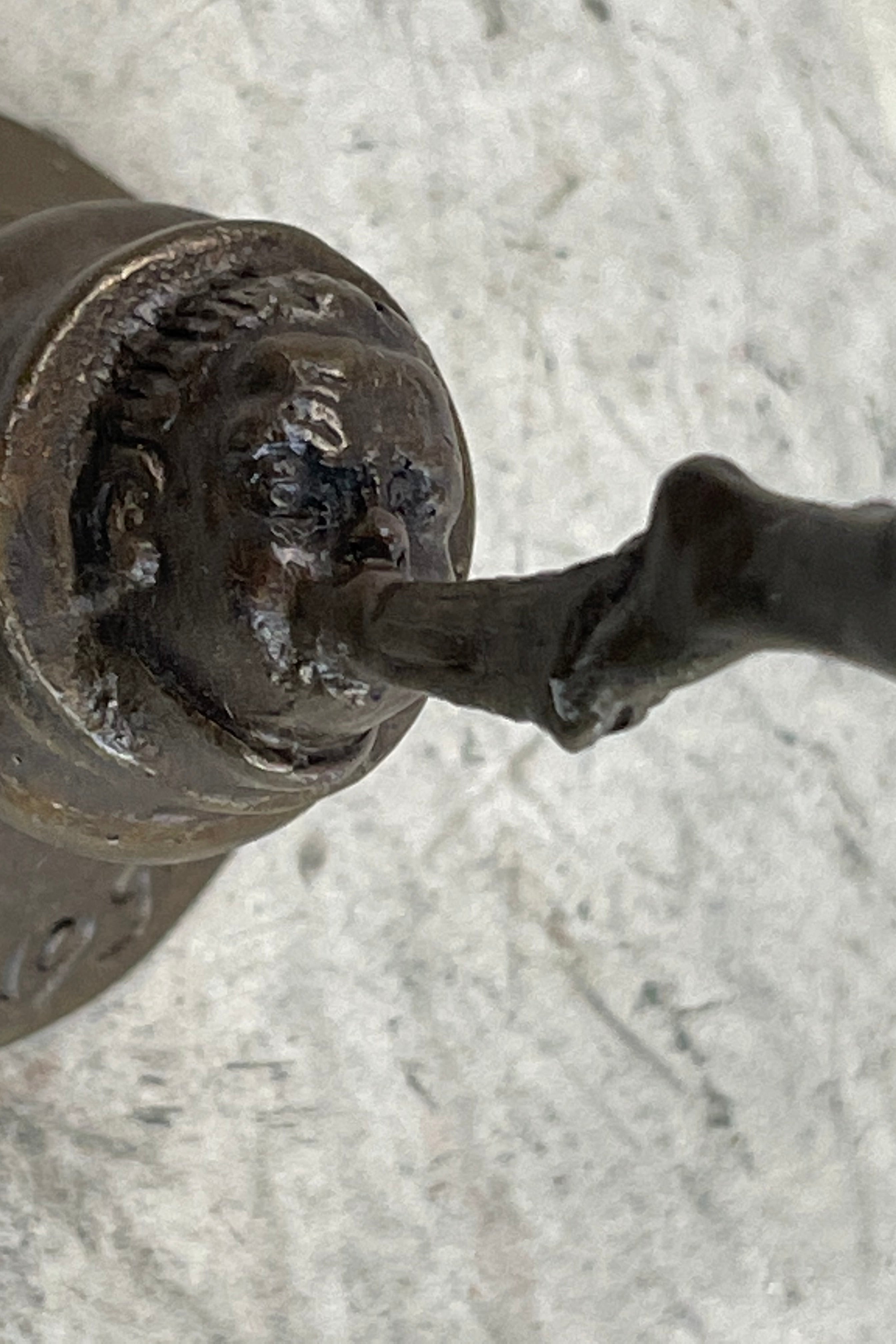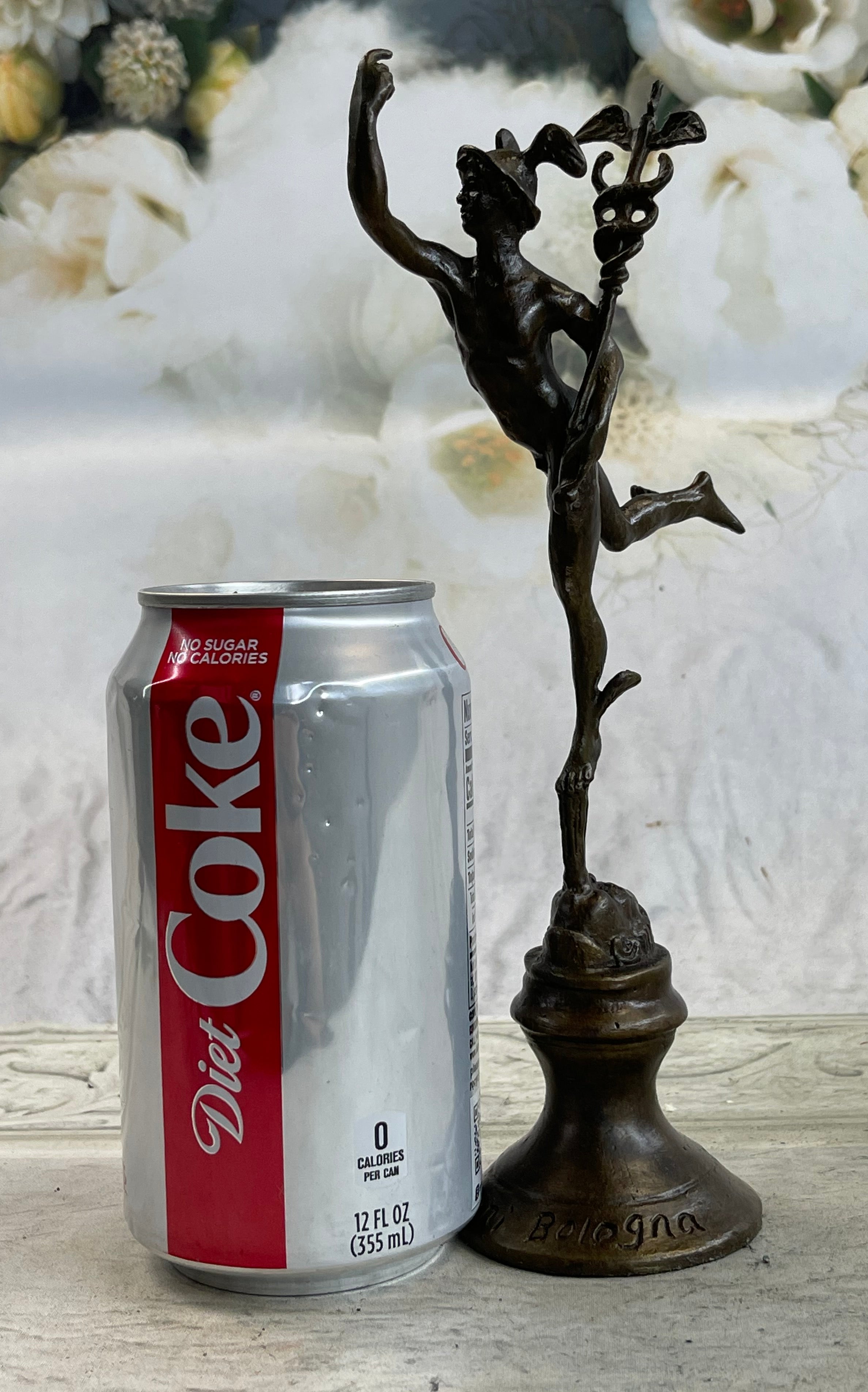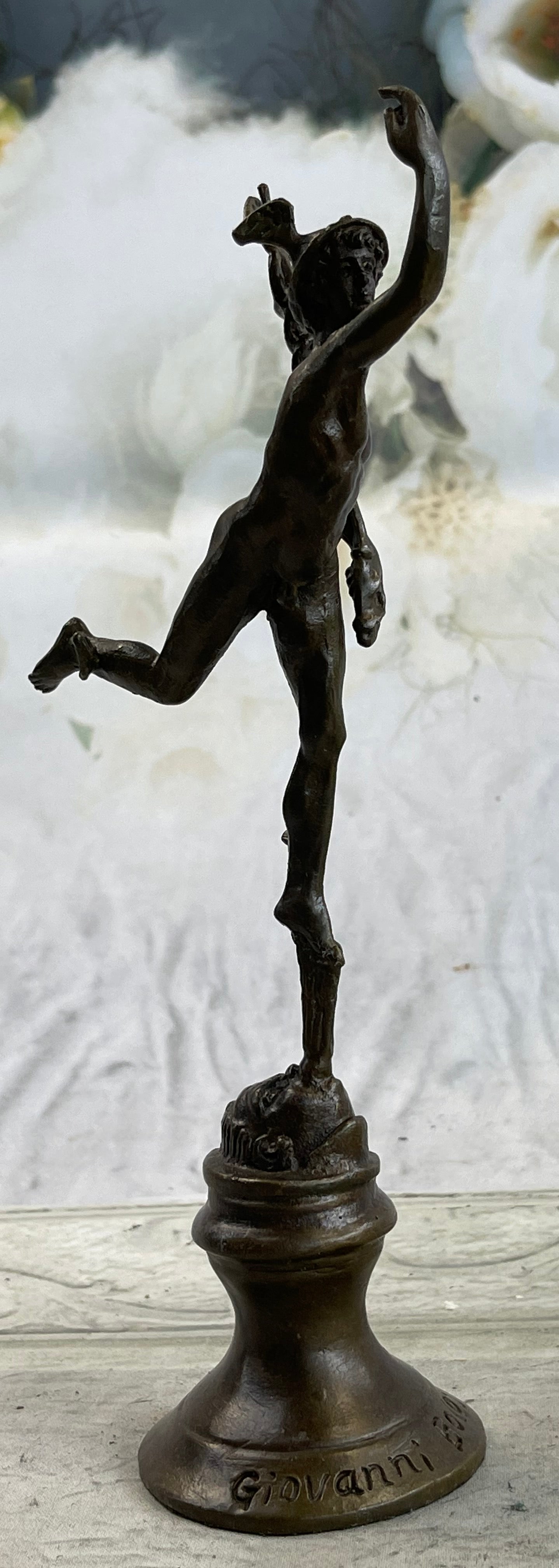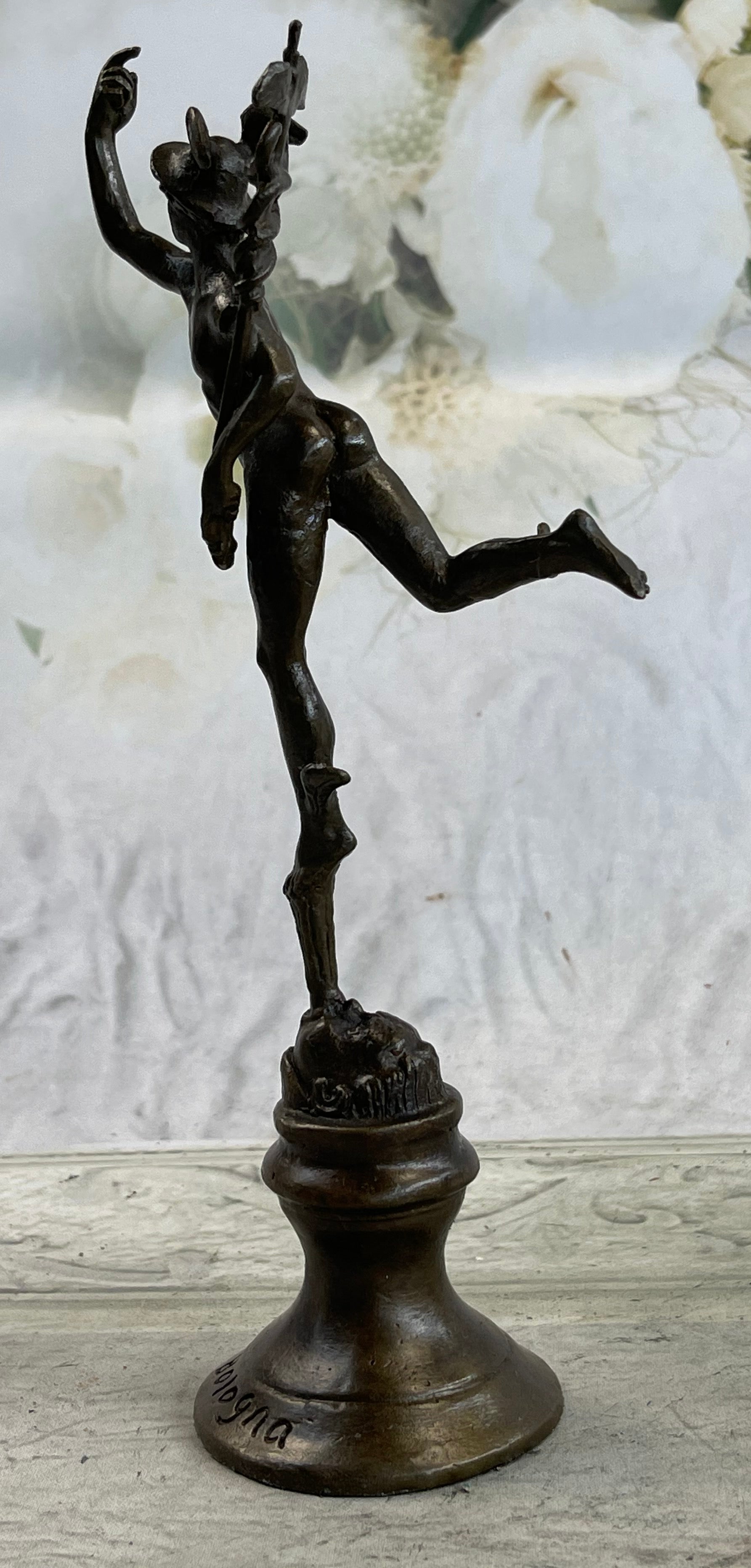 alchemy - alchemists were, at one time, referred to as the Sons of Hermes and alchemy blended in with early medical practice. He is caught in racing upwards in a winged fury to deliver his message to the gods. The emphasis on refined surface and cool elegance and beauty implicates Bologna's Mannerist style. This rendition was cast using the age-old technique of lost-wax casting and finished with a brown patina stain. It stands communicating the fables and messages of the antiquated gods upon a black marble base with the artist's signatureBronze Dimensions :Height 9" x Width 5"