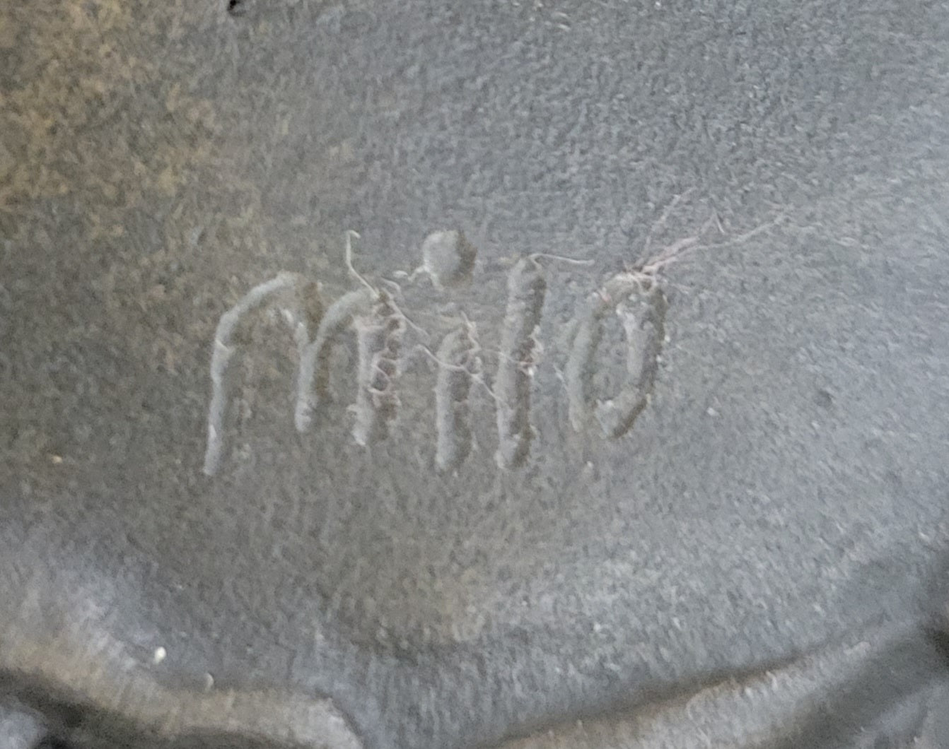 Finished with a rich brown patina and highlighted with gold accents on the dragon's scales, claws, and smoke plumes, this bronze sculpture exudes elegance and sophistication. It's more than just a decorative piece; it's a masterpiece that adds a touch of fantasy and mystery to your decor. Signed by the esteemed artist Milo, this dragon sculpture is a testament to both artistic craftsmanship and the timeless allure of dragons in mythology. Whether displayed in a living room, study, or office, this sculpture is sure to captivate the imagination and spark conversations, making it a treasured addition to any art collection.Bronze Dimensions Base: Height 6" X Width 7"