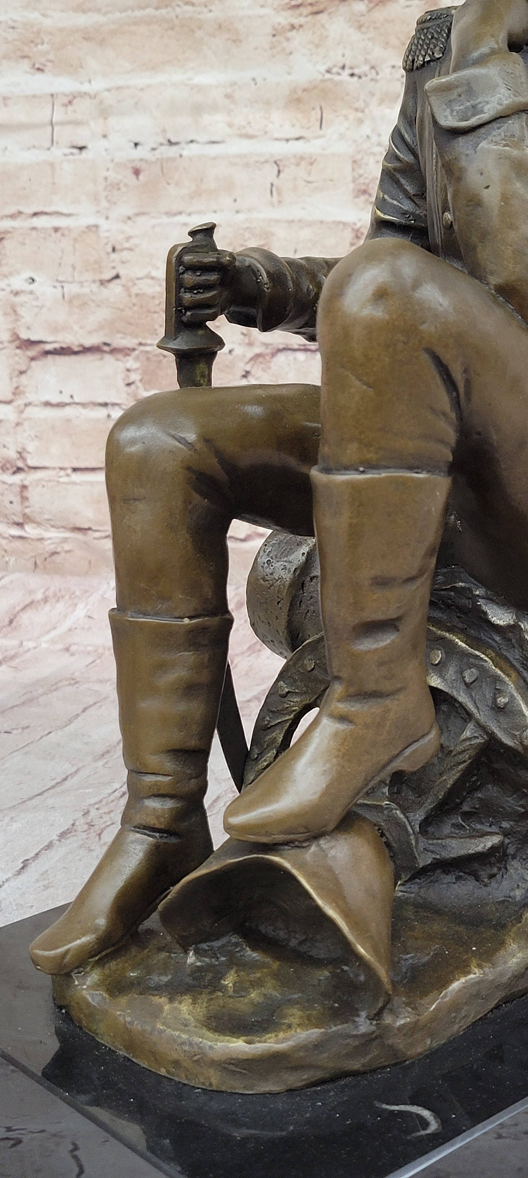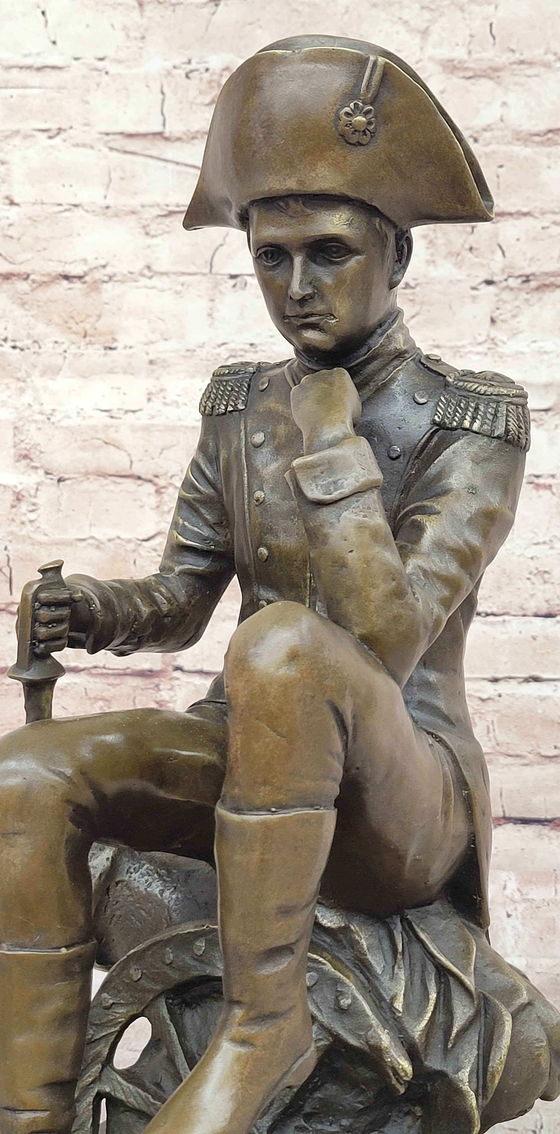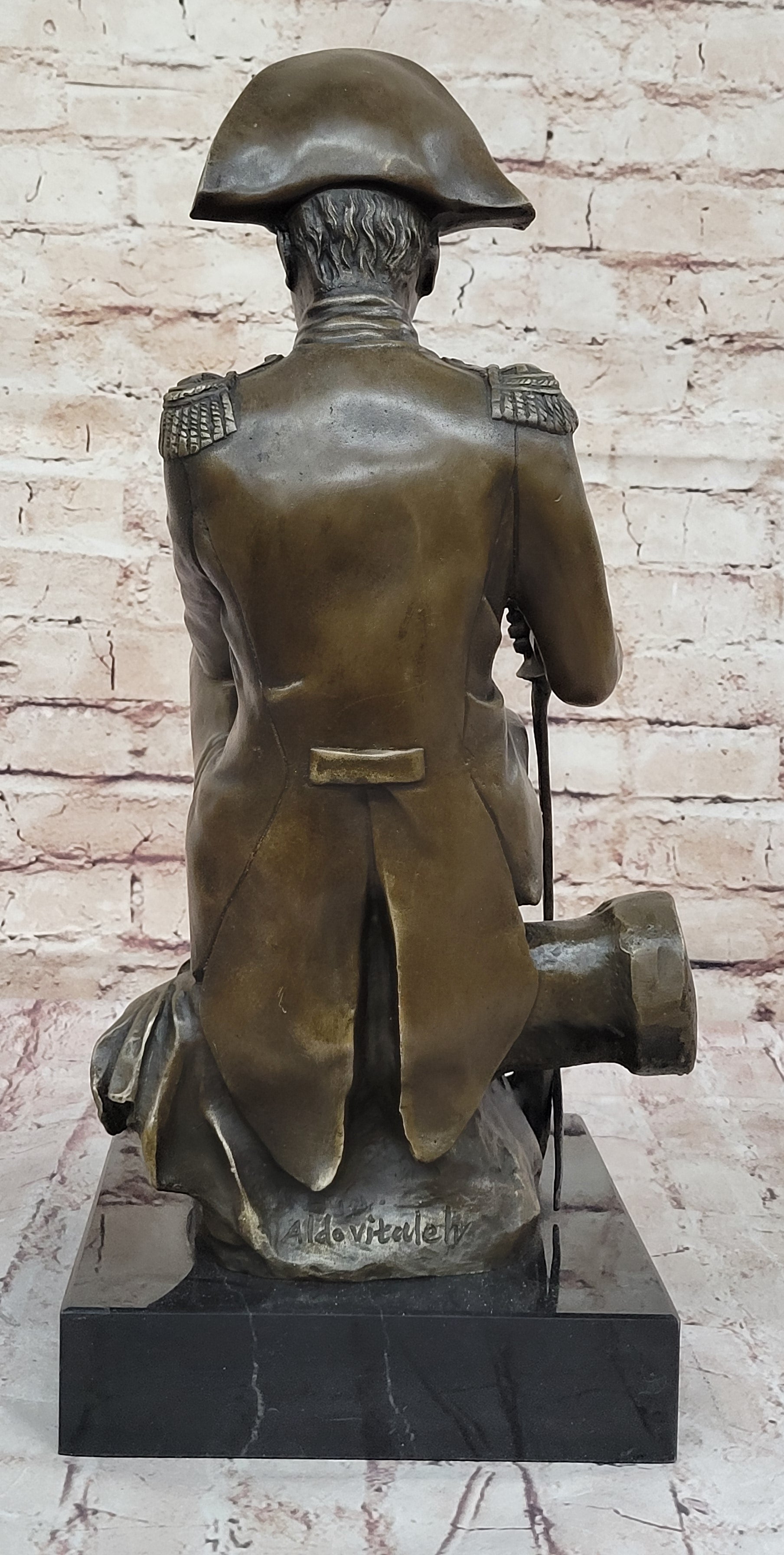 This bronze replica pays tribute to the commanding martial giant, Napoleon Bonaparte, Emperor of the French from 1804 to 1815. Known for his legal reconstruction, the Napoleonic code, and his leadership during the Napoleonic Wars, Napoleon left a lasting impact on European history. In this sculpture, Napoleon is depicted seated upon a cannon, his countenance bearing a forlorn expression as he reflects on his fate following his defeat at the Battle of Waterloo in June 1815. Despite his past victories and dominion over much of Europe, his ultimate downfall is evident in his somber demeanor. Crafted using the archaic method of lost-wax casting, this sculpture showcases meticulous attention to detail and is stained with a brown patina finish for preservation. Mounted upon a variegated black marble base bearing the signature of the artist Aldo Vitaleh, this replica serves as a poignant reminder of Napoleon's triumphs and tribulations throughout his tumultuous reign.