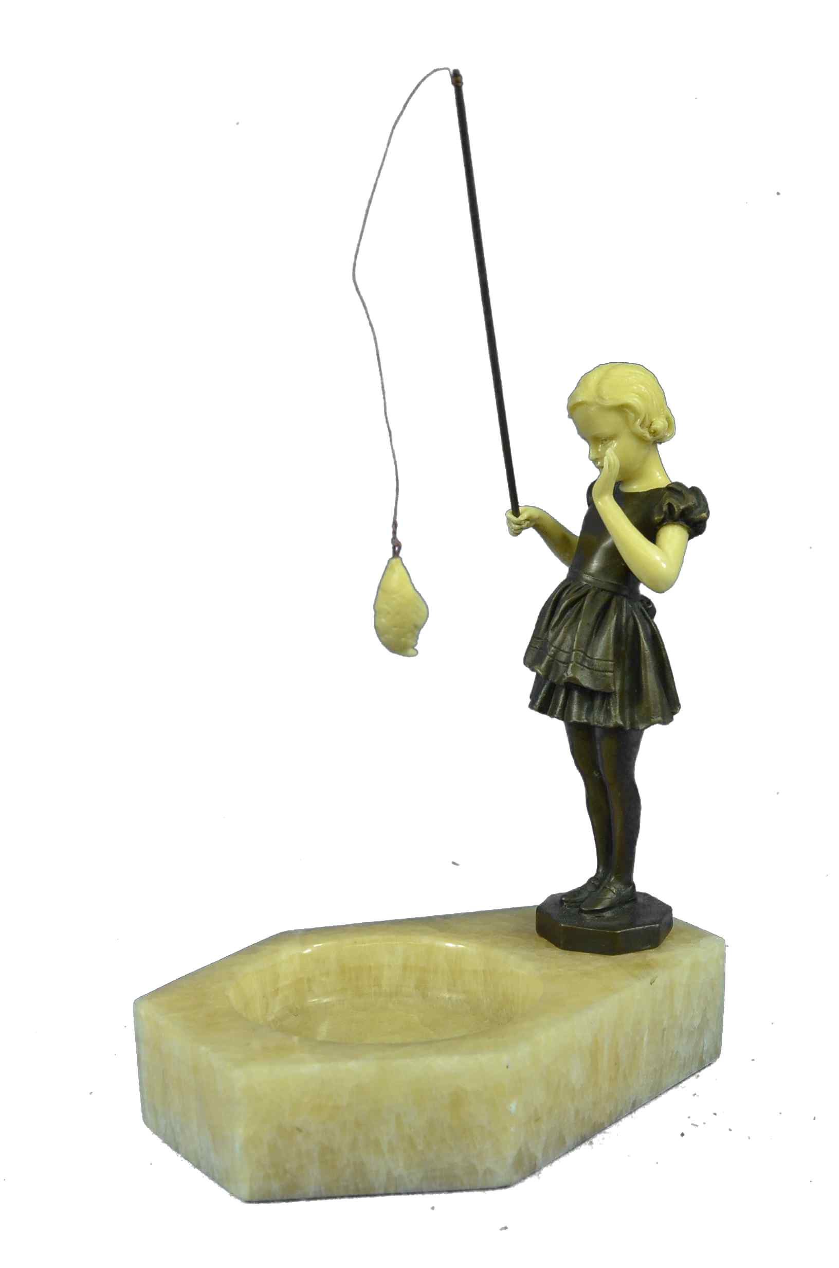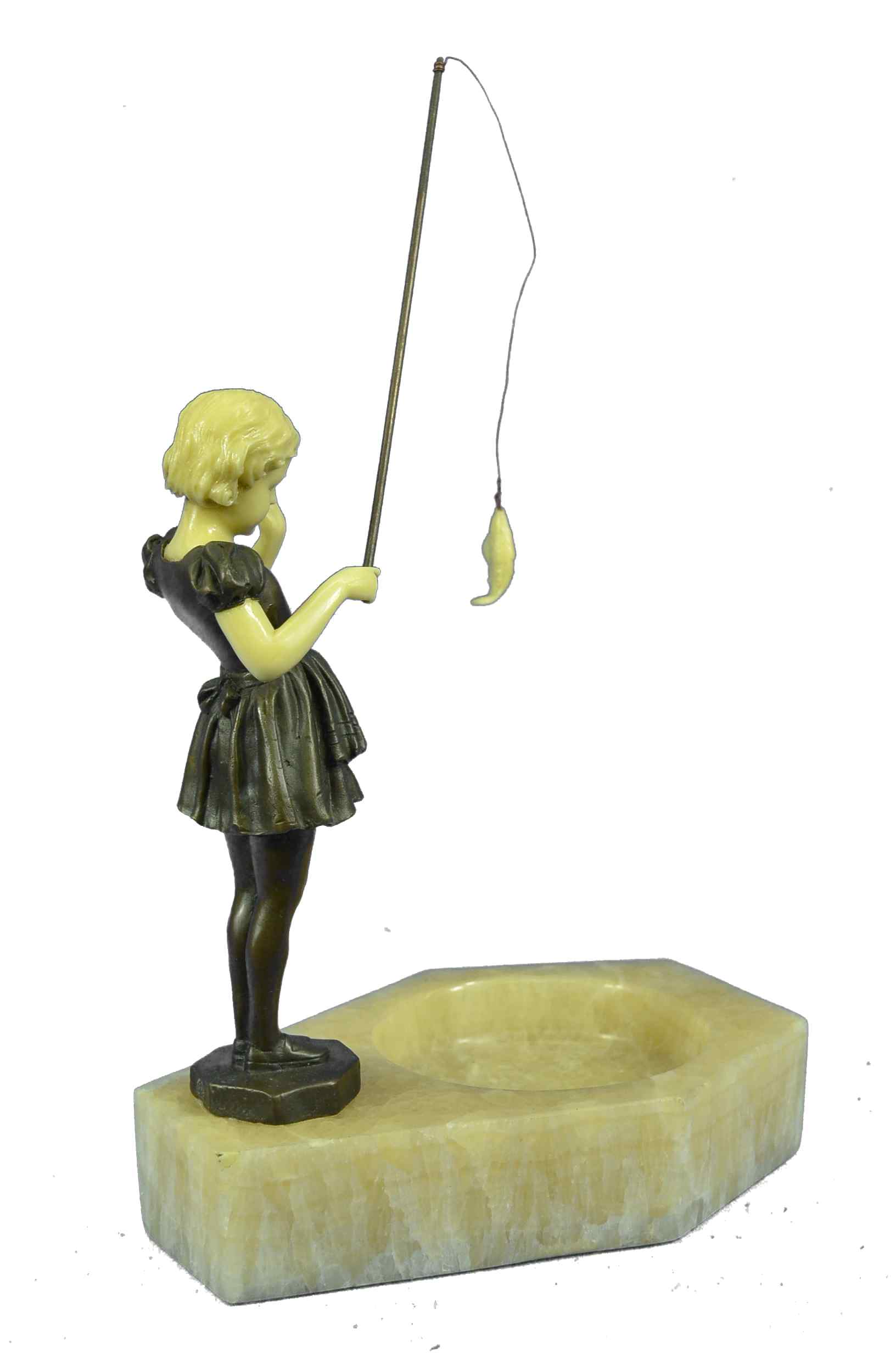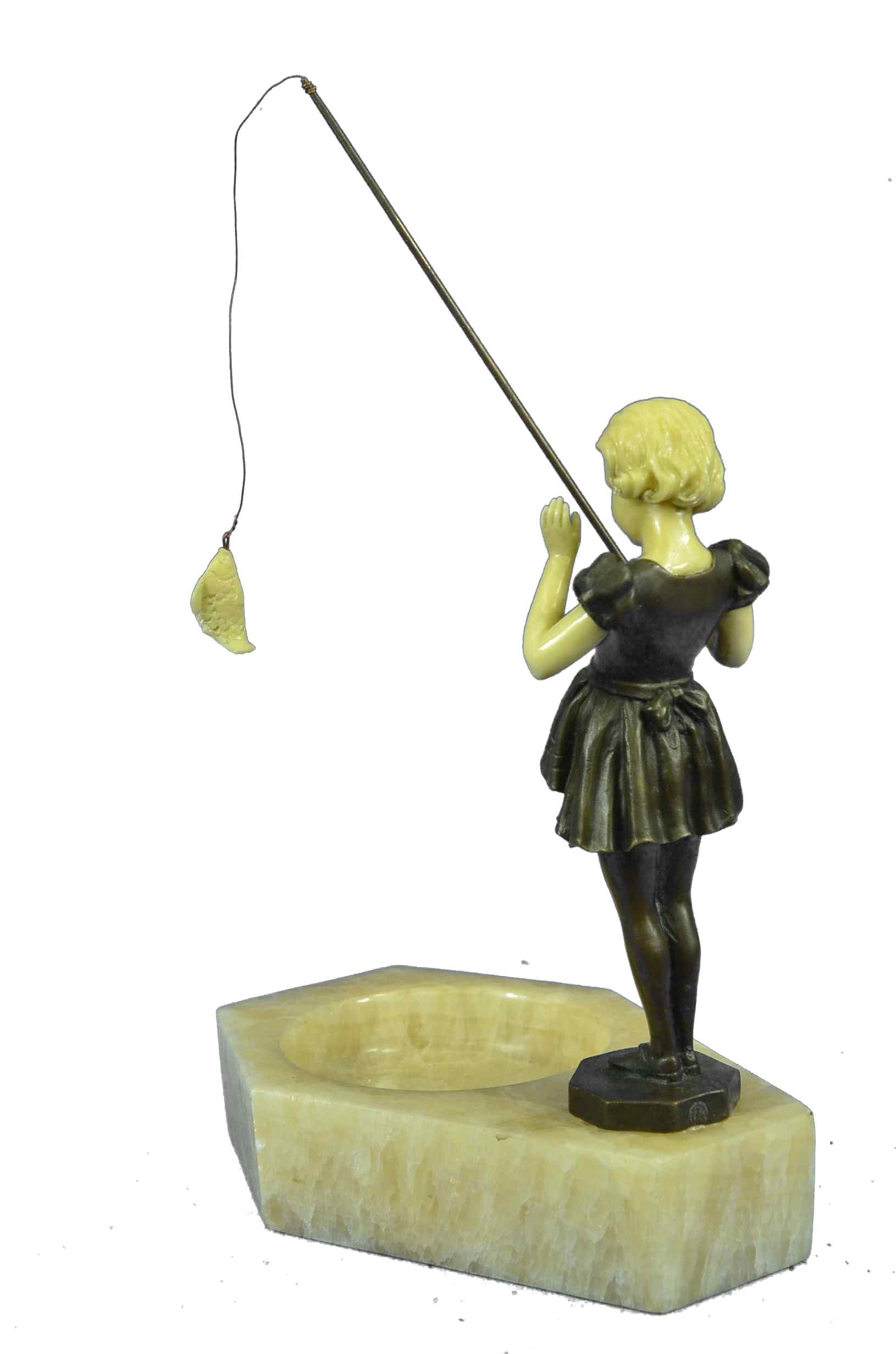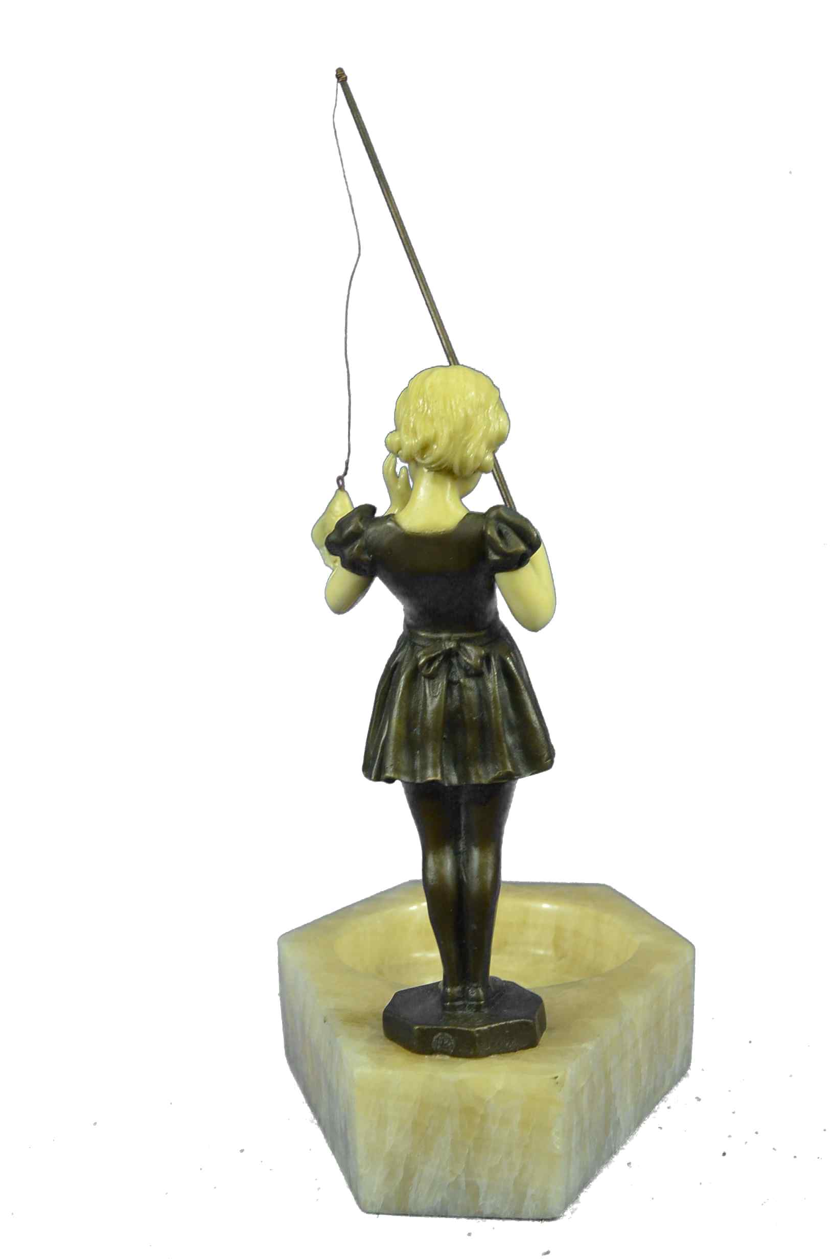 This is a Detailed bronze Collectible ashtray from Spain with a small girl Fishing. The small fishing girl is a replica of the famous statue of German artist Preiss", who is standing over the ashtray. The ashtray is Handmade of 100% bronze and resting on a solid White marble base this sculpture has a two tone brown patina and is cast using the ancient "Lost Wax Method". This sculpture is signed Preiss.Original or Reproduction: Reproduction