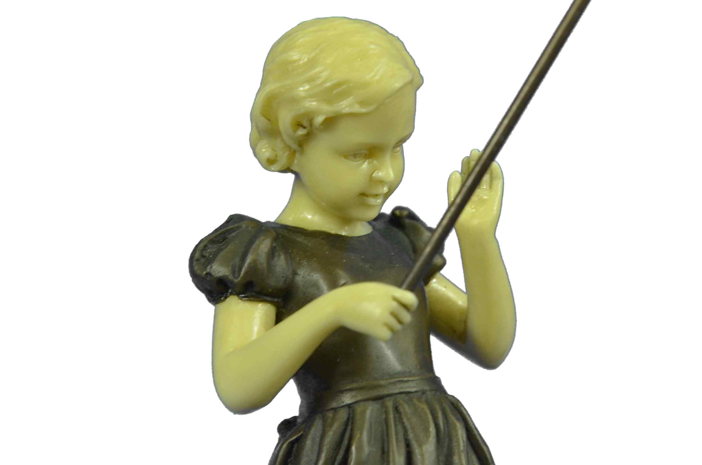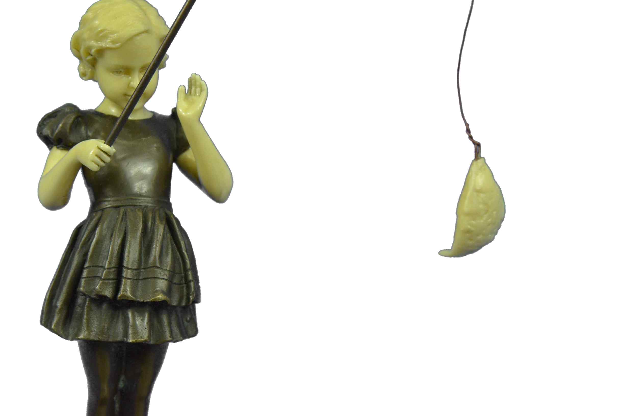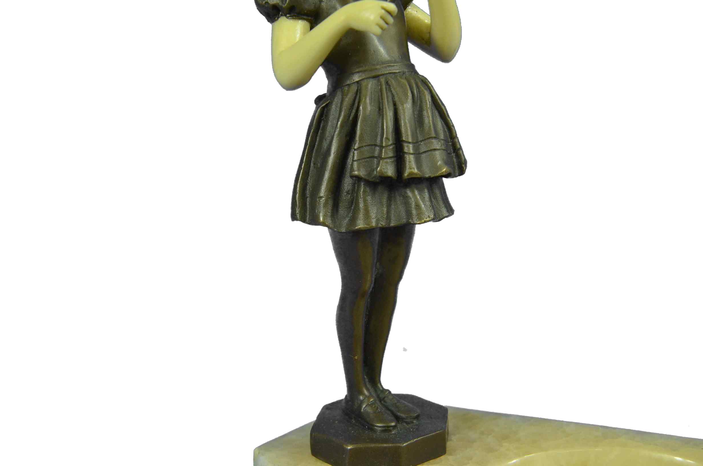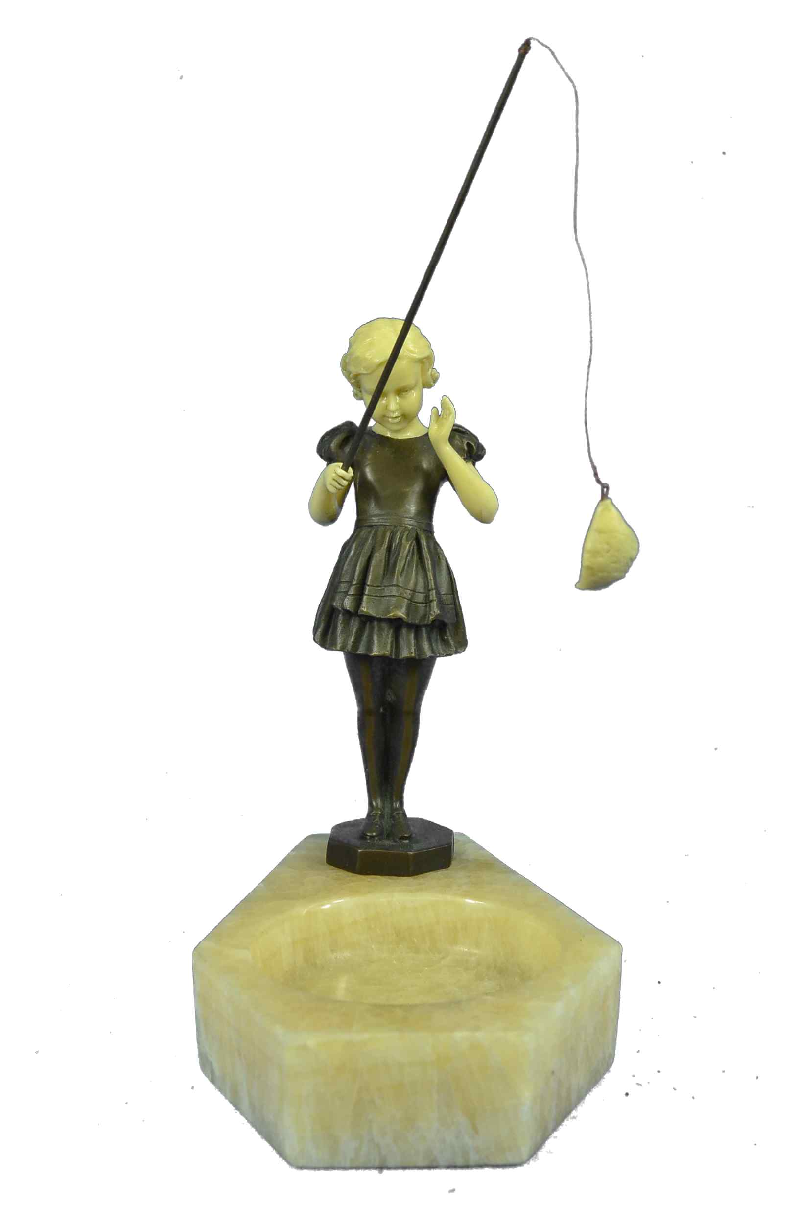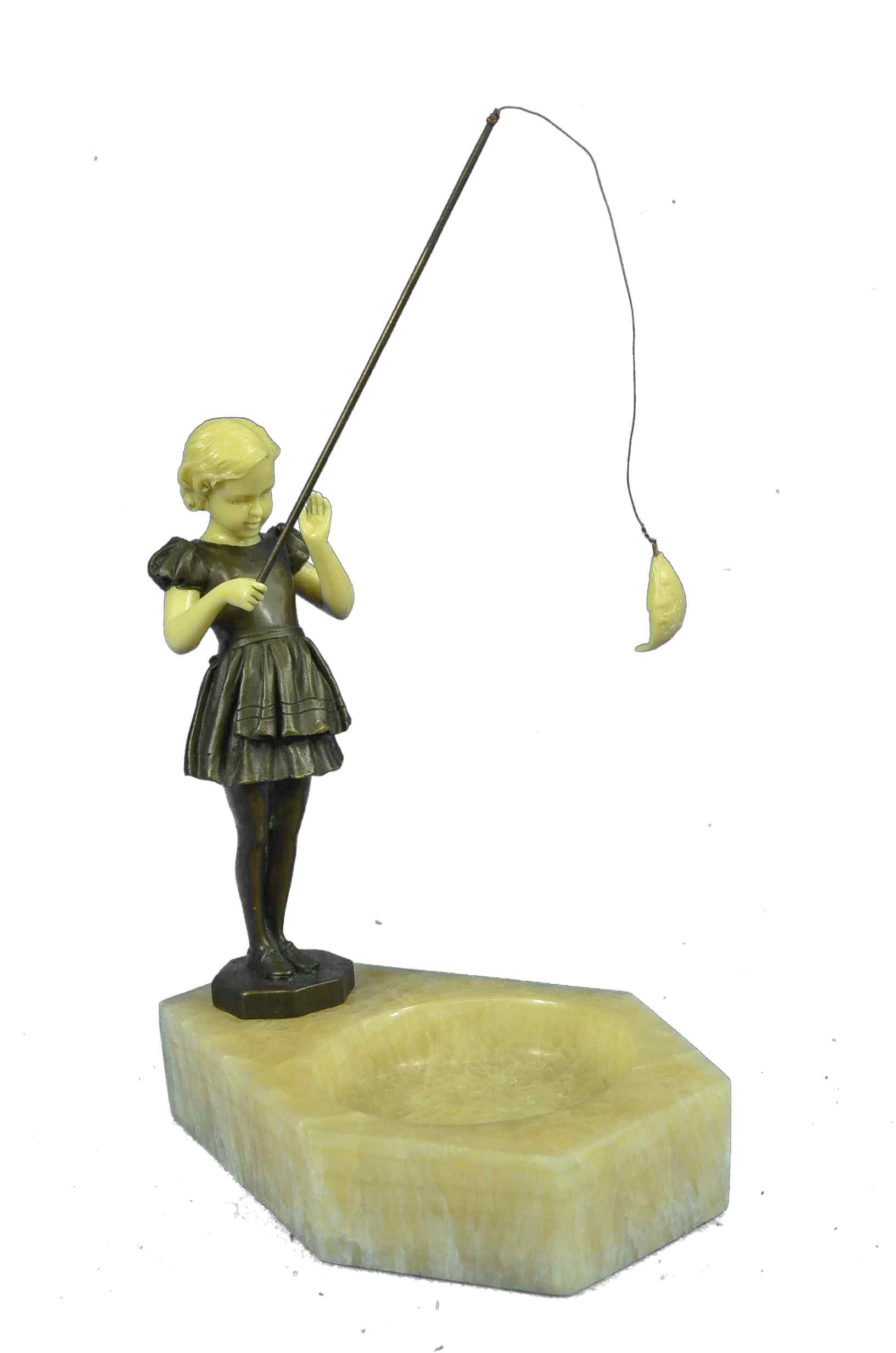 This is a Detailed bronze Collectible ashtray from Spain with a small girl Fishing. The small fishing girl is a replica of the famous statue of German artist Preiss", who is standing over the ashtray. The ashtray is Handmade of 100% bronze and resting on a solid White marble base this sculpture has a two tone brown patina and is cast using the ancient "Lost Wax Method". This sculpture is signed Preiss.Original or Reproduction: Reproduction
