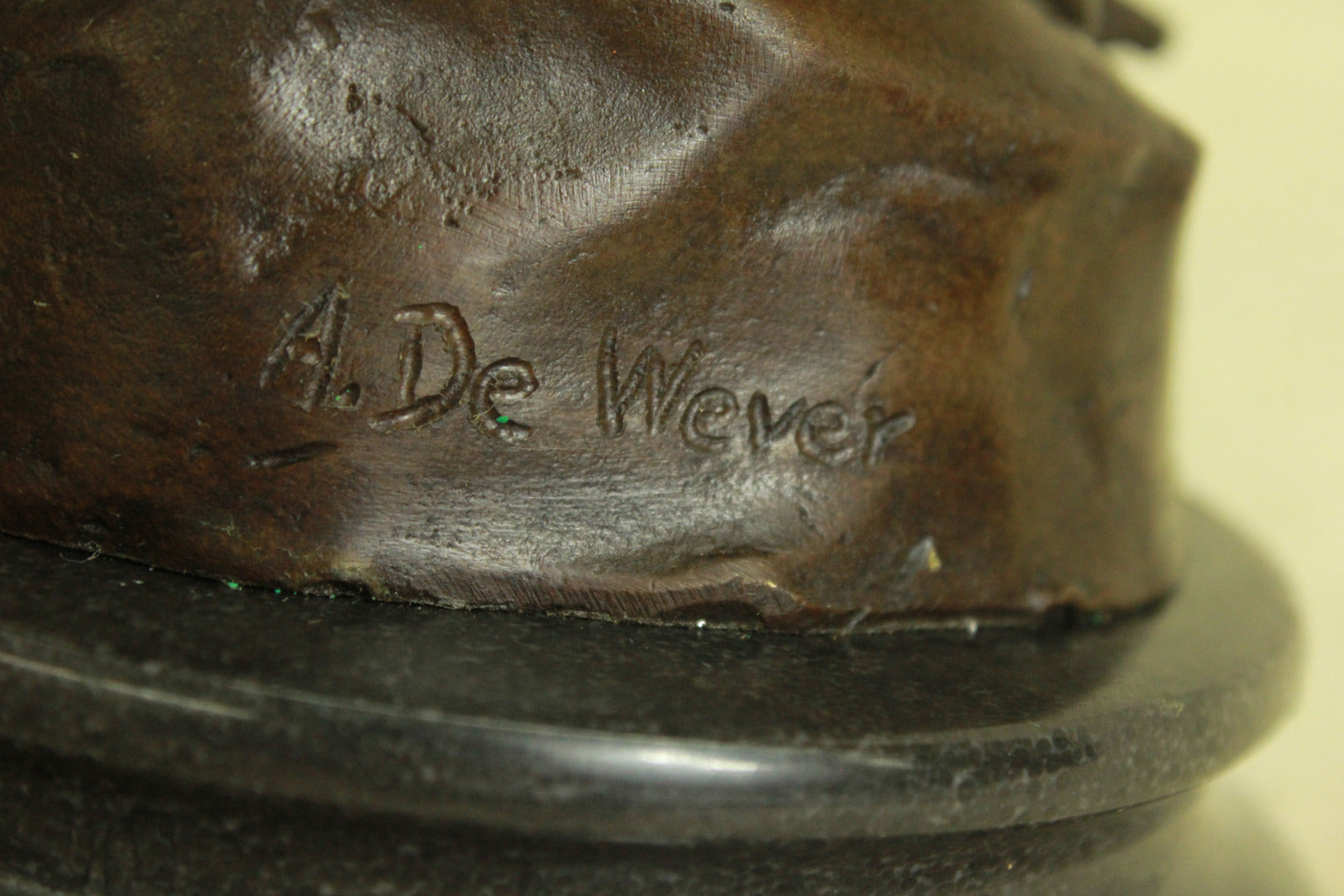 Auguste de Wever (Belgian 1836-1884): A Parcel real Bronze Figure of a boy having forged the Sword of Nothung, sitting and wearing a large sword and holding his hammer over an anvil on a tree stump in his right hand, broken arms at his feet. This powerful sculpture is finished with brown patina and is mounted upon a black marble base signed A. De Wever. The Art of Lost WaxMarble Dimensions: Diameter 5"