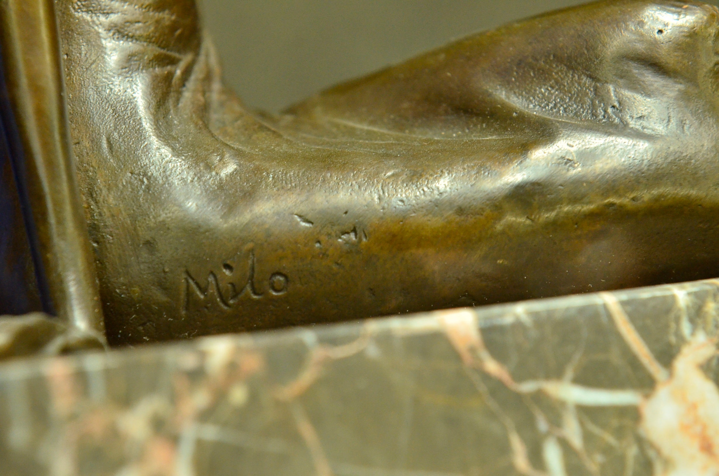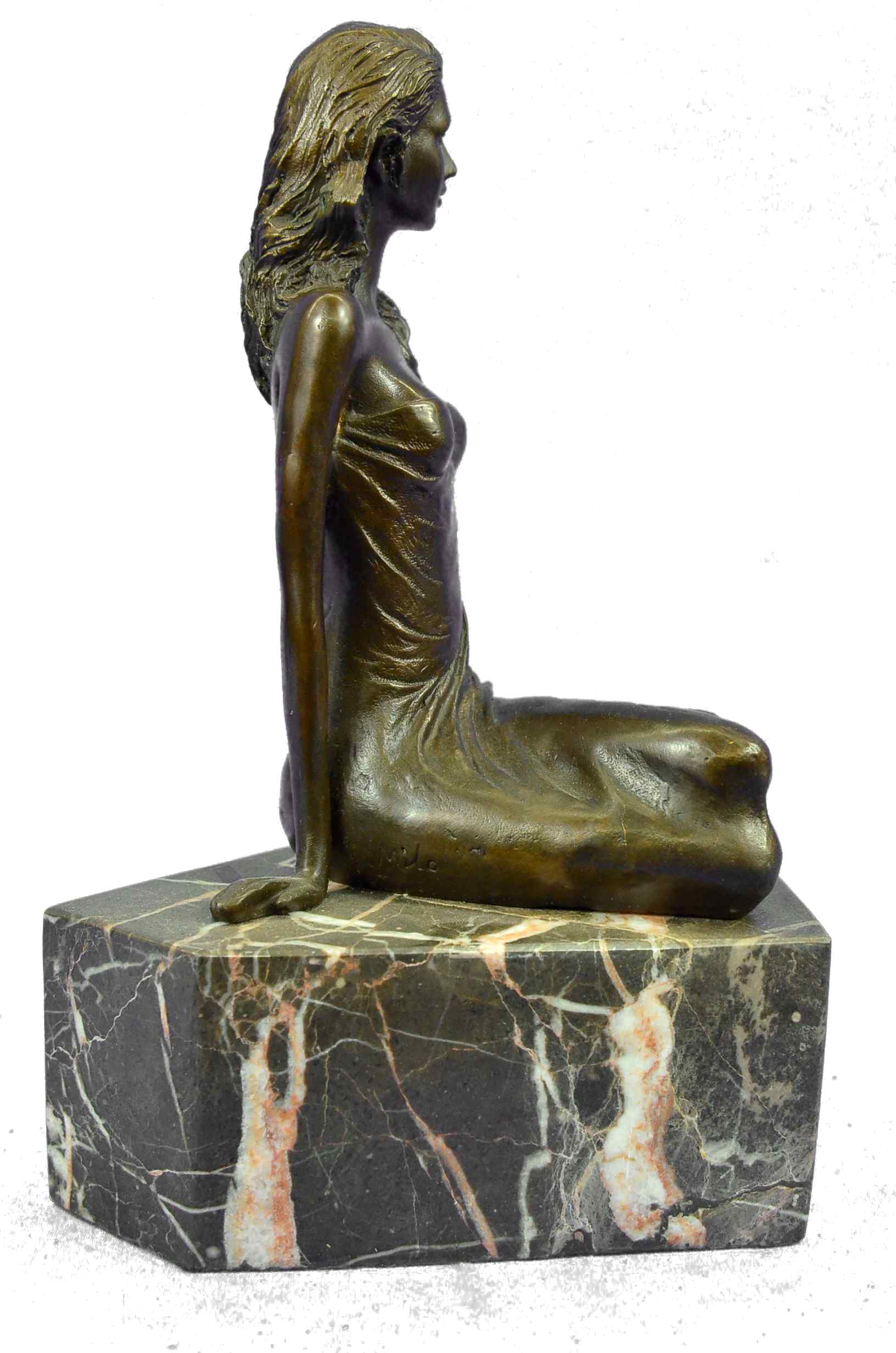 Sitting Provocatively Yet Elegantly, A Confident Young Woman Reveals Her Long Curvy Legs And Dressed Seductively To Stir Envy Amongst Other Women And To Provoke Lust Amongst Men Whom Indulge Her Beauty. A Figure Of Feminism, The Woman Holds Tremendous Power To Draw Men To Her Toes By Nothing More Than A Glimpse Of Her Golden Skin, The Handmade Bronze Sculpture Was Cast Using The Archaic Method Of Lost-Wax Casting And Stained With A Brown Patina Finish For Perpetuation. She Is Mounted Upon A Brown Marble Base And Is Signed By Artist Milo.Bronze Dimensions with Marble Base:Height 9" x Width 7"