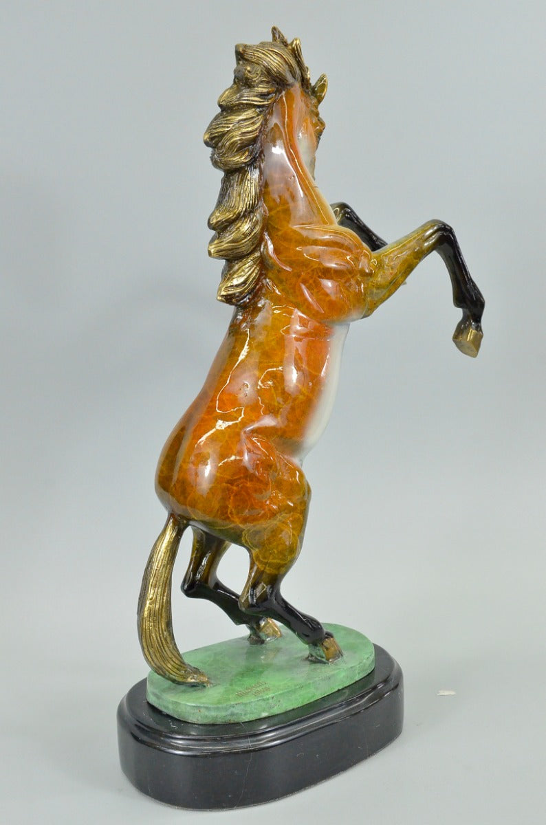 This is a majestic sculpture of a Limited Edition rearing horse. Likely to be a stallion he rears himself up high as he releases a loud neigh with his ears back. He is lean and toned each muscle distinguishable and in this stance you can see the power and strength involved. The horses main and tail are long and whimsical, his tail reaching the ground. A broken tree stump is next to him, a branch extended out along his body, detailed with rings and stubs. He is made of 100% solid bronze and rests upon a solid black marble base. Cast using an ancient technique called the "Lost Wax Method". A multi tone color patina is used and is signed by artist Marius.Original or Reproduction: Original
