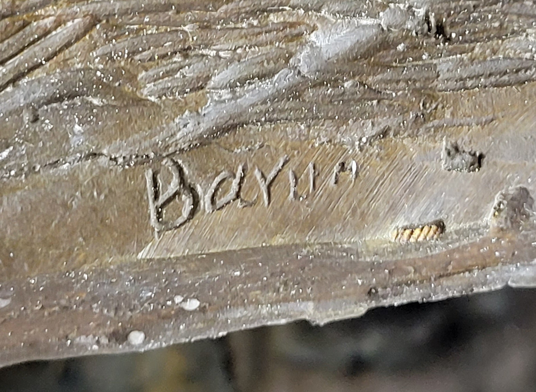 This incredibly detailed wall piece will be the focus or wonderful addition to any country style area. The Ram`s defining features shine in this sculpture: a thick mane, prominent mouth and nose, and bulging eyes. The sculpture is reminiscent of the precious image of a Ram sticking its head out of the barn door waiting to be touched. This piece was crafted using the lost wax method. It is signed Barye.Bronze Dimensions :Height 19" x Width 19"