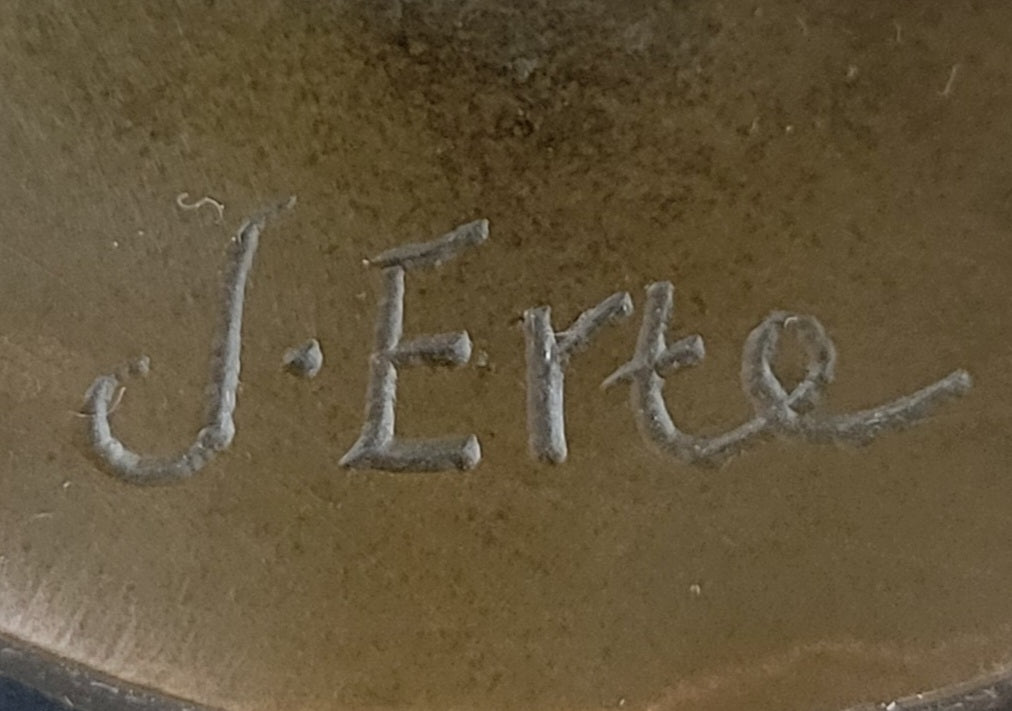 Mounted on a round black marble base, the sculpture offers a refined presentation that complements its rich color tones and intricate details. A true testament to the artistic brilliance of Erté, this piece is a perfect addition for collectors and admirers of Art Deco design, bringing a touch of vintage sophistication to any space.Bronze Dimensions with Marble Base: Height 20" X Width 6"