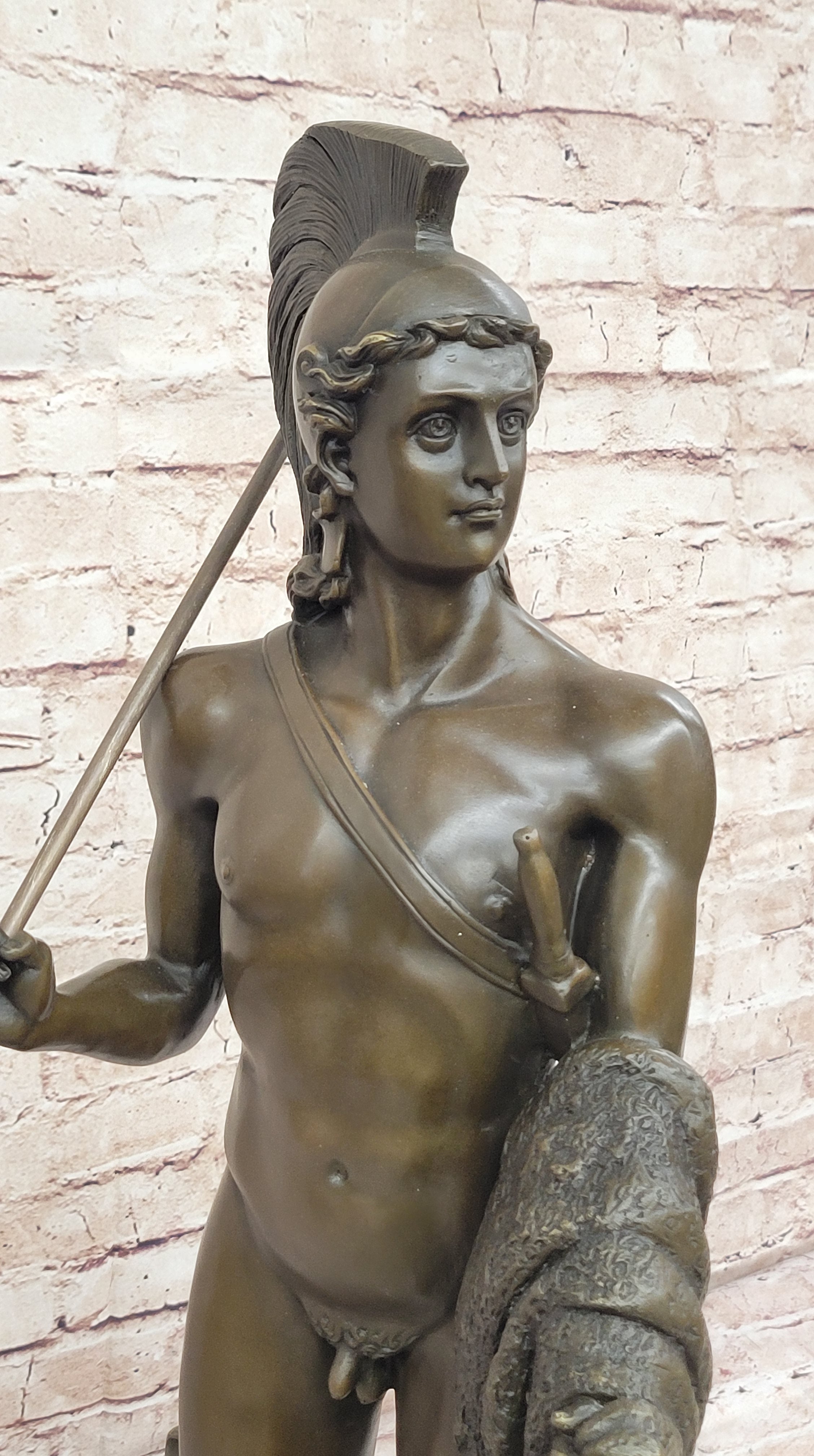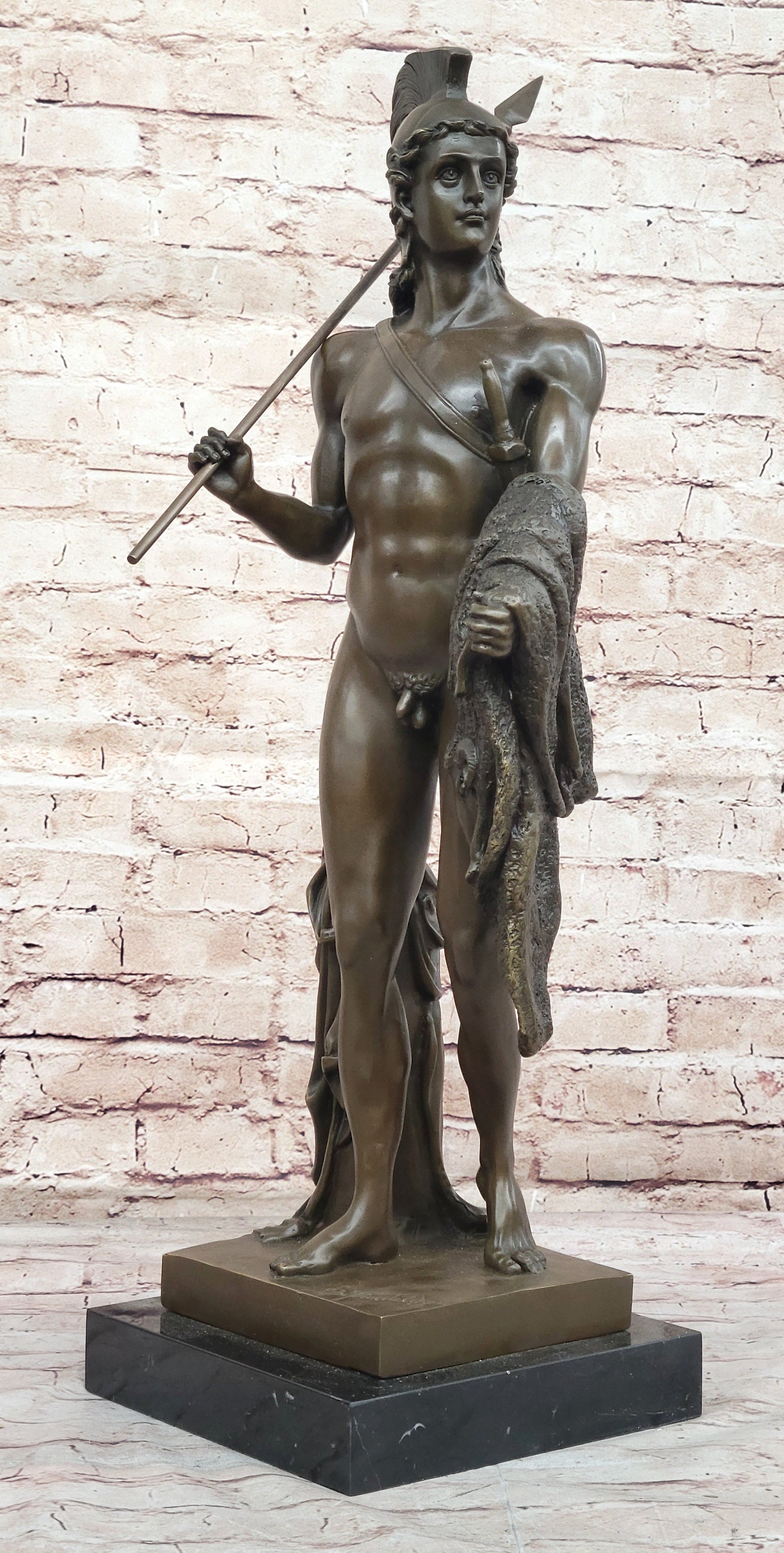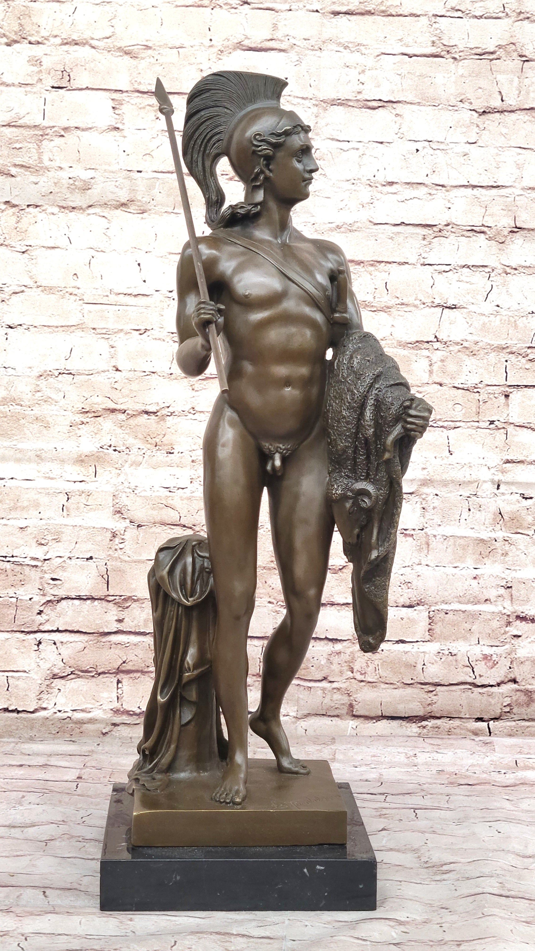 A symbol of courage, adventure, and triumph, Jason with the Golden Fleece embodies the heroic spirit of ancient mythology. This iconic portrayal serves as a reminder of the enduring power of myth and legend to inspire and captivate the imagination. With its timeless appeal and masterful craftsmanship, this statue is a testament to the enduring legacy of classical artistry.Bronze Dimensions with Marble Base: Height 26" X Width 10"