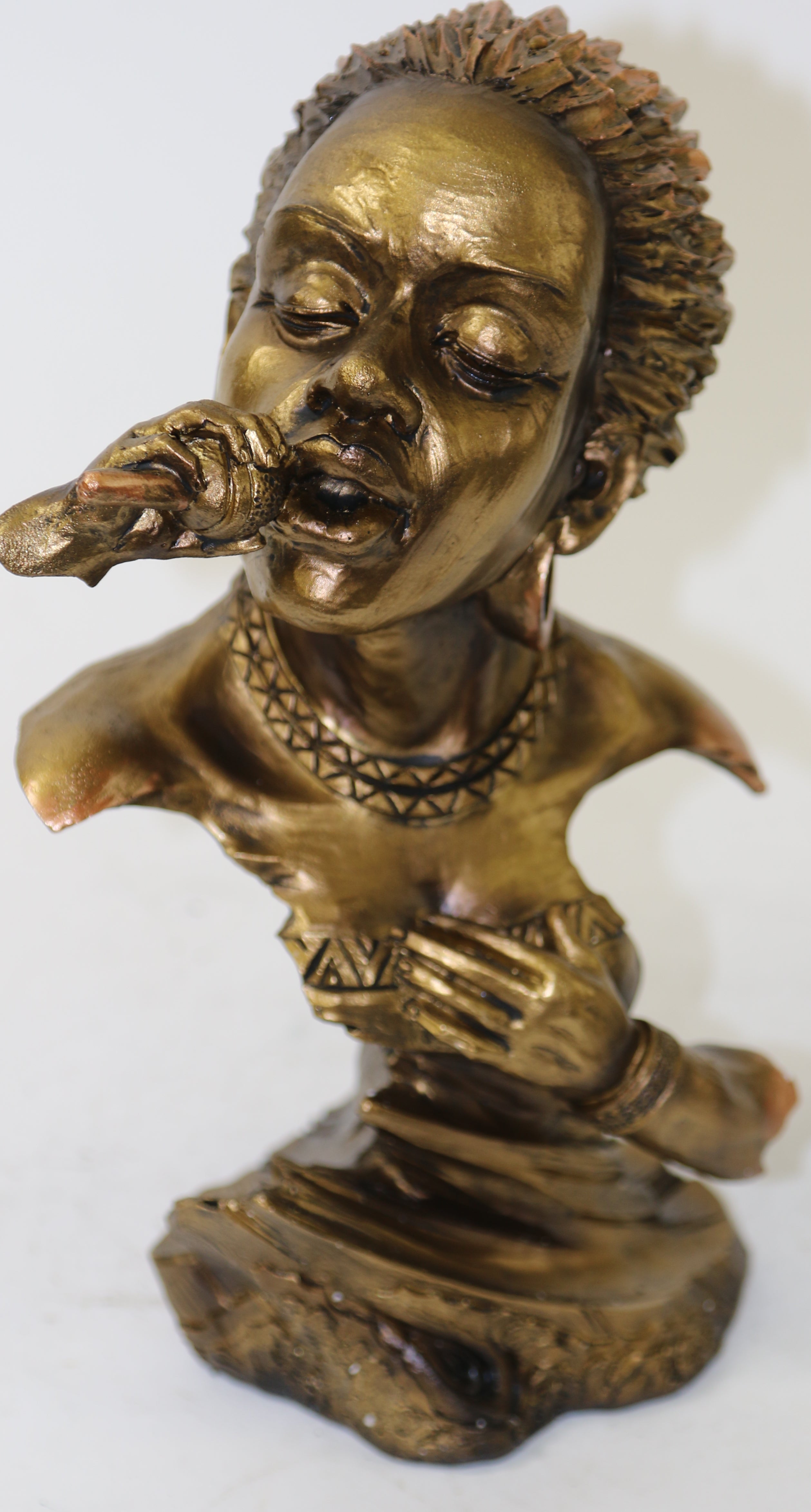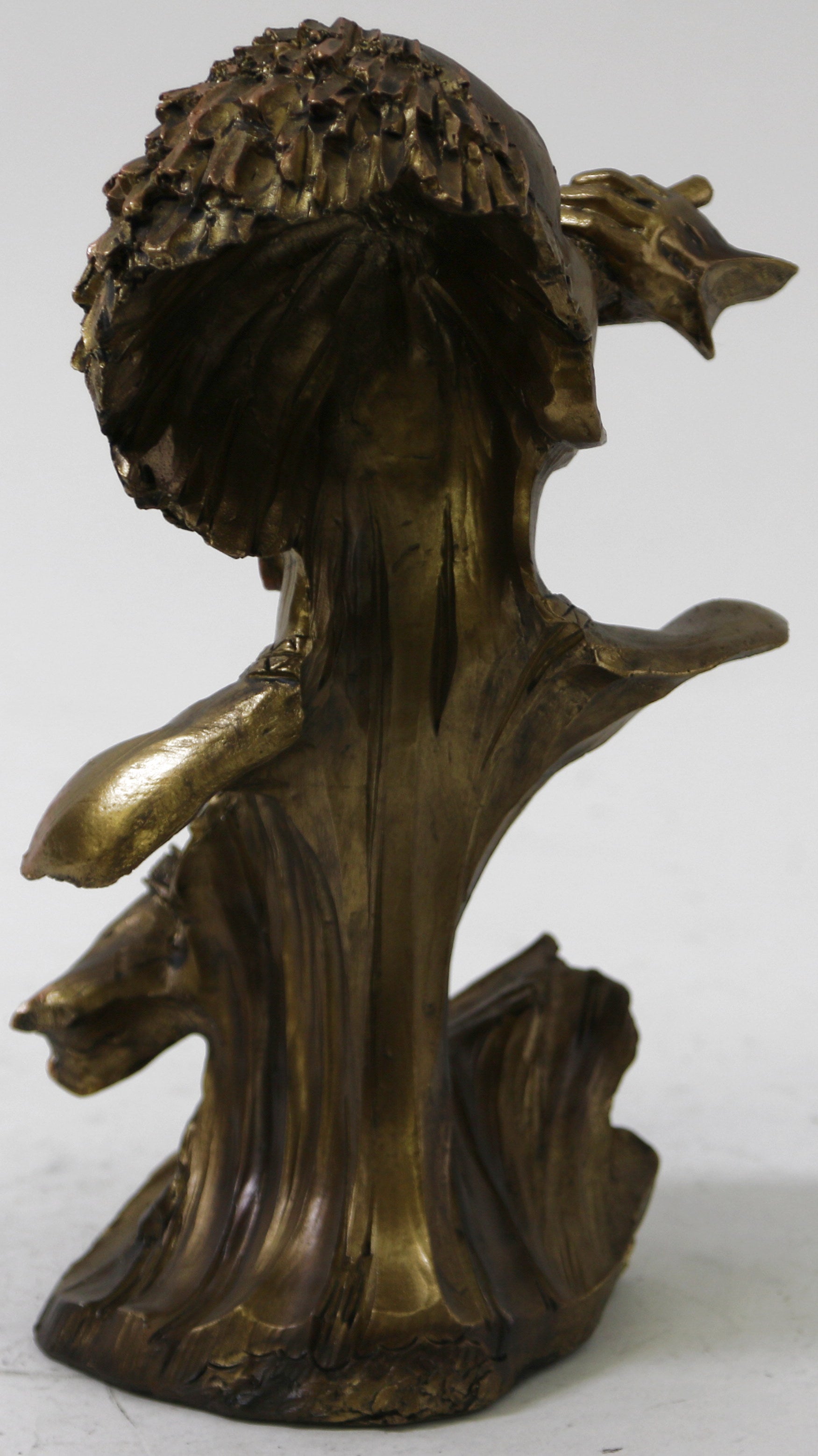 Cold cast bronze: A modern method of casting sculptures in which the casting material is a resin mixed with real powdered bronze. The finished sculpture has a surface which looks very similar to a traditionally cast bronze although it tends to be much lighter. It is a preferred method for achieving high quality of detail and finish and also to keep the weight down.Height :9"