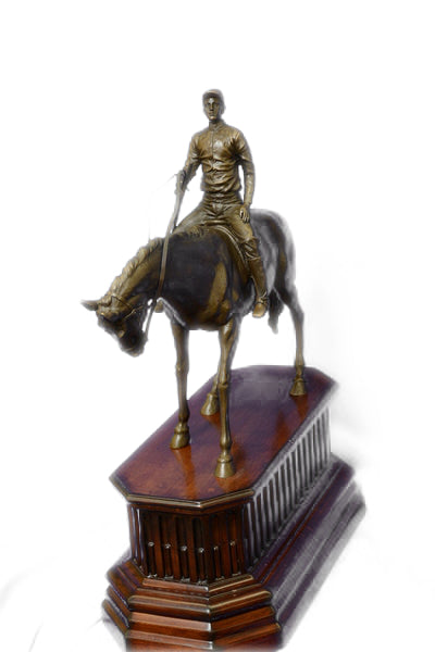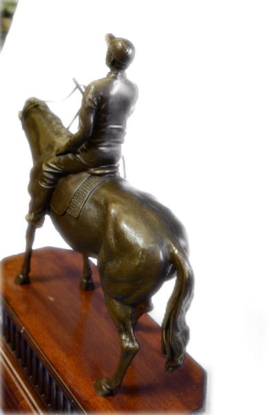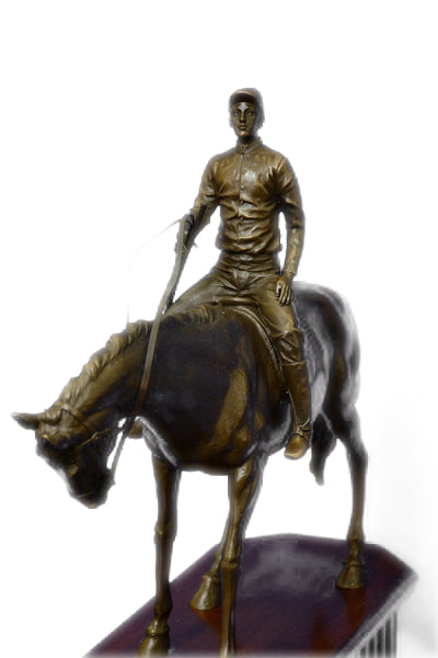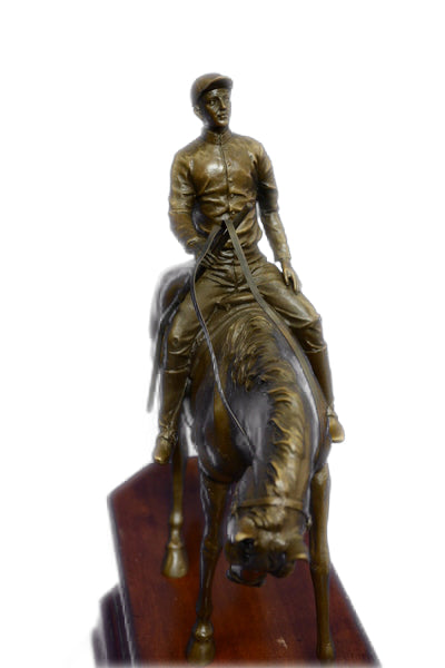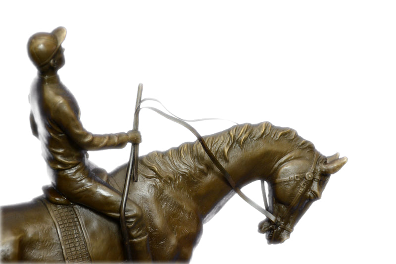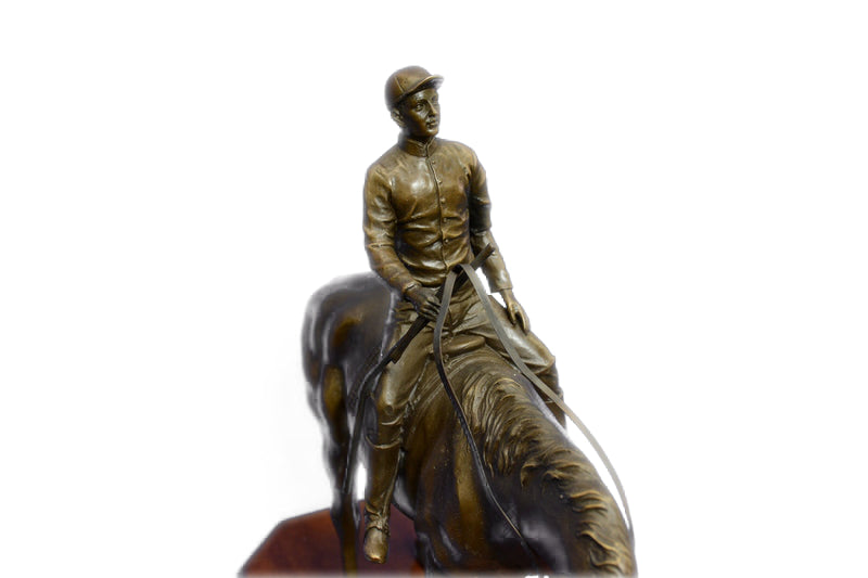 JOCKEY RIDING HORSE BRONZE STATUE FIGURE FIGURIN HOT CAST MARBLE BASE SCULPTURE
