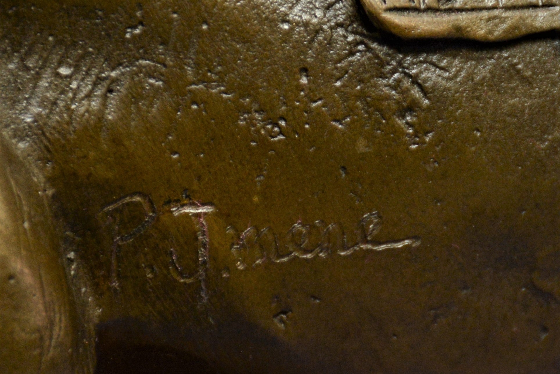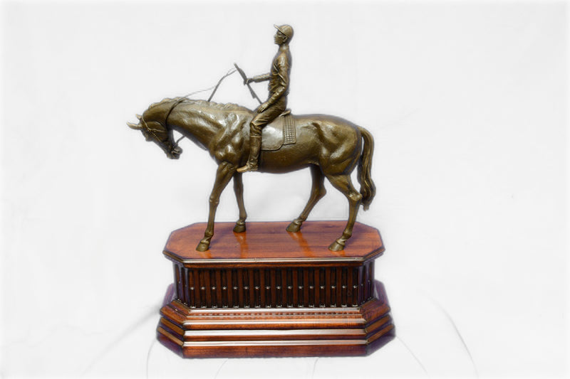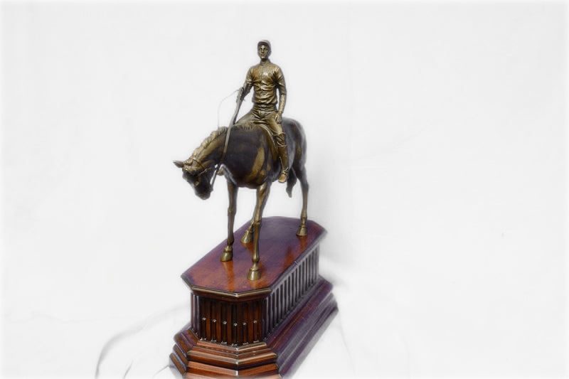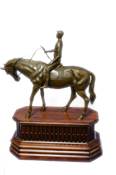 Are you ready for the race of your life? This thoroughbred and jockey are on a mission to win first place. In full stride this horse gallops his way to a fast finish. Running on a grass track this horse refuses to lose this derby. He exerts full speed as he pushes against the wind, his tail fly’s back with force, as the jockey encourages his partner to go full speed ahead. The jockey and the Horse both wear a look of determination as they stare down the finish line. The Horse lets out a neigh while pushing himself to the limit. Beautifully detailed his muscles are hard as he runs, his chest bulges with energy. The grass seems to be untouched with hoof prints assuming our horse has the lead. The jockey stays concentrated as he kicks his heels inward, keeping his feet in the stirrups. This is a great action piece and deserves to be displayed up front and center on a glory wall. This is a great gift to give for an avid horse lover it is also suitable for the person with drive in their life. he handmade bronze sculpture was cast using the age-old method of lost-wax casting and stained with a brown patina finish for perpetuation. He is mounted upon a Walnut wooden base and is signed by artist p.j Mene.Bronze Dimensions with Wood Base:Height 21" x Width 16"