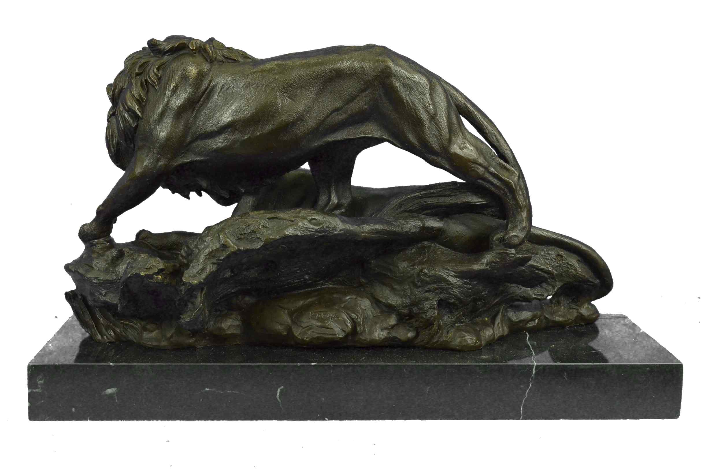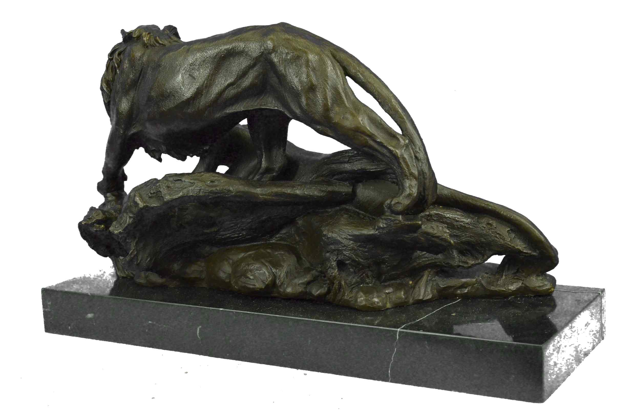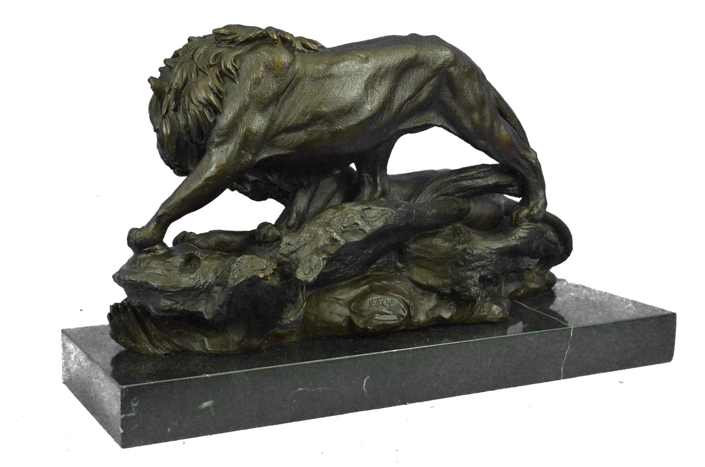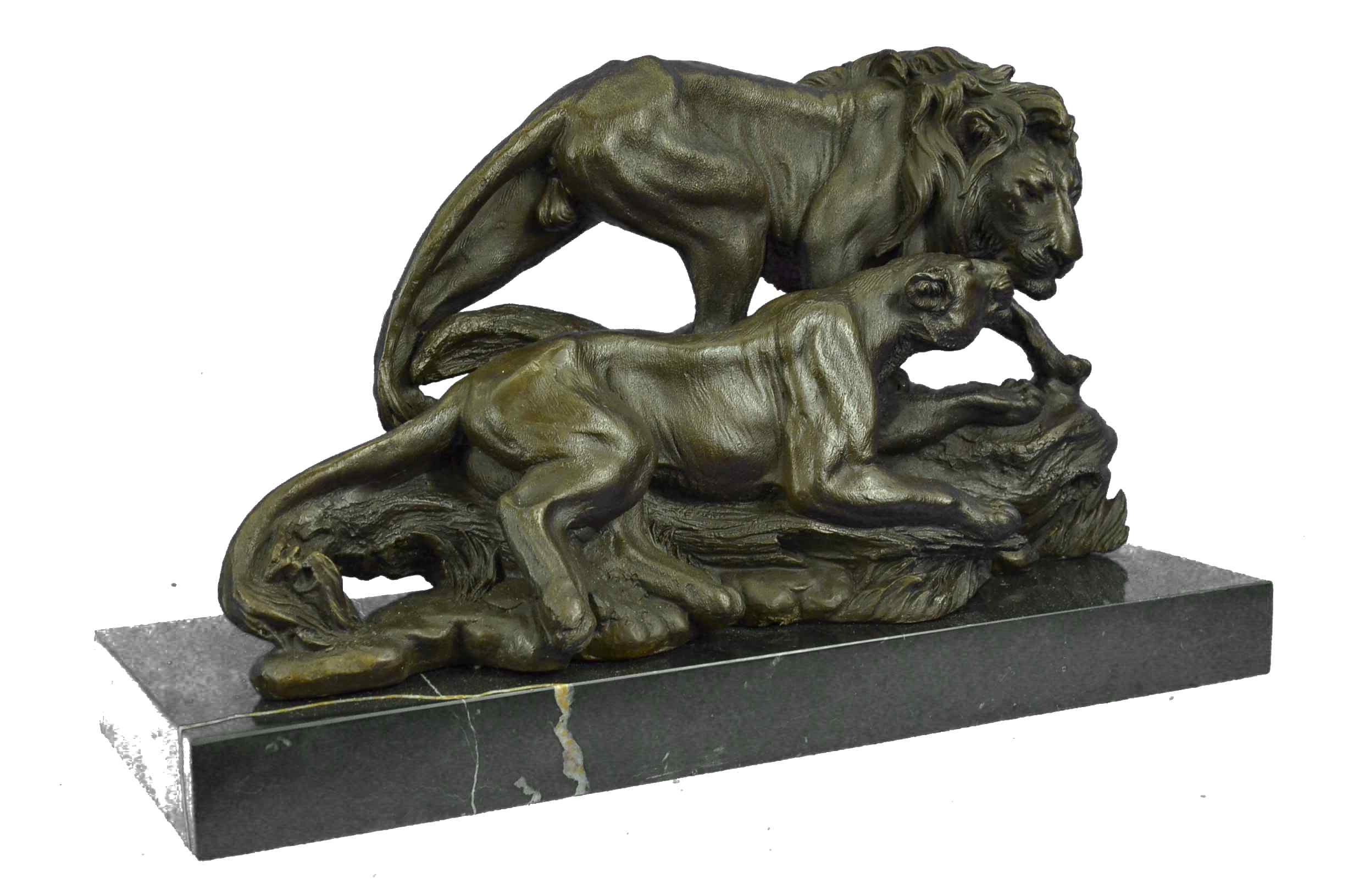 The male and female lion sit and lay on the open plains strewn with the gold light of the setting sun. In synchronicity, they stare out to something lost and then found in the mirage of the horizon. After curiosity leaves the cats, the female will resume cleaning her front paws as the male will go back to scenting the air in the dusk. Other than a symbol for strength, other symbolic attributes of the lion include courage, power, royalty, dignity, authority, dominion, justice, wisdom and ferocity. The handmade bronze sculpture was molded using the age-old method of lost-wax casting and stained with a brown patina finish for conservation. It is mounted upon a black marble base with the artist Barye`s signature.Original or Reproduction: Reproduction