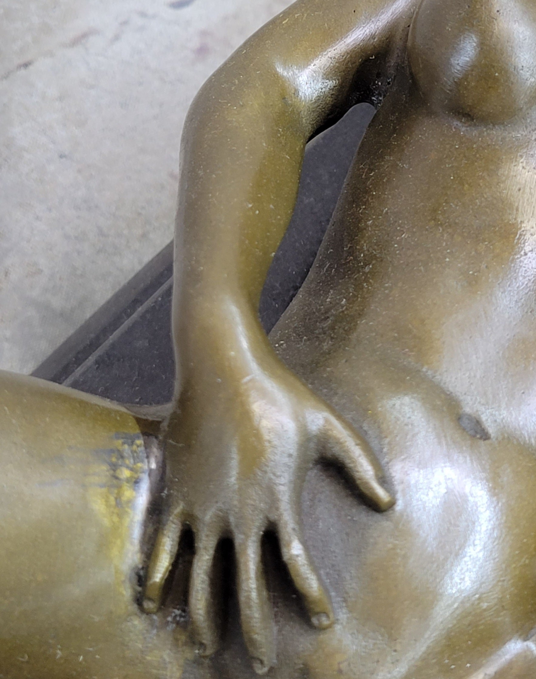 Indulge in the captivating allure of the bronze seductress, gracefully reclining on her side and enticing the viewer with a seductive gaze. With an inviting gesture, her hand beckons you to partake in her world of desire and gratification.