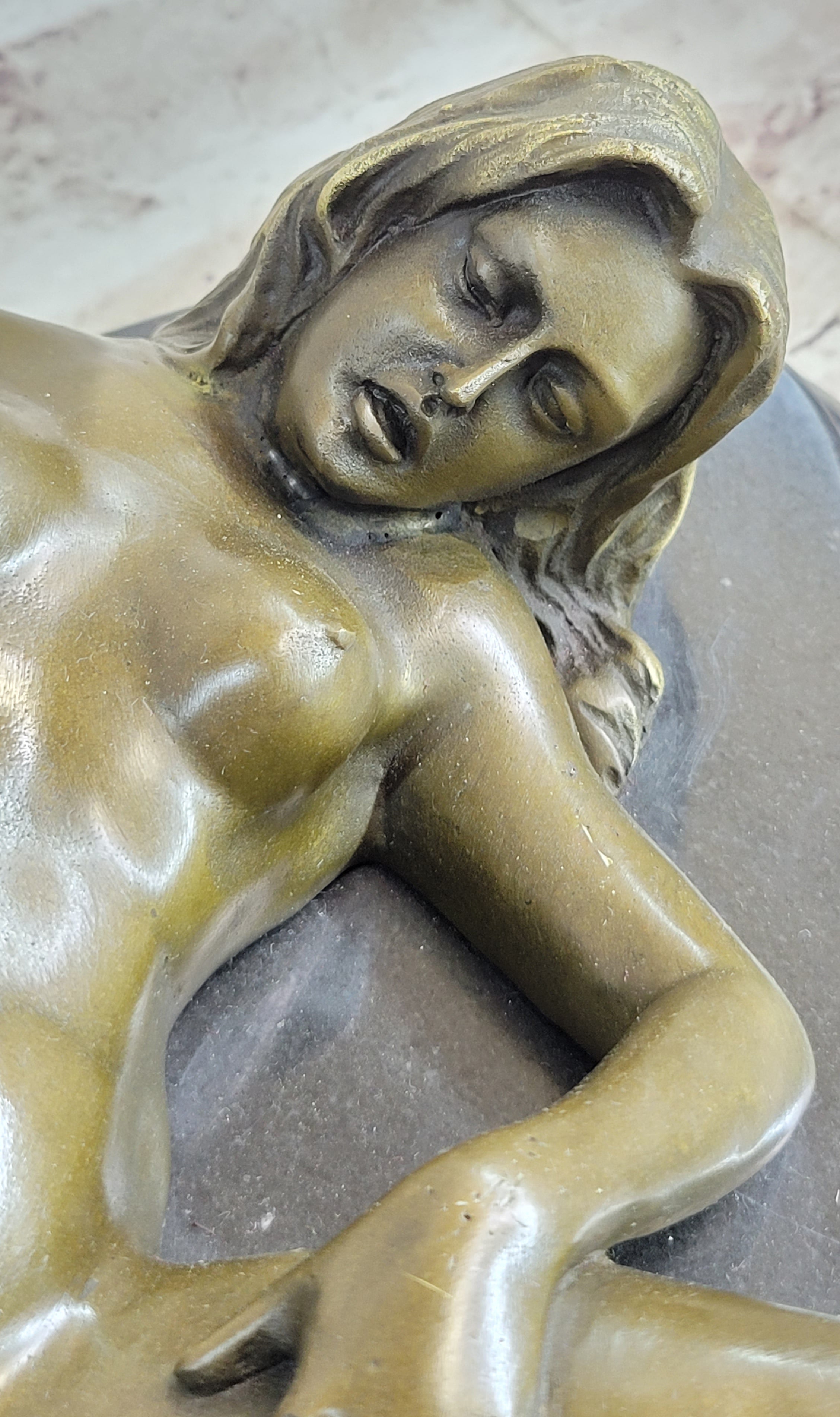 Allow yourself to be captivated by the allure of this exquisite bronze seductress, as she becomes a cherished centerpiece in your collection, an embodiment of desire and artistic expression.Bronze Dimensions with Marble Base: Height 7" X Width 13"