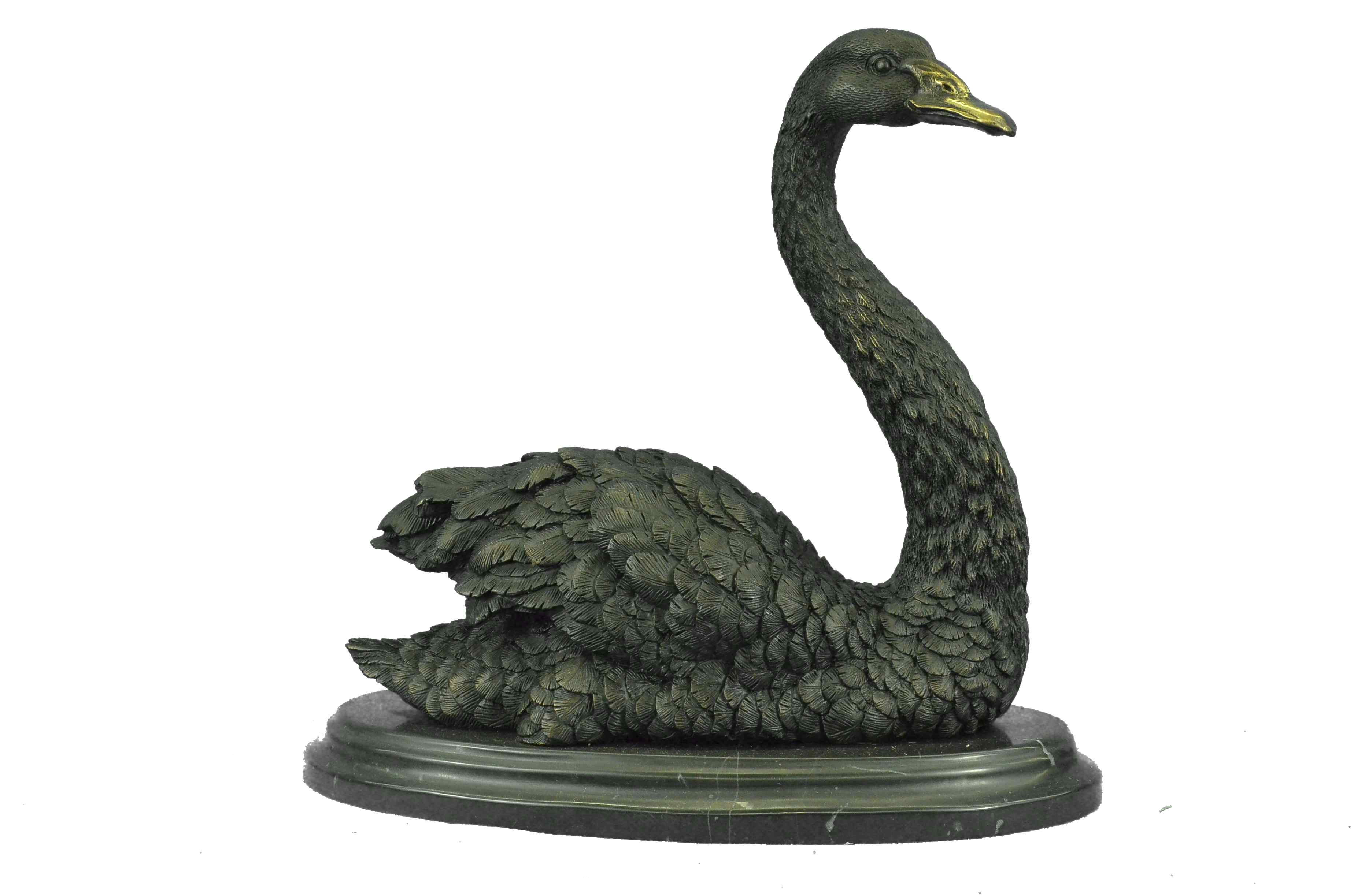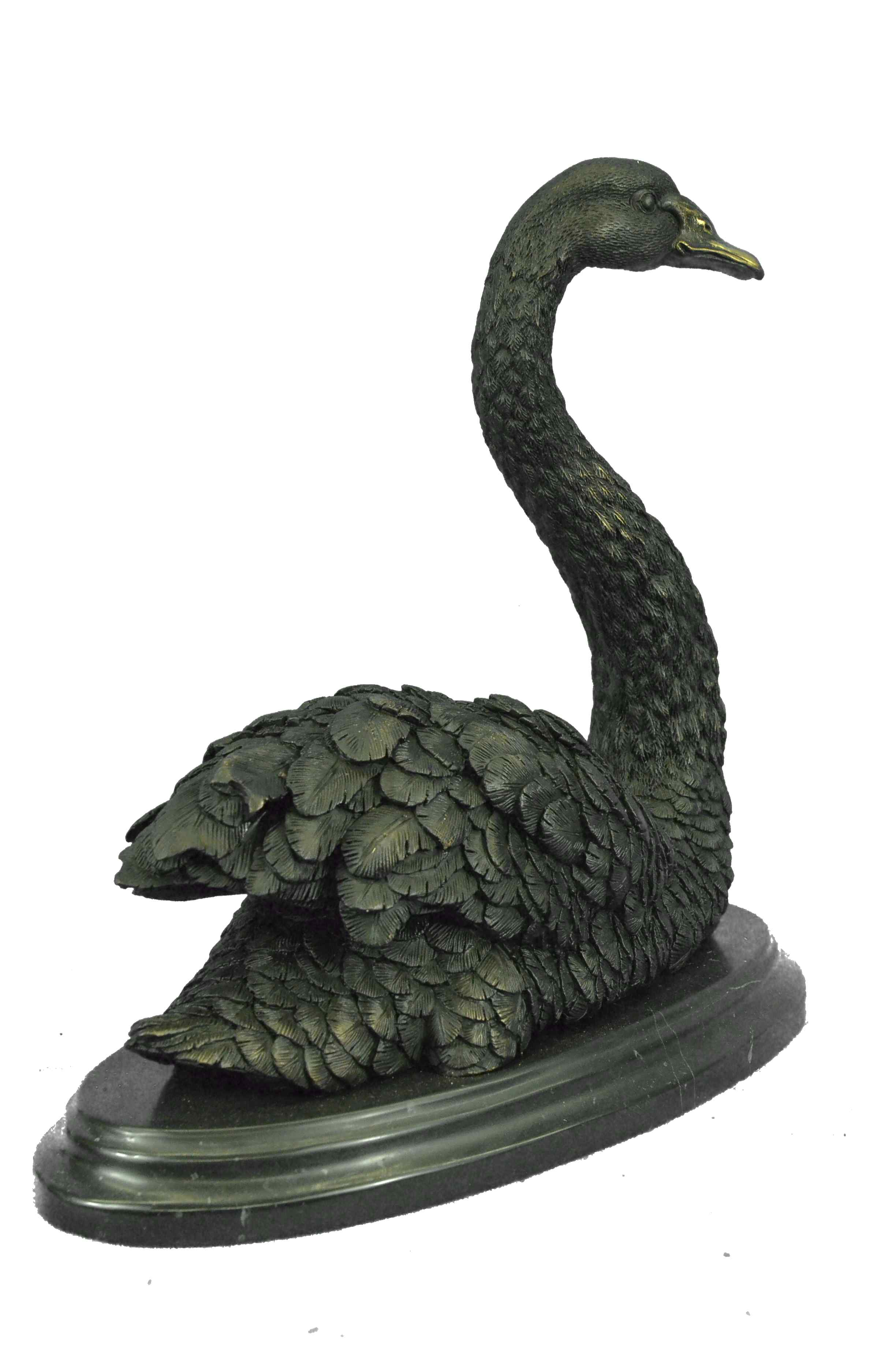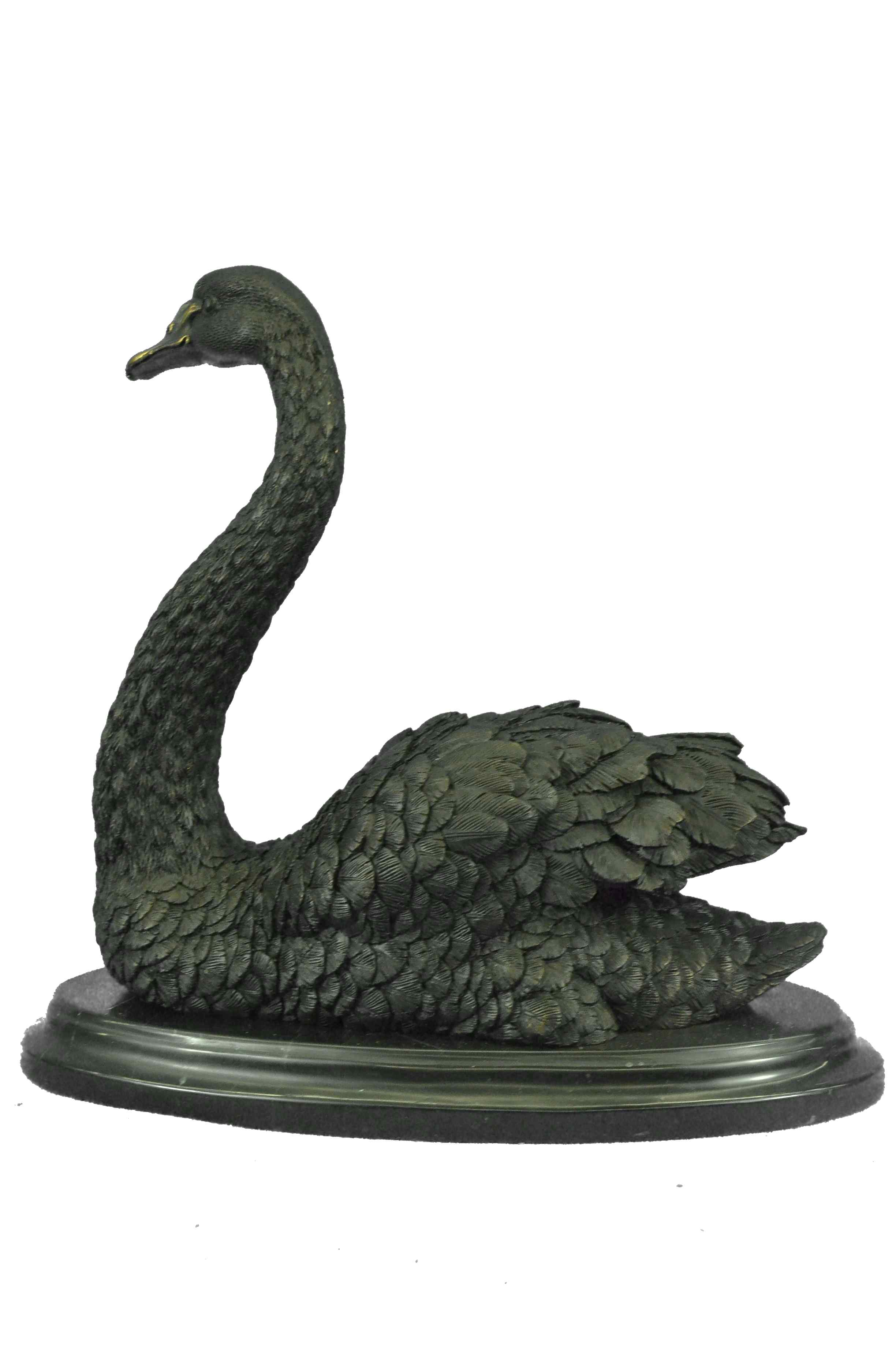 This is an amazing bronze casting of a beautiful swan. The feathers have been intricately created with the utmost detail. This representation features a swan with its feathers slightly fanned out, most likely wading in the water and looking off at something in the distance. For centuries, swans have symbolized grace and beauty on many levels. They are associated with love, music, and poetry. In Roman mythology Swan was sacred to Venus, the goddess of love. In Greek tradition, this bird was often pictured singing to a lyre. Swans are often a symbol of love or fidelity because of their long-lasting monogamous relationships. Swans also feature strongly in mythology. Today, swans are used symbolically or as brands. At any rate, nobody can deny the beauty of these majestic creatures. This piece is a must-have that will surely be treasured for years to come, featuring the lost wax method of casting, founded thousands of years ago ensuring an exquisitely detailed sculpture that will add grace and beauty to your business or home . Get one for the animal lover in your life!Bronze Dimensions with Marble Base:Height 12 1/2" x Width 14"