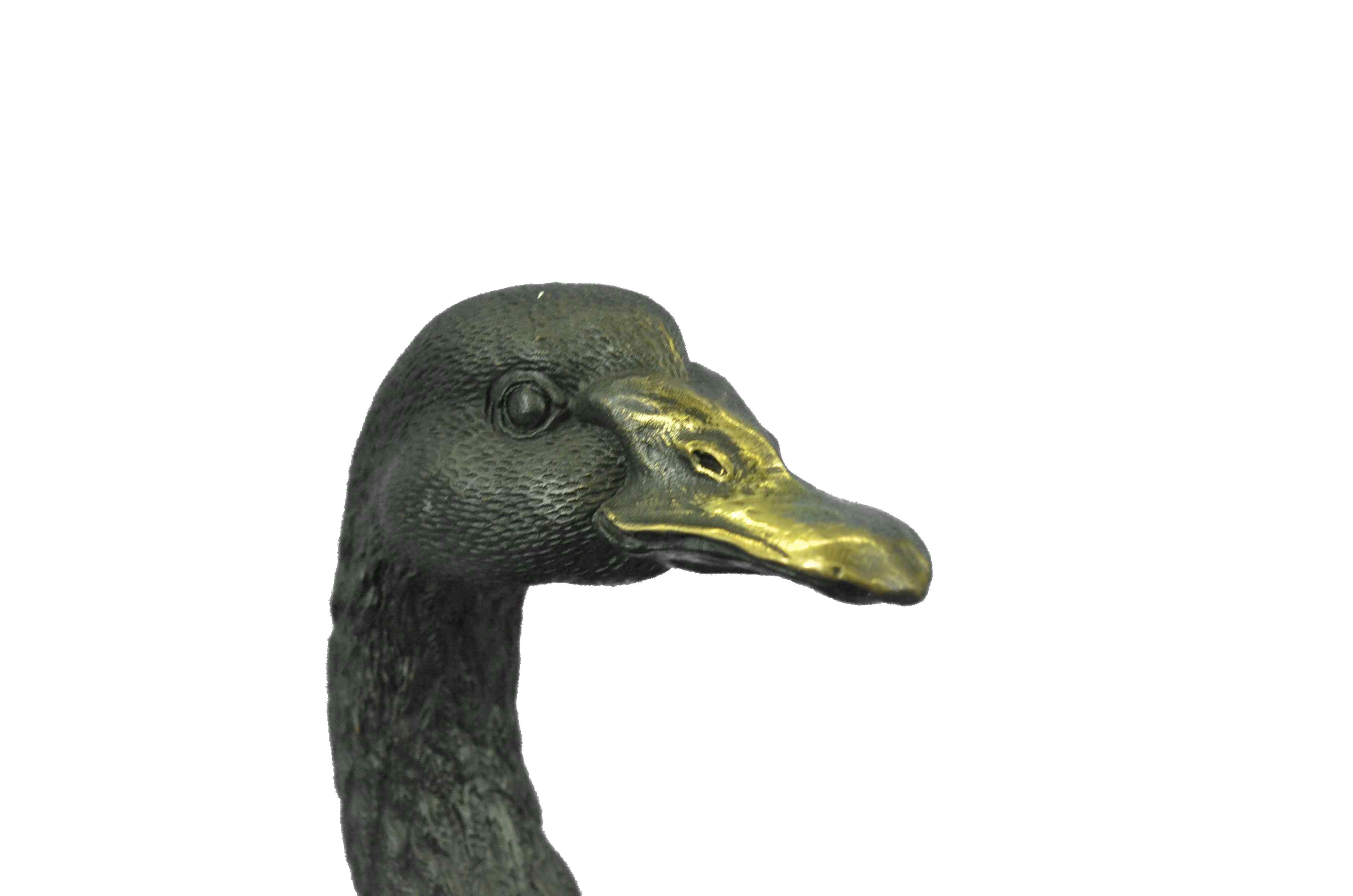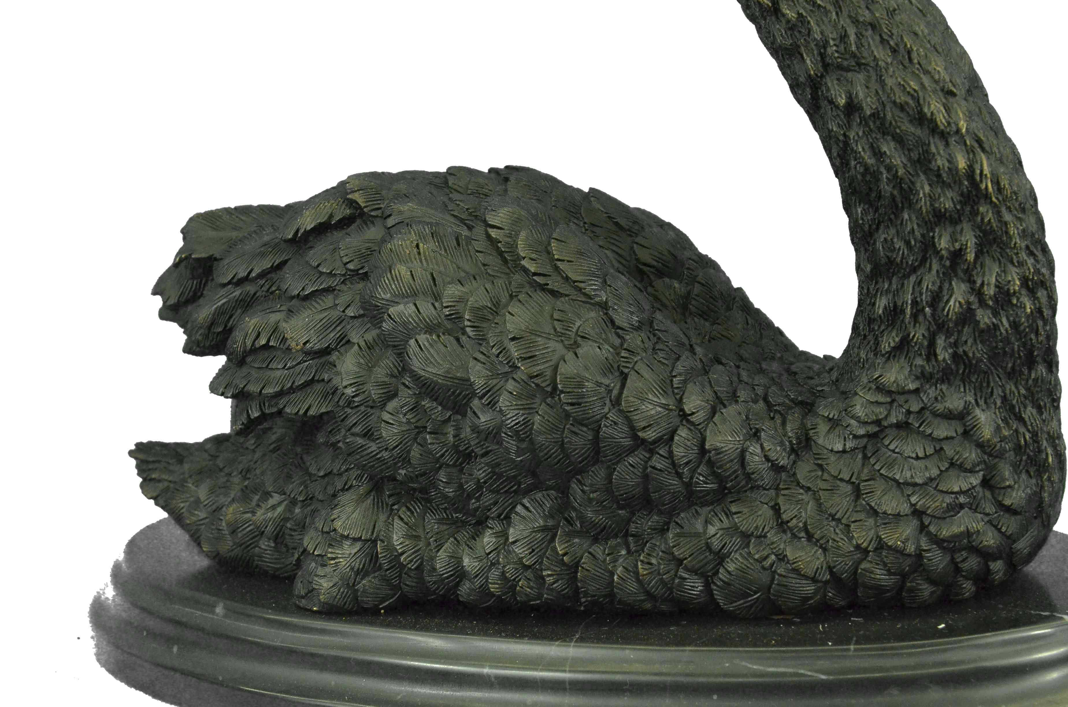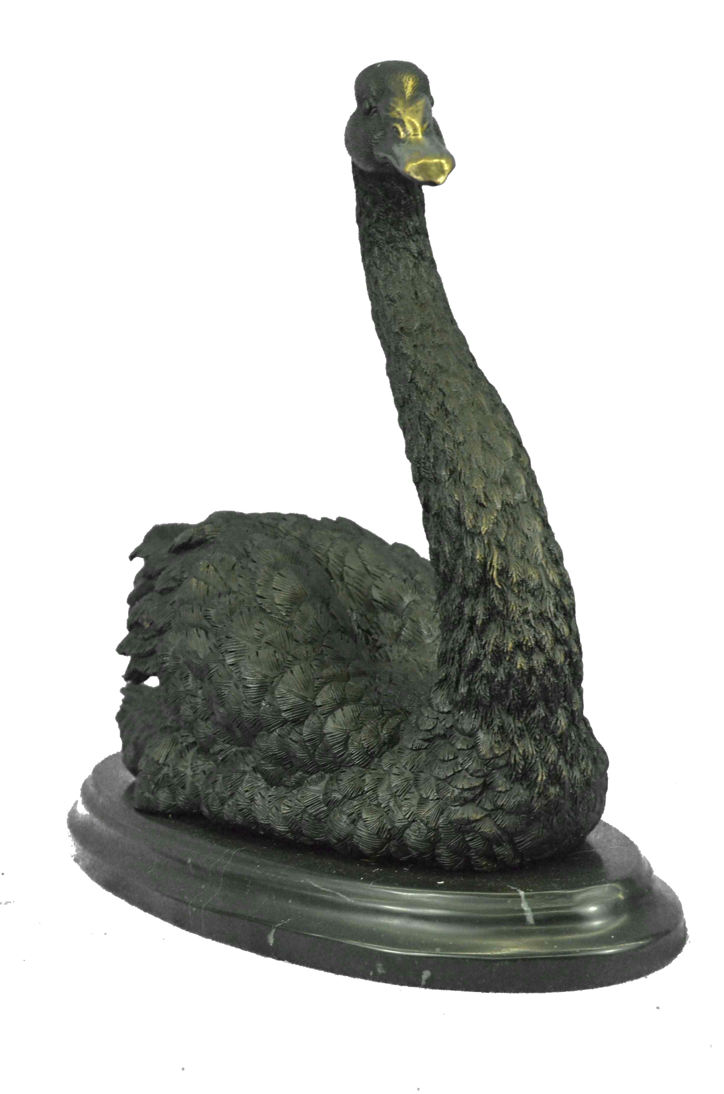 This is an amazing bronze casting of a beautiful swan. The feathers have been intricately created with the utmost detail. This representation features a swan with its feathers slightly fanned out, most likely wading in the water and looking off at something in the distance. For centuries, swans have symbolized grace and beauty on many levels. They are associated with love, music, and poetry. In Roman mythology Swan was sacred to Venus, the goddess of love. In Greek tradition, this bird was often pictured singing to a lyre. Swans are often a symbol of love or fidelity because of their long-lasting monogamous relationships. Swans also feature strongly in mythology. Today, swans are used symbolically or as brands. At any rate, nobody can deny the beauty of these majestic creatures. This piece is a must-have that will surely be treasured for years to come, featuring the lost wax method of casting, founded thousands of years ago ensuring an exquisitely detailed sculpture that will add grace and beauty to your business or home . Get one for the animal lover in your life!Bronze Dimensions with Marble Base:Height 12 1/2" x Width 14"