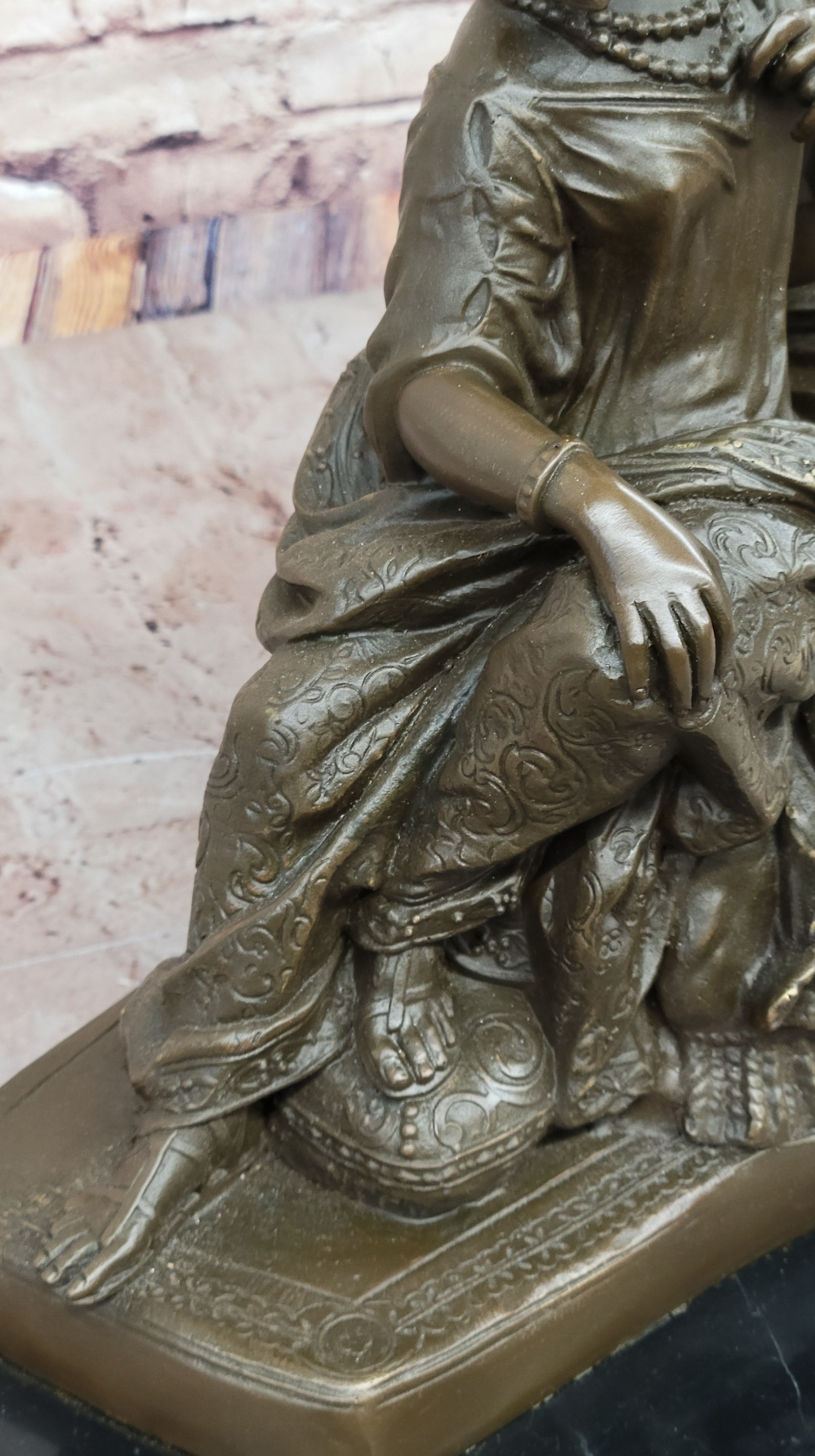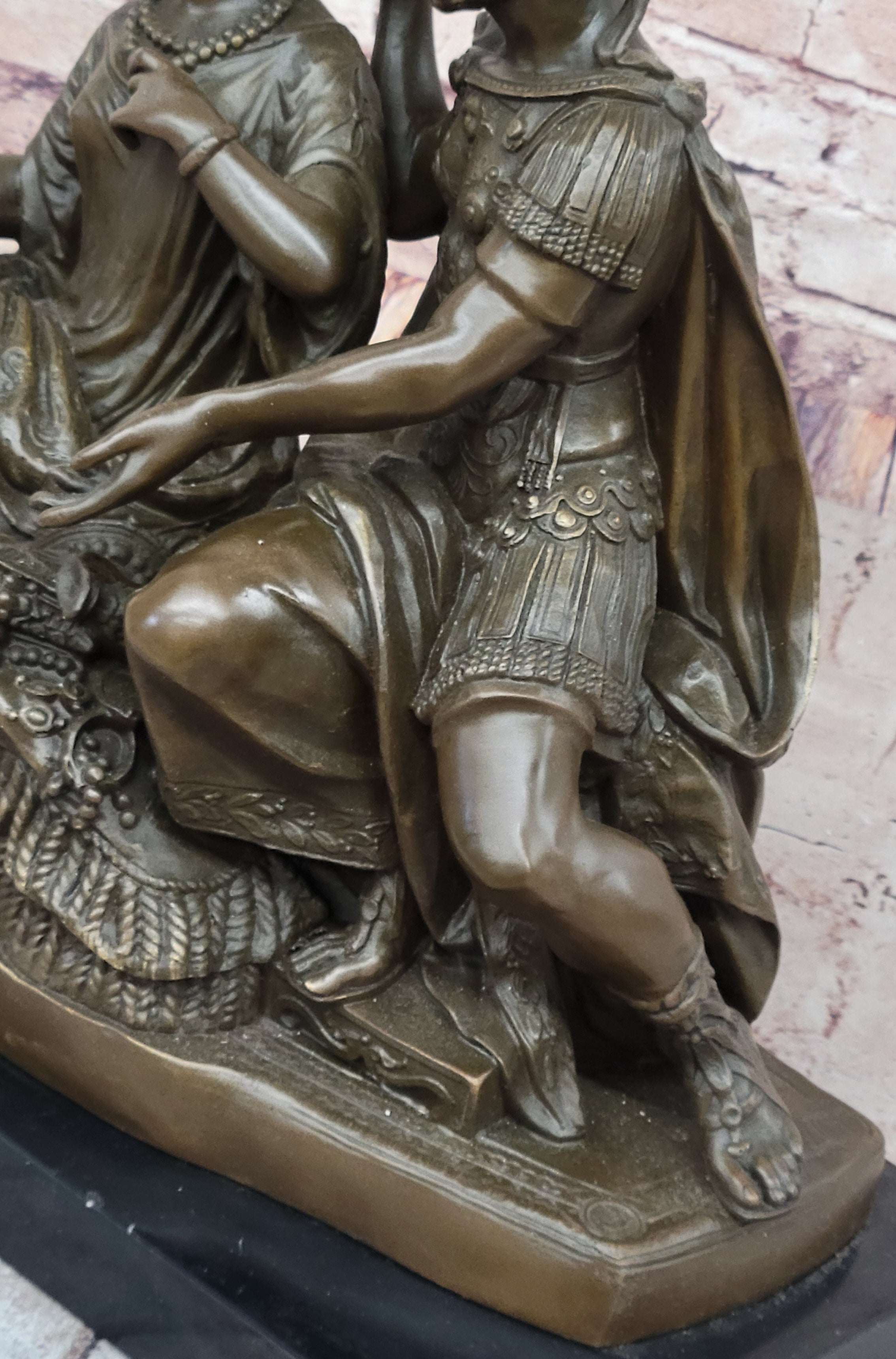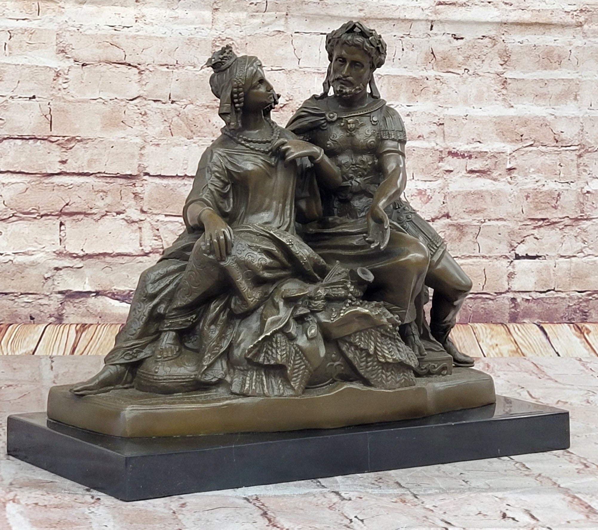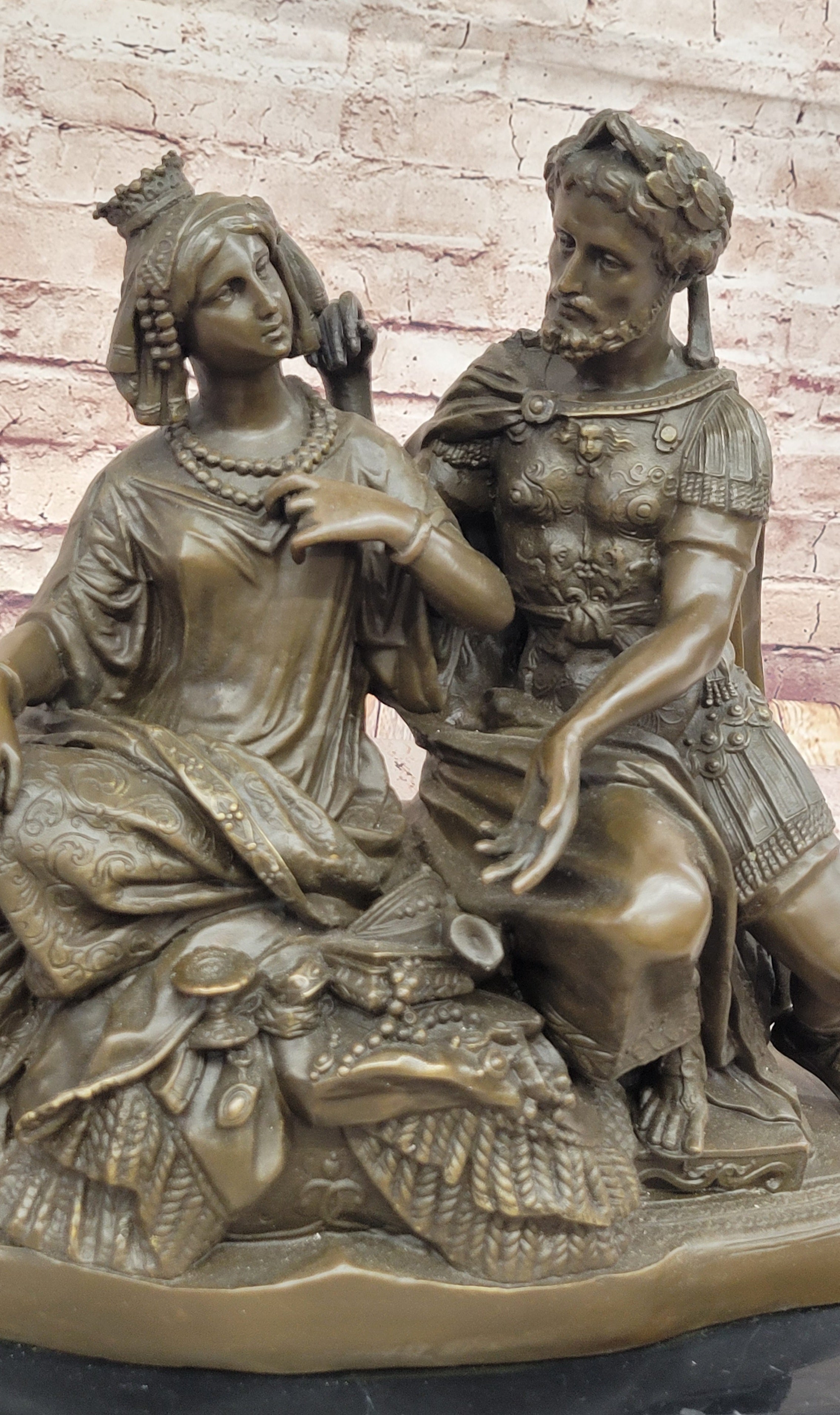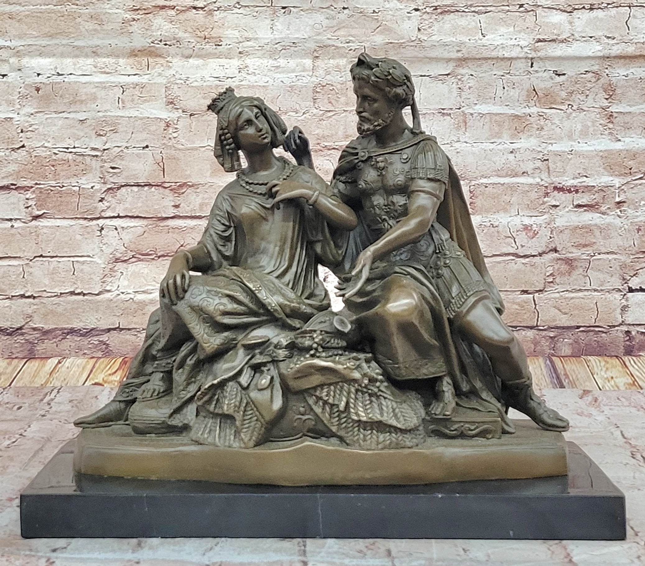 The craftsmanship is nothing short of exceptional. Every element, from Cleopatra’s regal headdress to Antony’s Roman armor, is rendered with meticulous detail. Their garments ripple with texture and pattern, while the ornamented base enhances the sculpture's opulence and visual depth. The warm brown patina gives the piece a classical aura, while the dynamic composition adds both energy and balance. This is not just a sculpture—it is a narrative in bronze, steeped in drama and history.