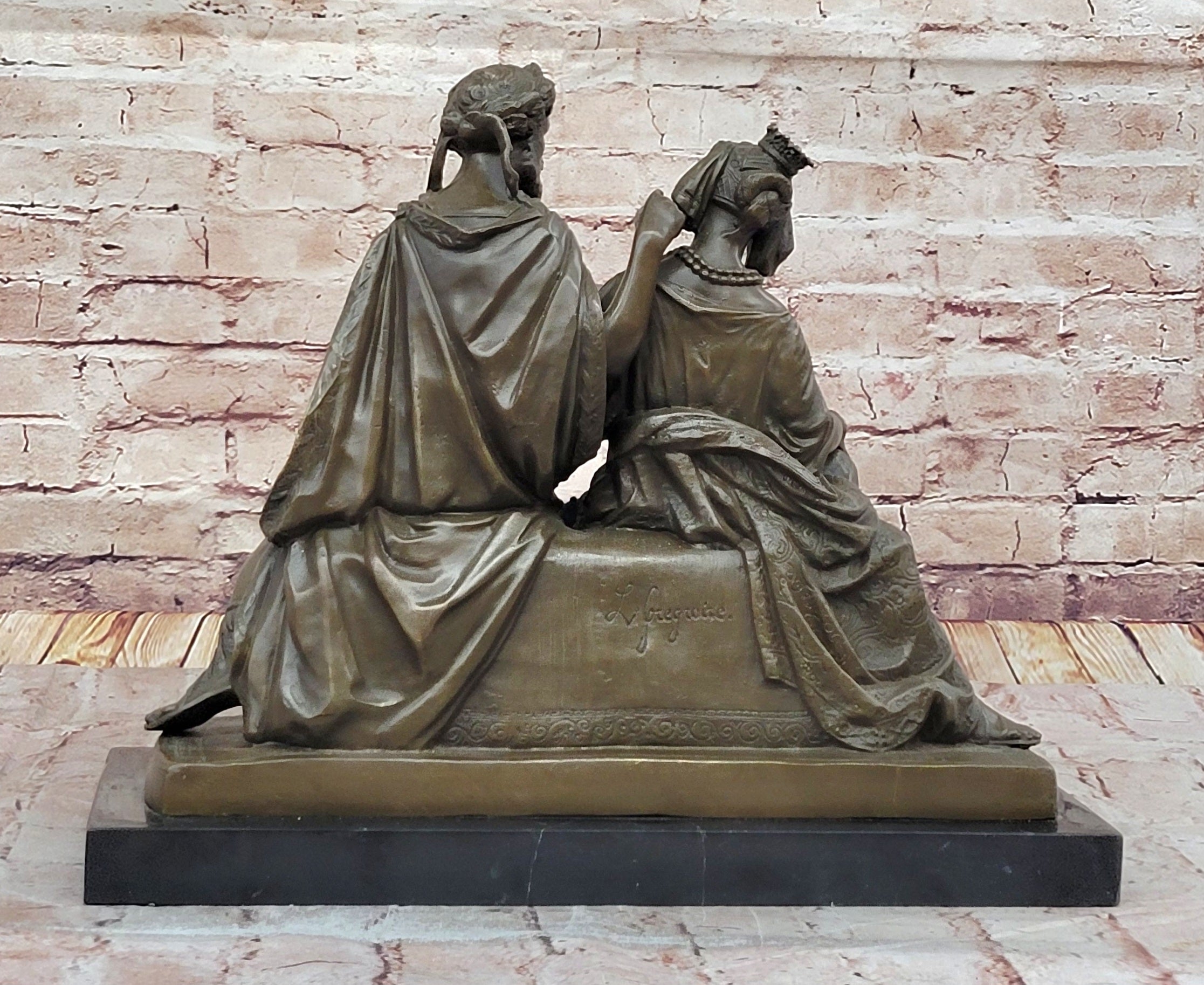Experience the timeless romance and political intrigue of ancient history with this superb bronze sculpture depicting the legendary figures Cleopatra and Mark Antony. Captured in a moment of poised intimacy and authority, the pair exude power, elegance, and charisma. Their entwined legacy as lovers and rulers of two great civilizations is brought vividly to life through this artwork, which tells a story of love, ambition, and destiny. The sculpture is signed by the artist Leon Grégoire, a mark of both authenticity and artistic refinement.