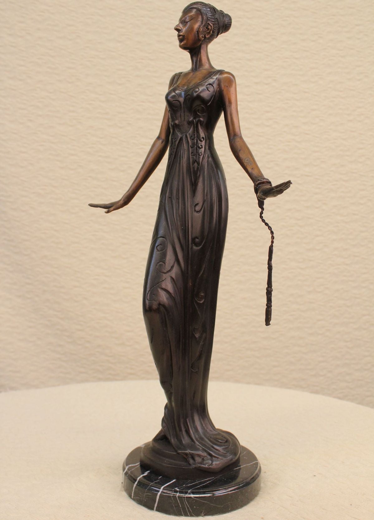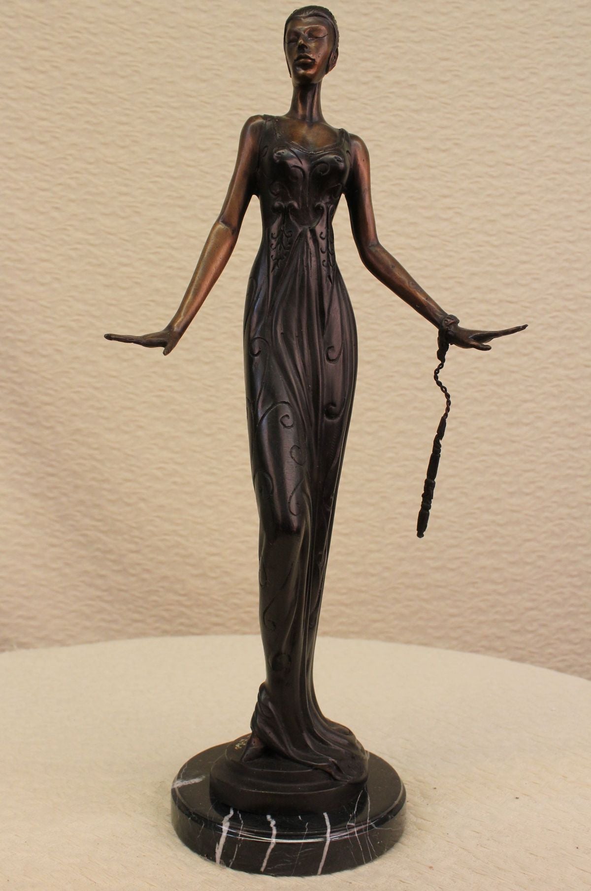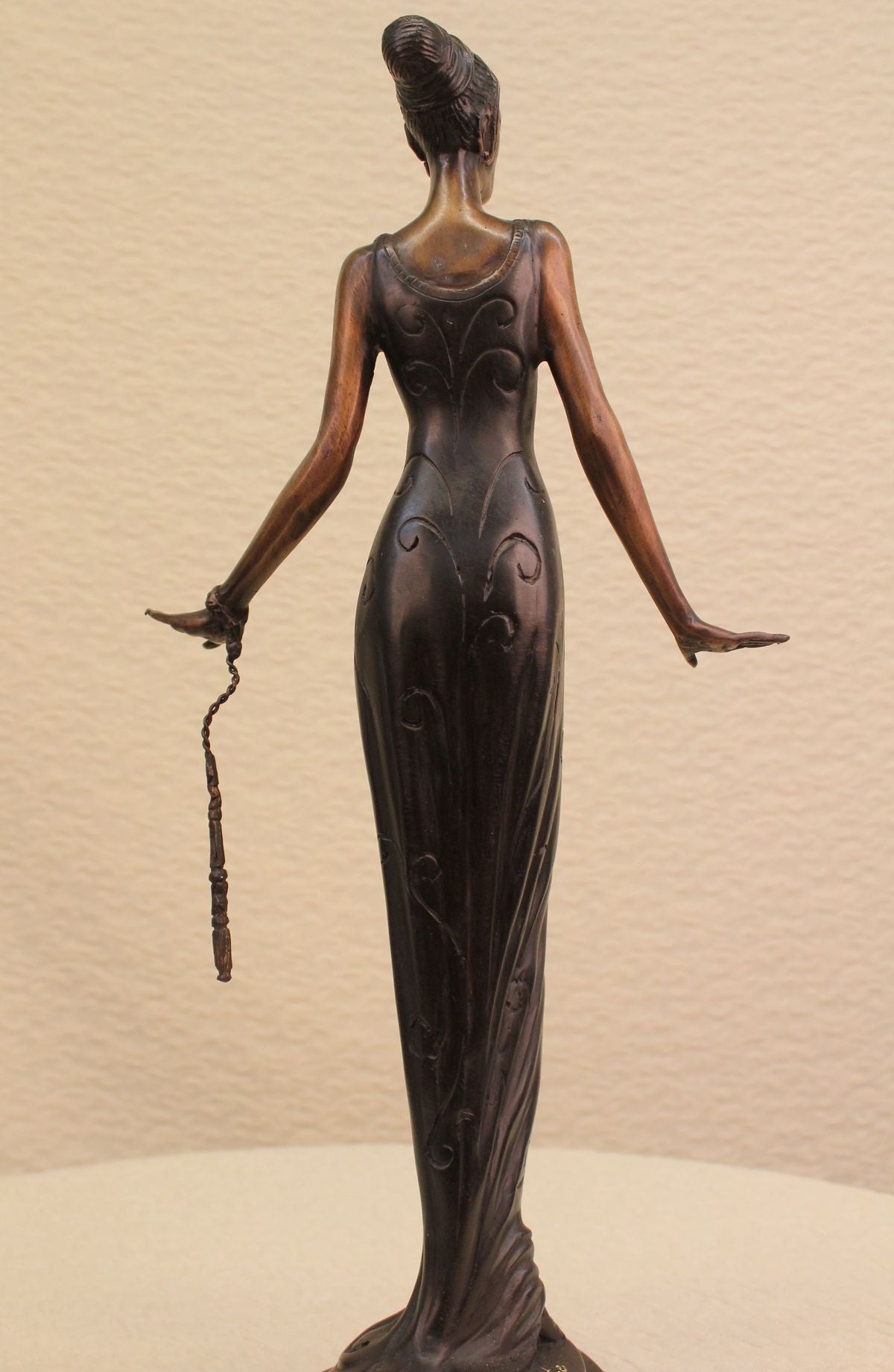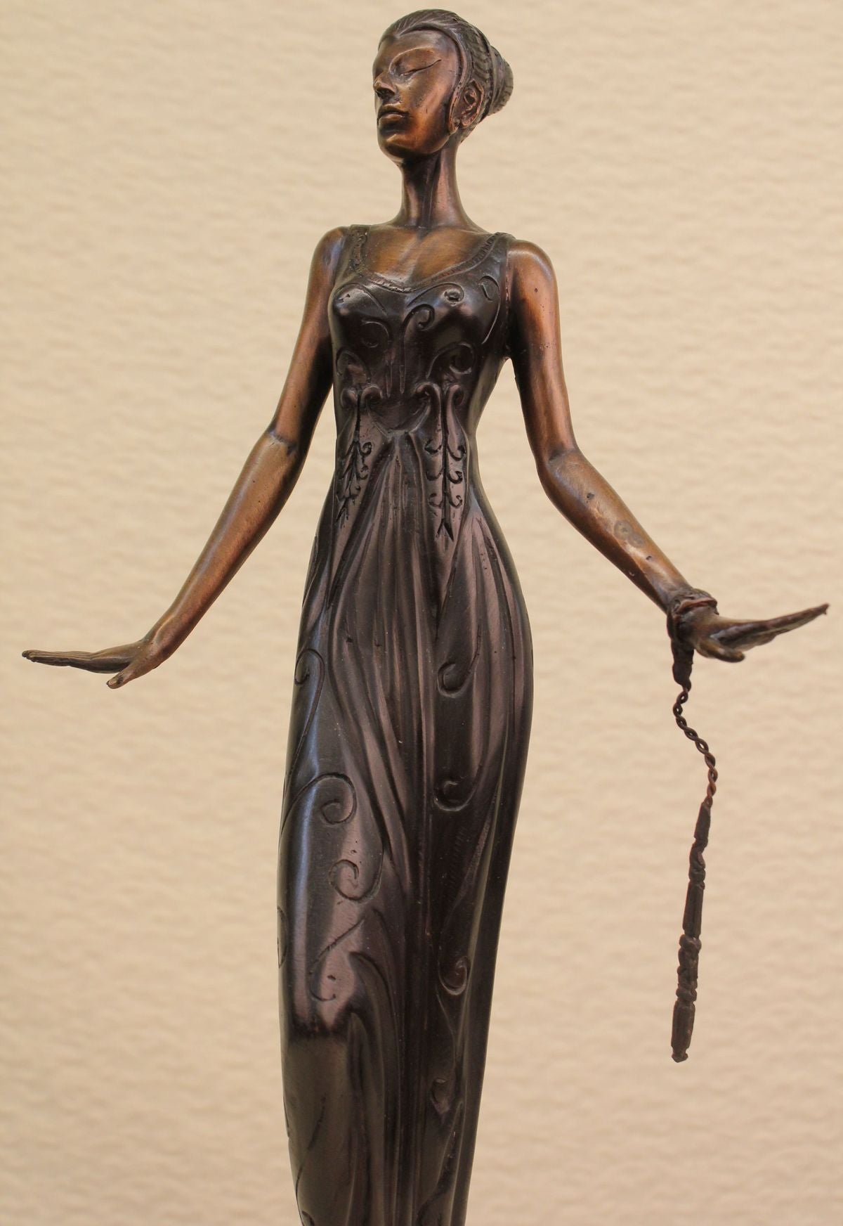 She is most certainly not another brick in the wall, but here to define herself as a timeless individual. She stands tall with impeccable posture, draped in a delicate, defined dress, with a detailed, matching head piece. The tail of her dress gently swarms the surrounding area by her feet, which are covered by sophisticated heels to put the finishing touches on her effeminate appearance. Her strong, yet delicate hands have the power to halt any man who dare think he is worthy of entering her presence, along with the calm, blank stare in her face which defines her serious demeanor. The statue is made completely of lost wax, with a crisp patina texture, placed upon sleek marble base.Original or Reproduction: Reproduction